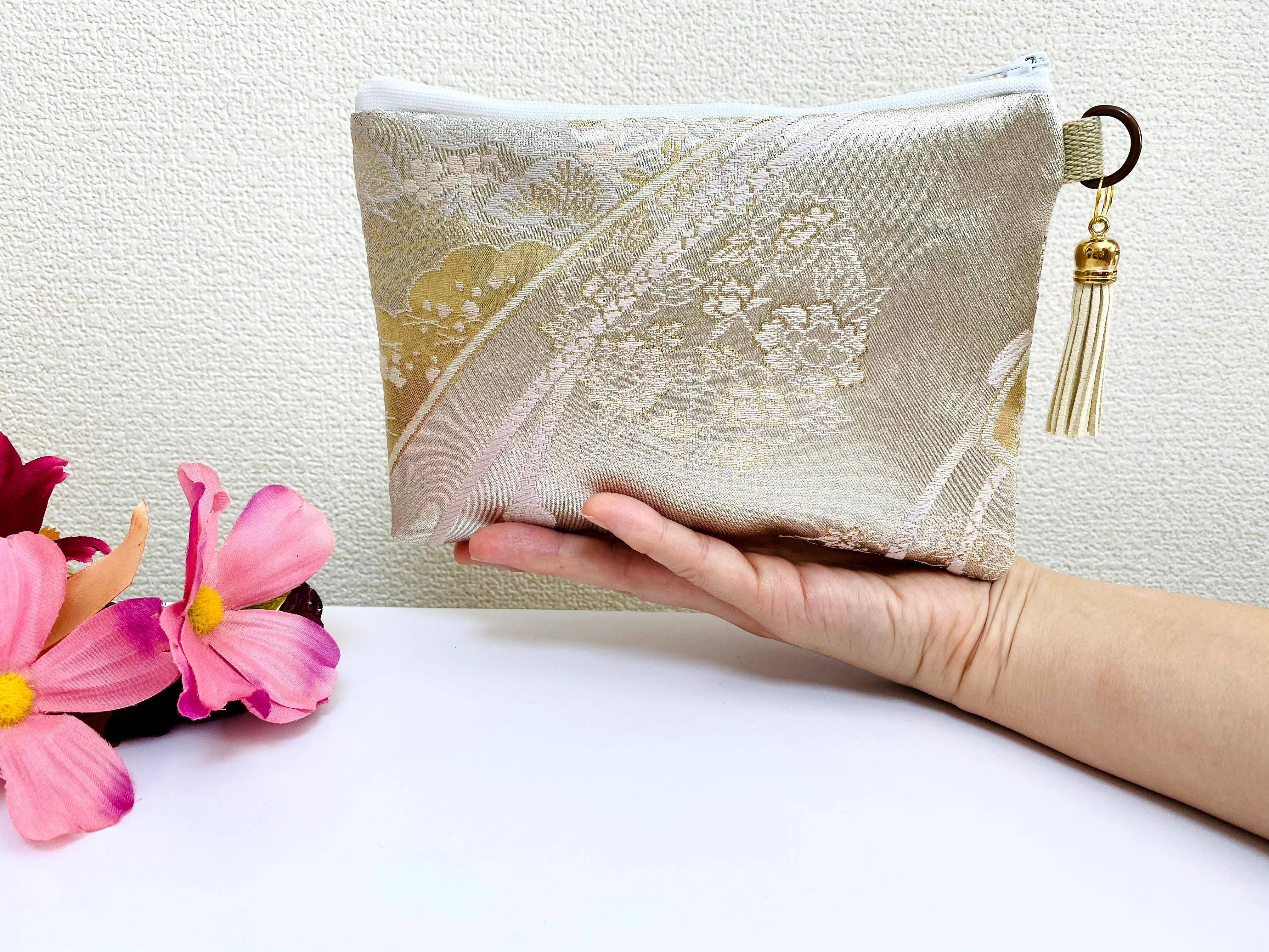 日本の古帯をリメイクして作製したポーチでハンドメイド品です。正絹の帯生地を使用です。