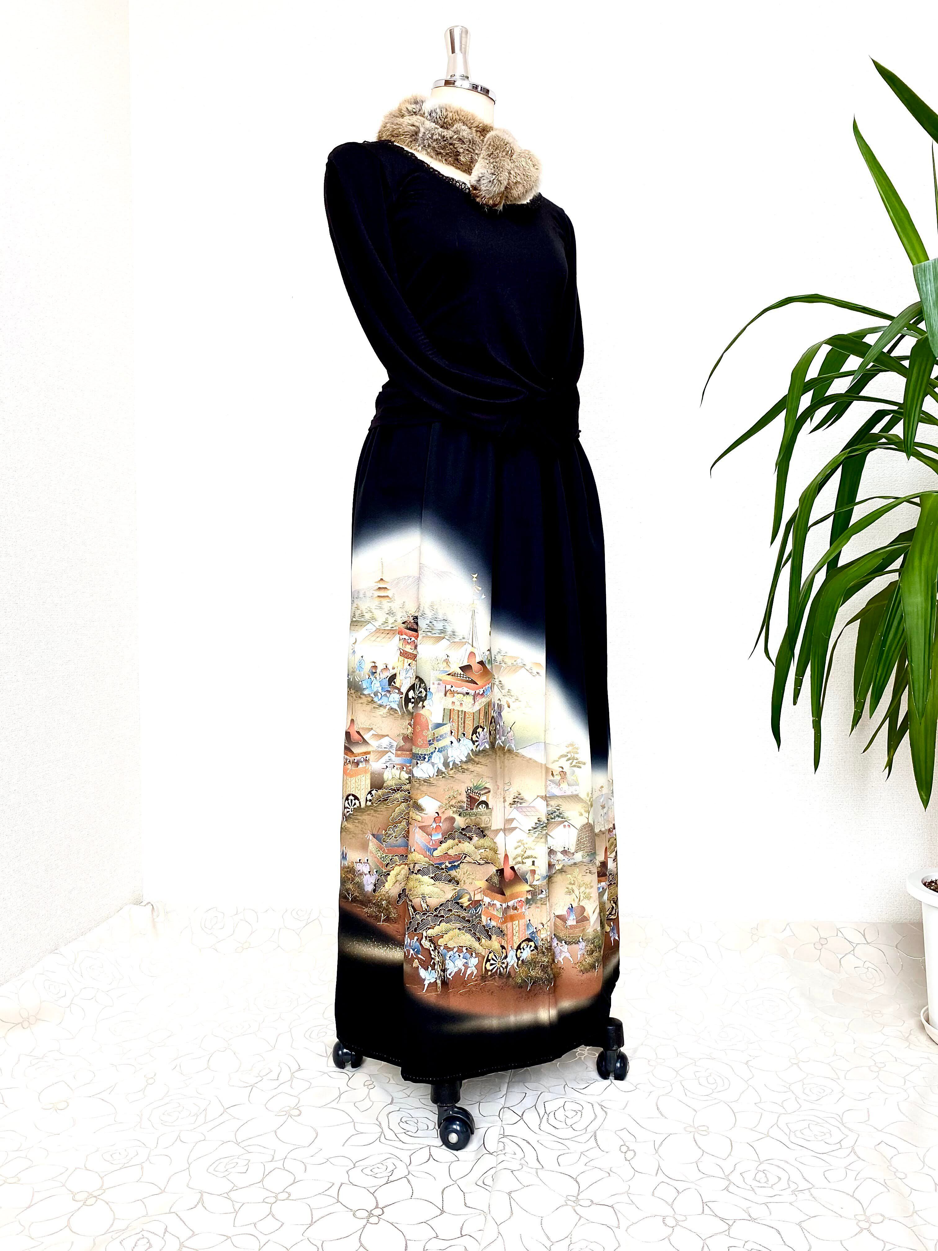 黒留袖着物リメイクウエストゴムギャザードレススカートフリーサイズ