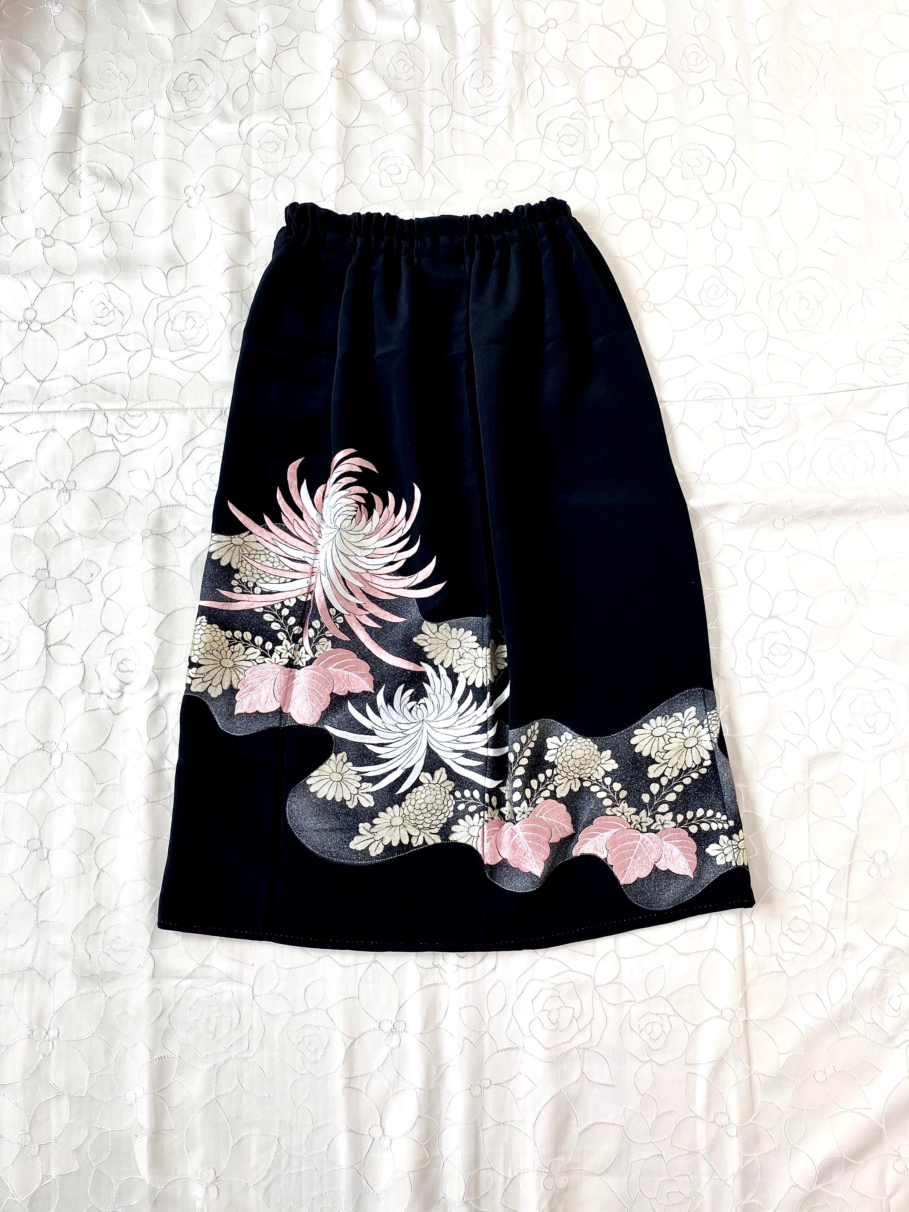 黒留袖着物をリメイクして作製したウエストゴムギャザードレススカート【訳あり】フリーサイズです。