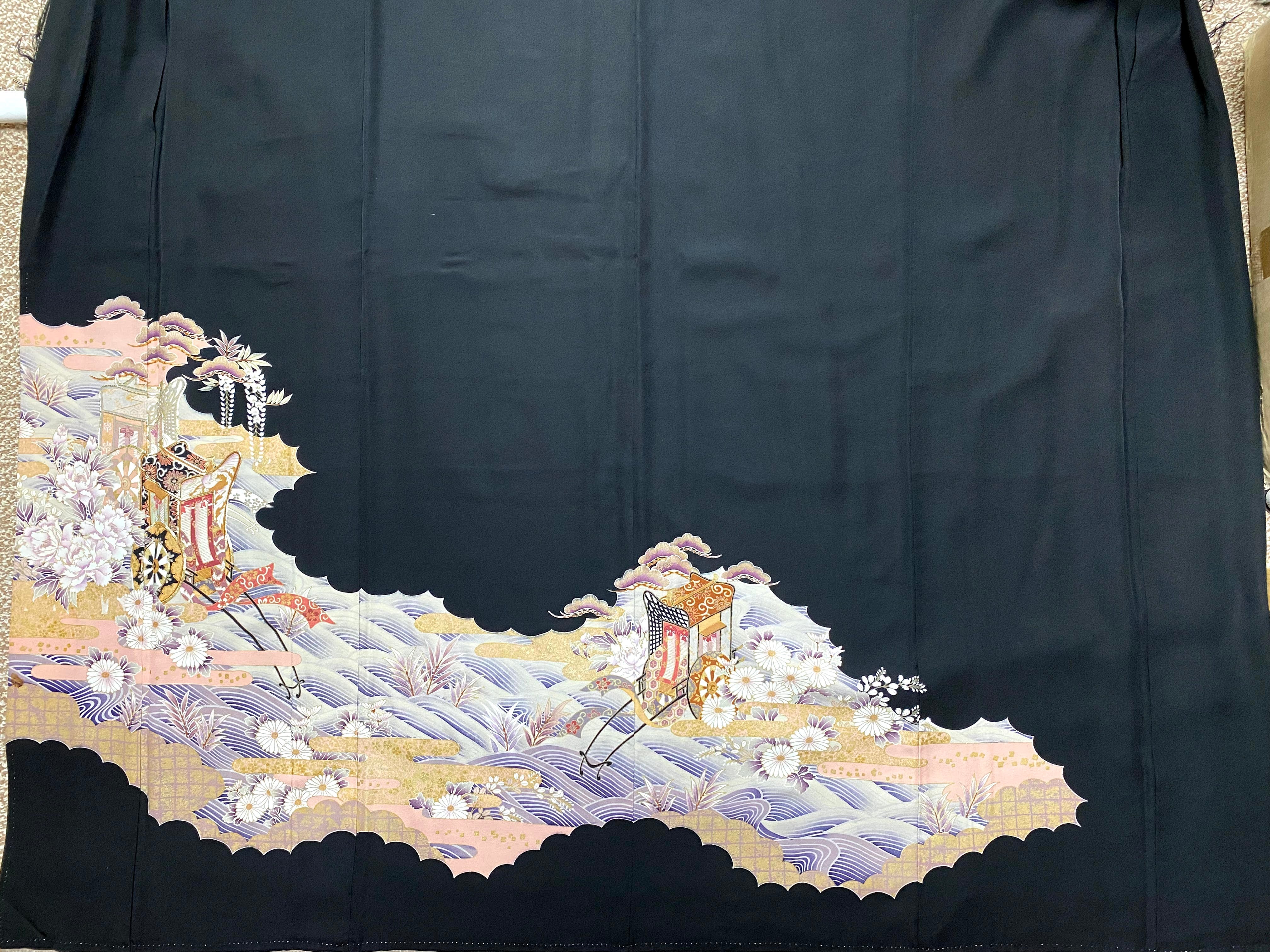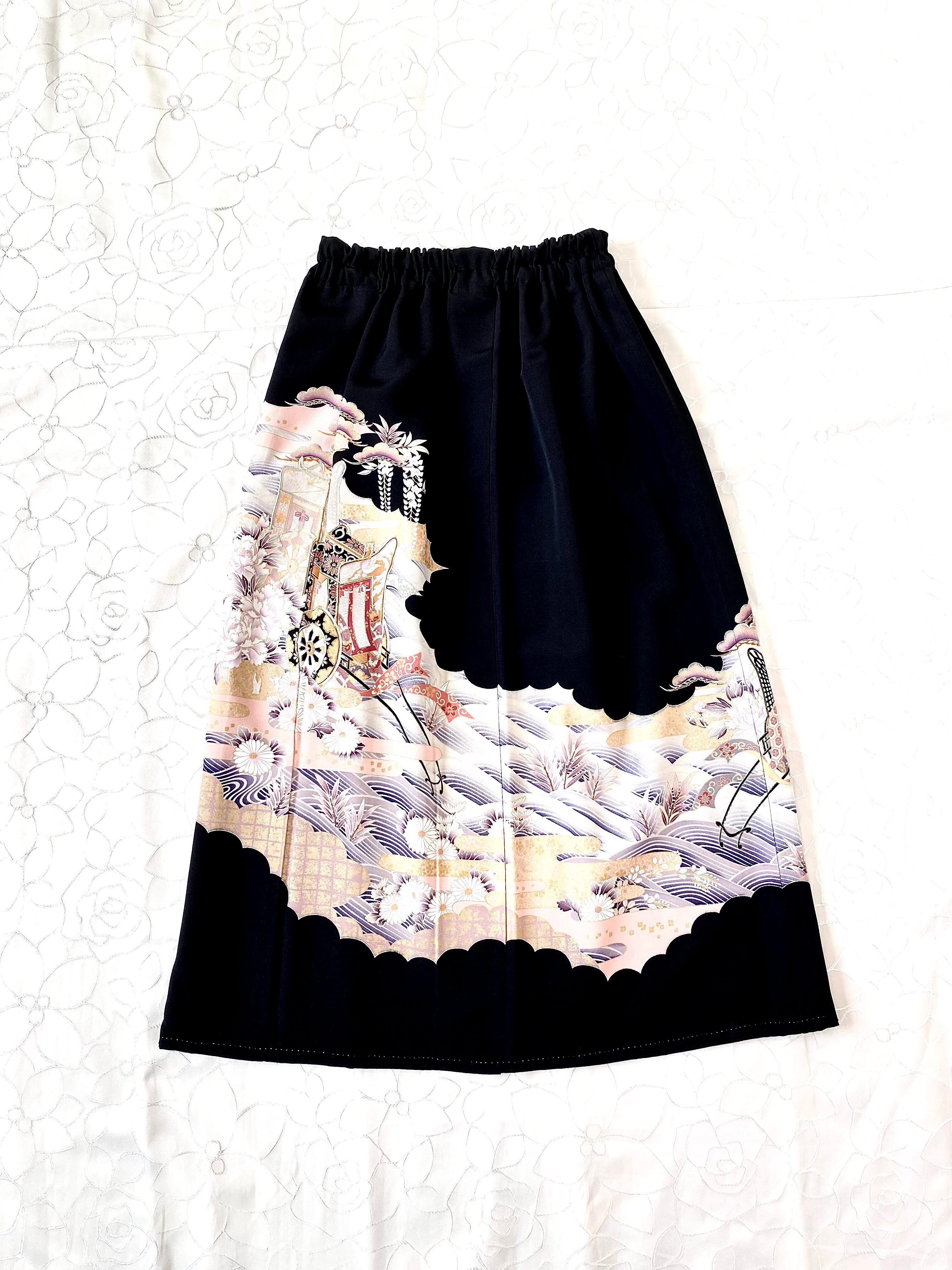 黒留袖着物リメイクウエストゴムスカート送料無料フリーサイズ1点物黒留袖着物リメイクウエストゴムギャザースカートハンドメイド黒留袖着物リメイクスカート1点物NO.501