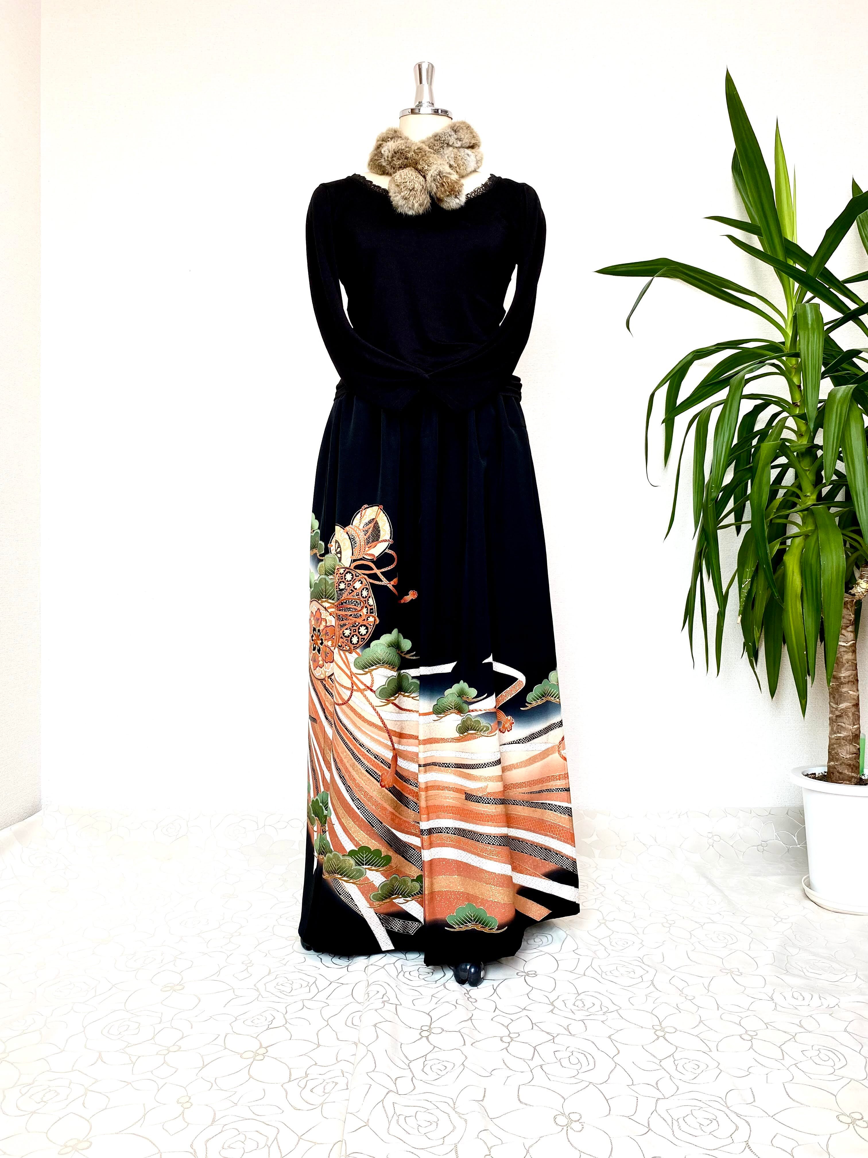 黒留袖着物リメイクウエストゴムスカート【超ロング丈】送料無料フリーサイズ1点物黒留袖着物リメイクウエストゴムギャザースカート【超ロング丈】ハンドメイド黒留袖着物リメイクスカート1点物NO.554