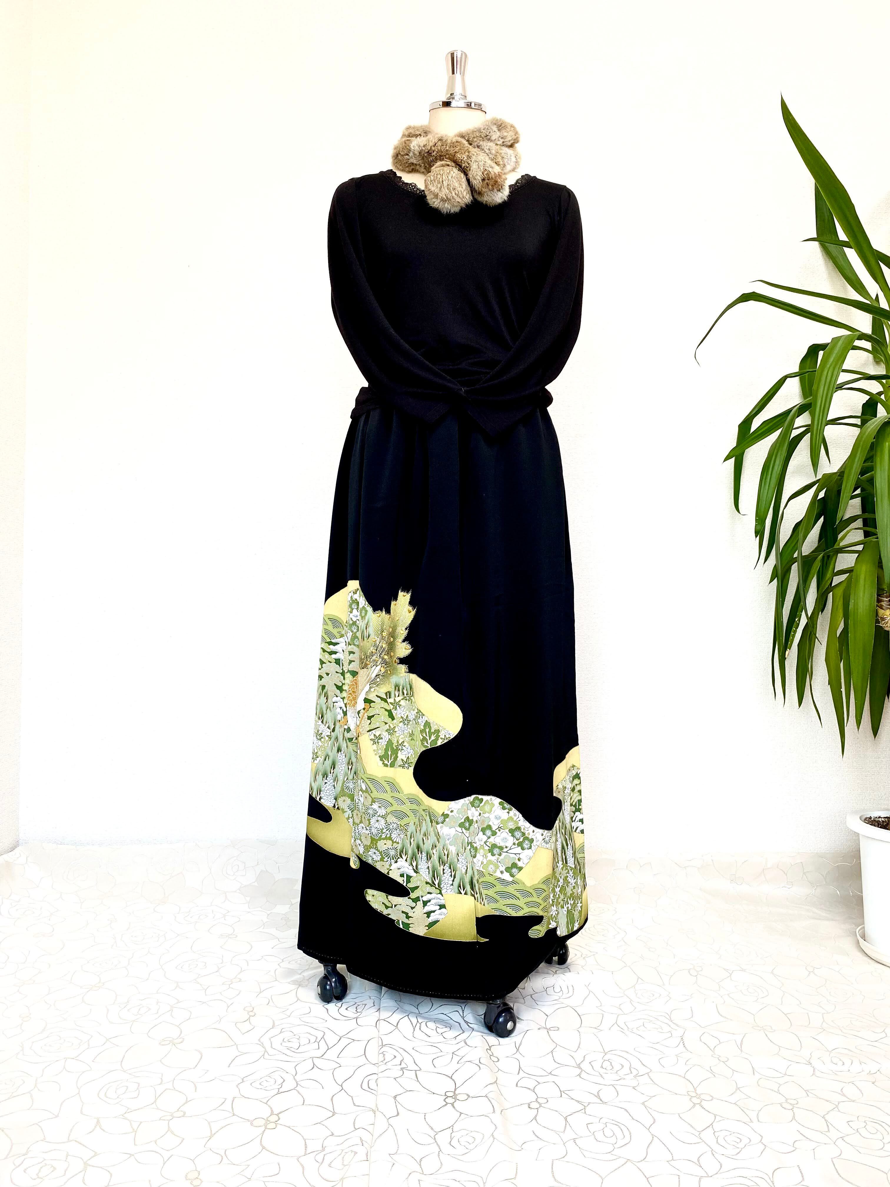 黒留袖着物リメイクウエストゴムギャザードレススカートフリーサイズ【超ロング丈】