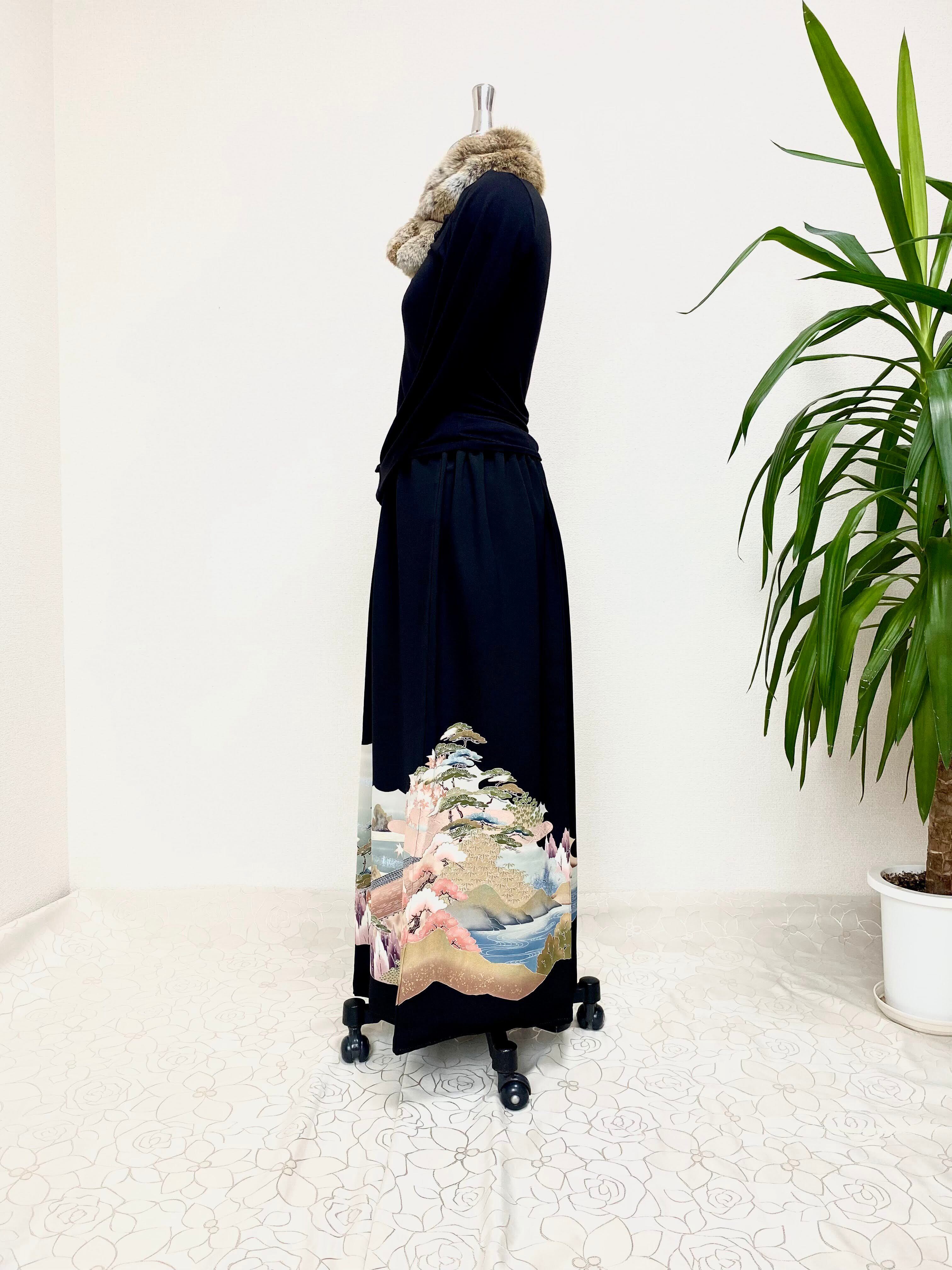 黒留袖着物リメイクウエストゴムギャザードレススカートフリーサイズ
