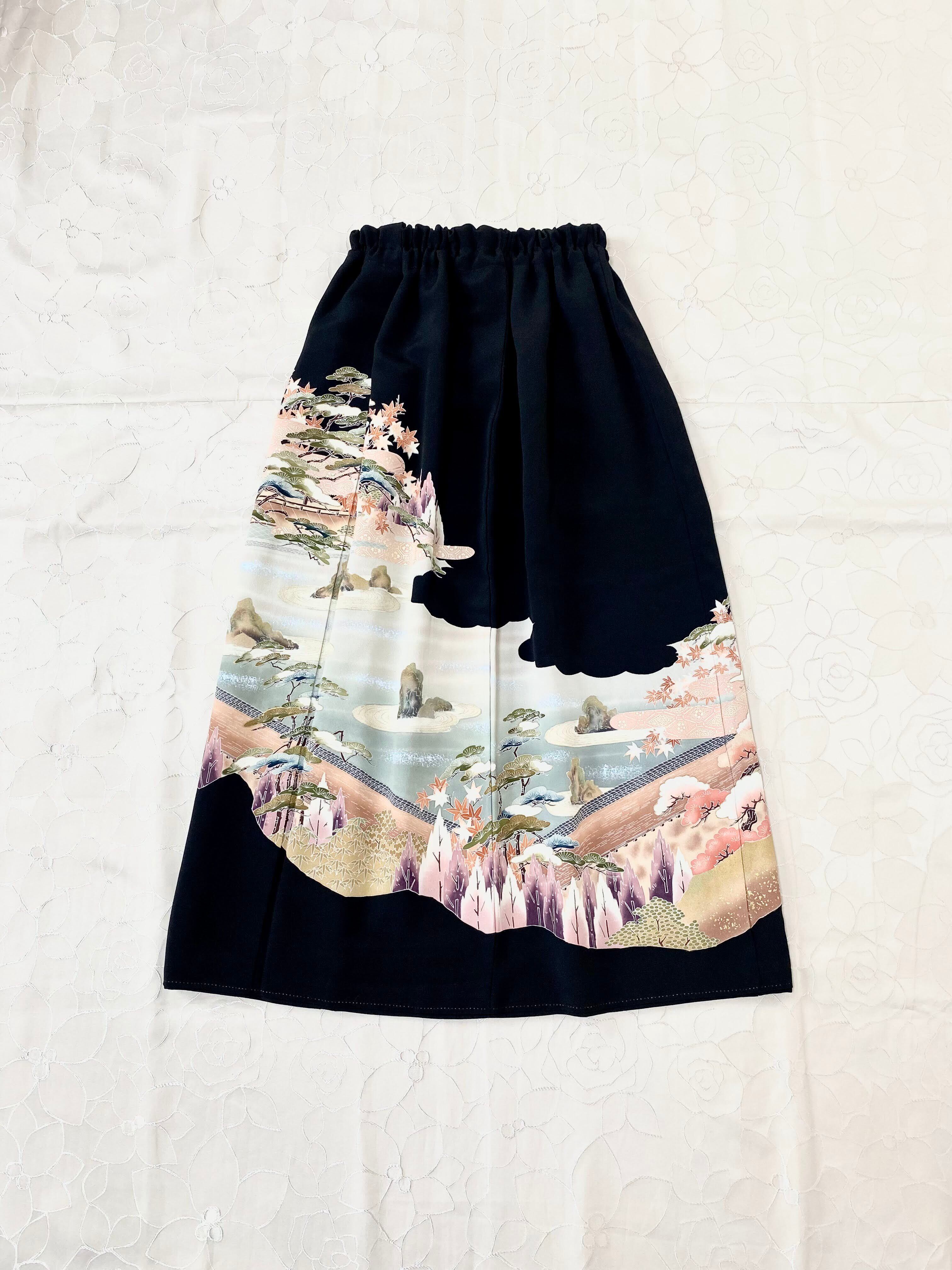 黒留袖着物リメイクウエストゴムスカート送料無料フリーサイズ1点物黒留袖着物リメイクウエストゴムギャザースカートハンドメイド黒留袖着物リメイクスカート1点物NO.568