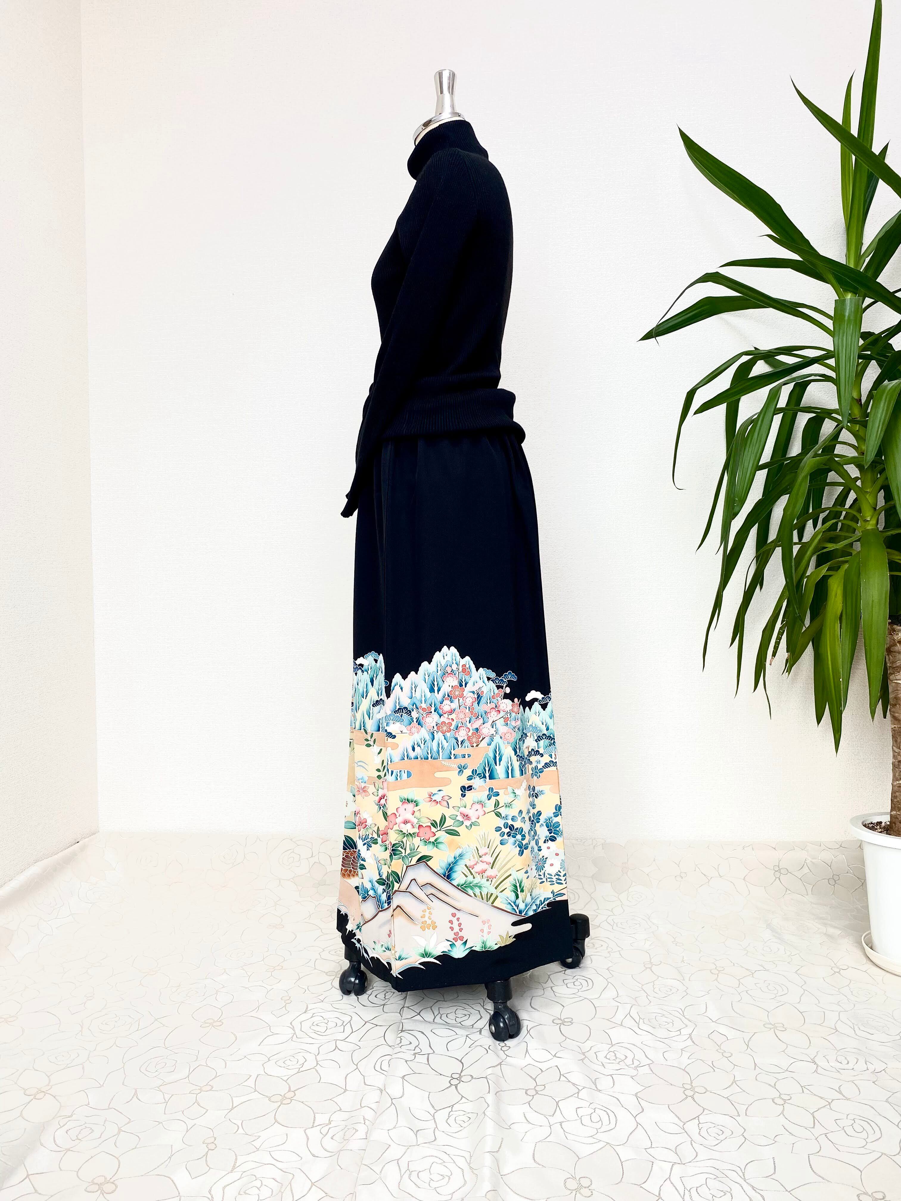 黒留袖着物リメイクウエストゴムスカート送料無料フリーサイズ1点物黒留袖着物リメイクウエストゴムスカートハンドメイド黒留袖着物リメイクスカート1点物NO.589