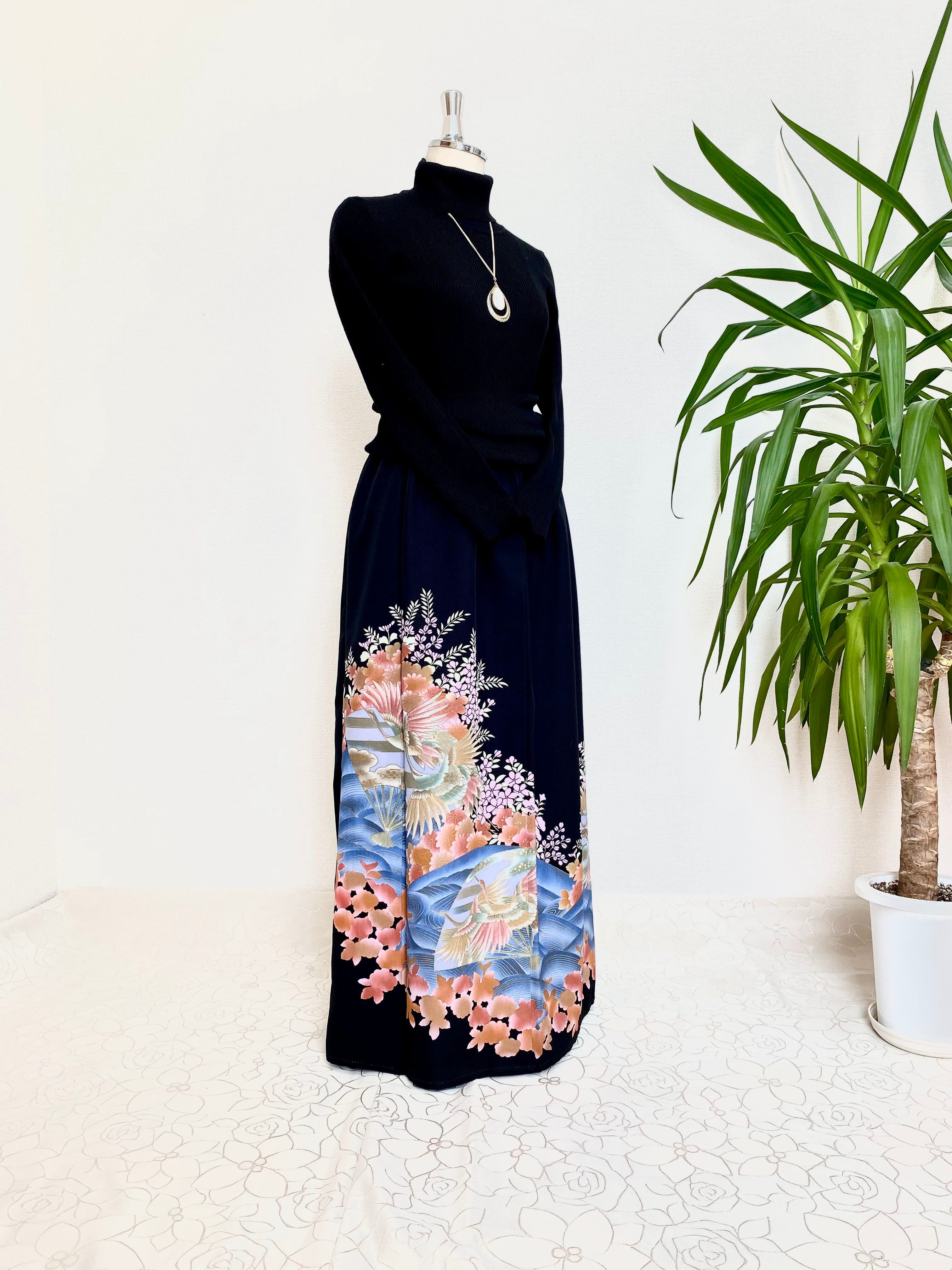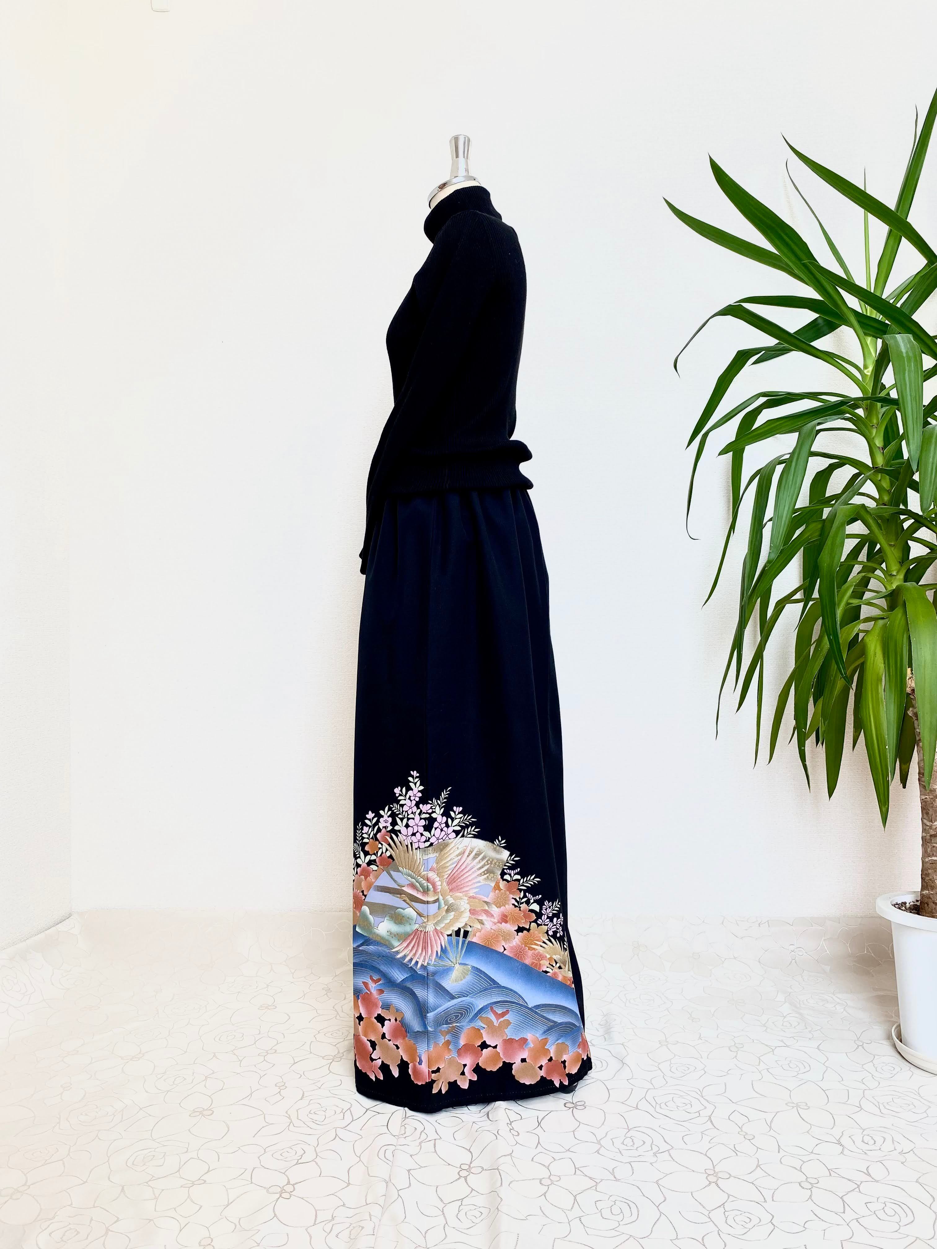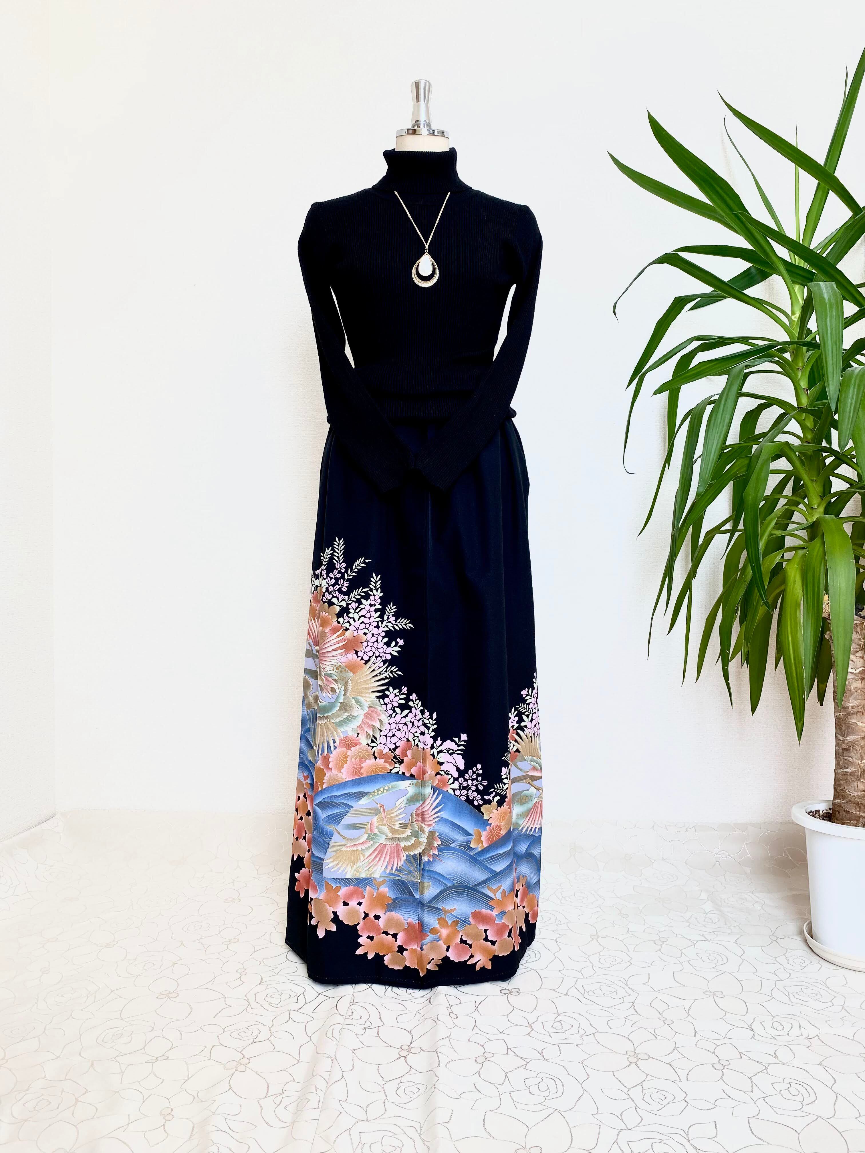 黒留袖着物リメイクウエストゴムスカート【超ロング丈】送料無料フリーサイズ1点物黒留袖着物リメイクウエストゴムスカート【超ロング丈】ハンドメイド黒留袖着物リメイクスカート1点物NO.617