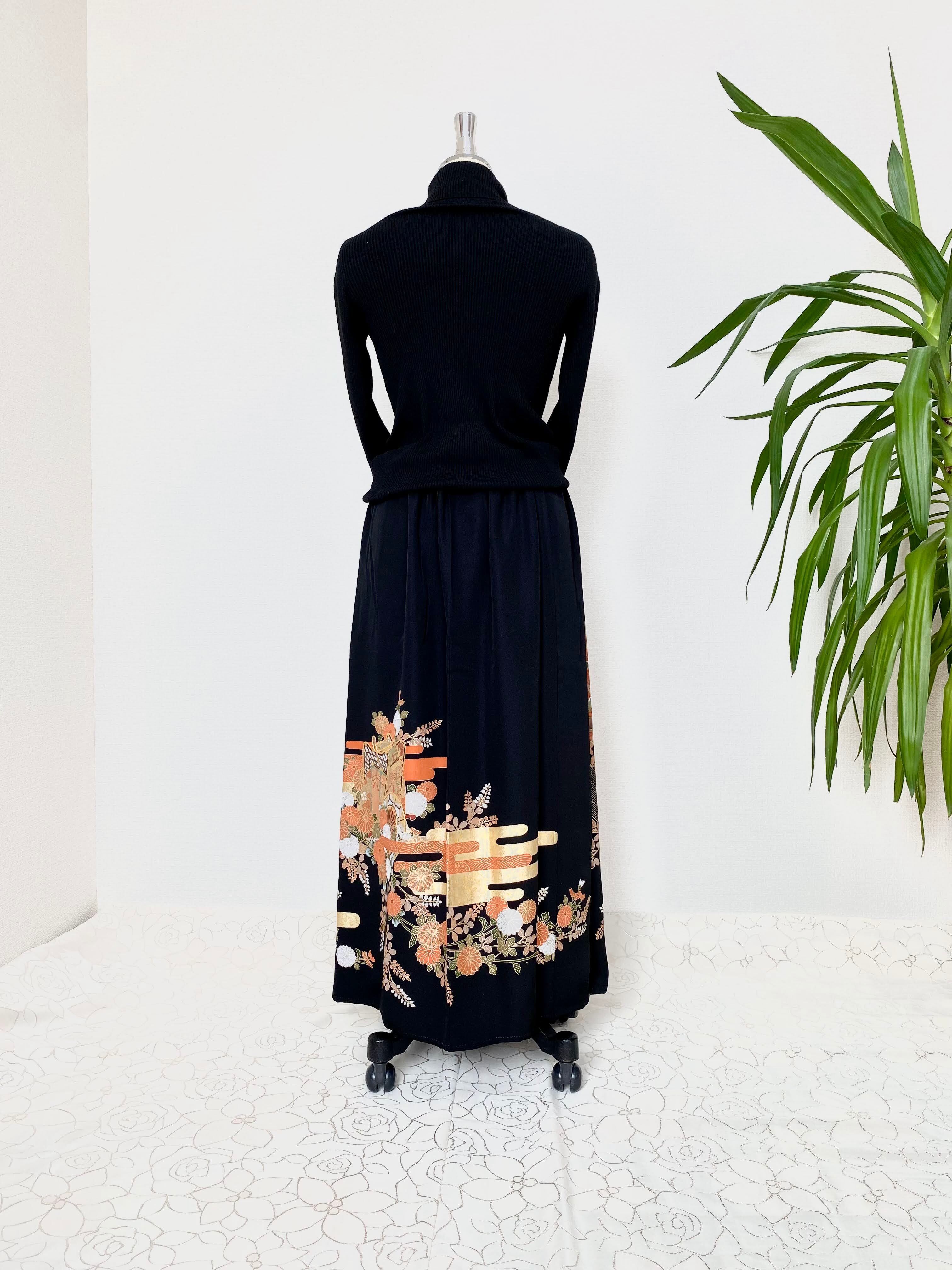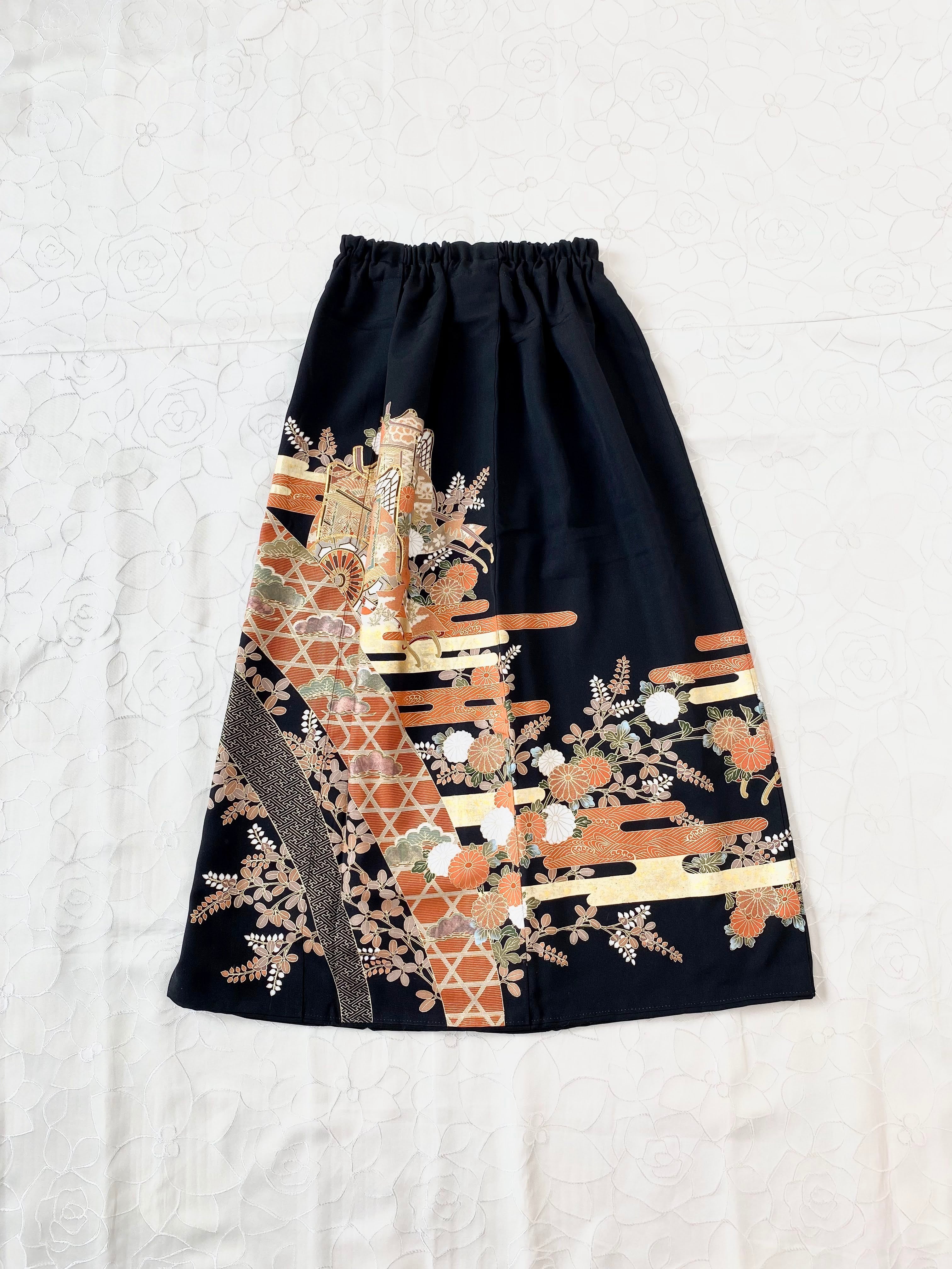 黒留袖着物リメイクウエストゴムスカート送料無料フリーサイズ1点物黒留袖着物リメイクウエストゴムスカートハンドメイド黒留袖着物リメイクスカート1点物NO.633