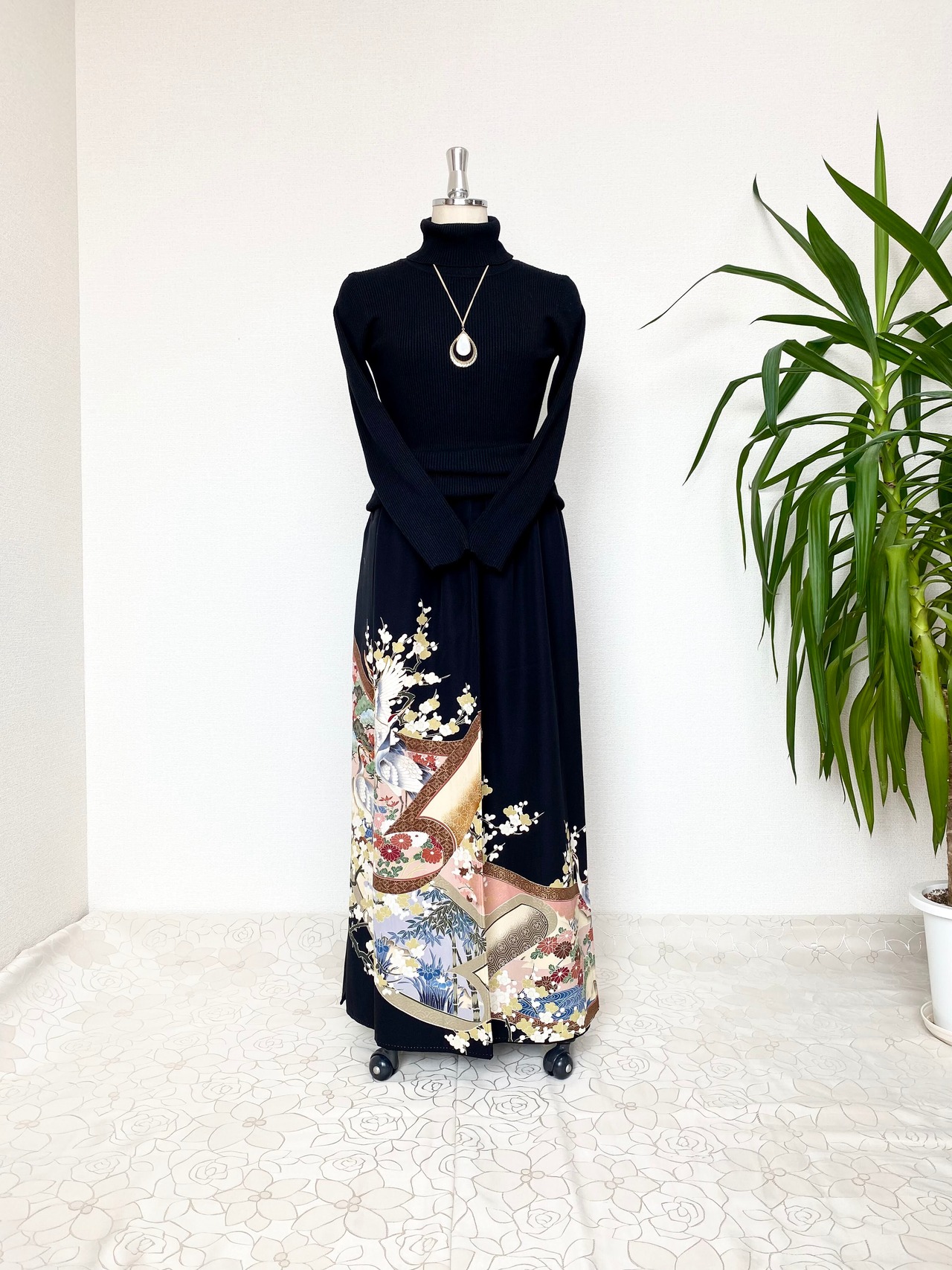 黒留袖着物リメイクウエストゴムスカート【超ロング丈】送料無料フリーサイズ1点物黒留袖着物リメイクウエストゴムスカート【超ロング丈】ハンドメイド黒留袖着物リメイクスカート1点物NO.636