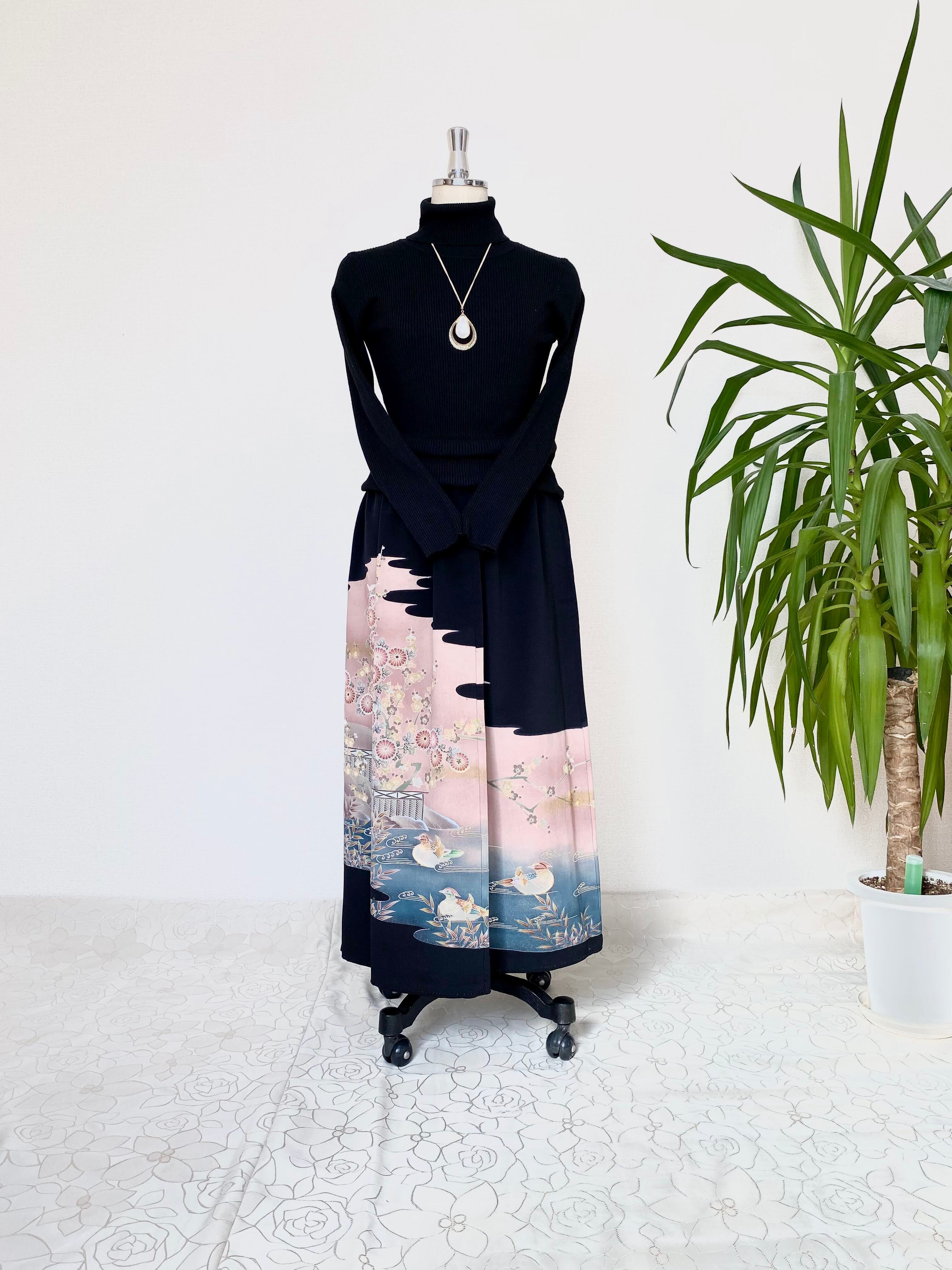 黒留袖着物リメイクウエストゴムスカート送料無料フリーサイズ1点物黒留袖着物リメイクウエストゴムスカートハンドメイド黒留袖着物リメイクスカート1点物NO.643