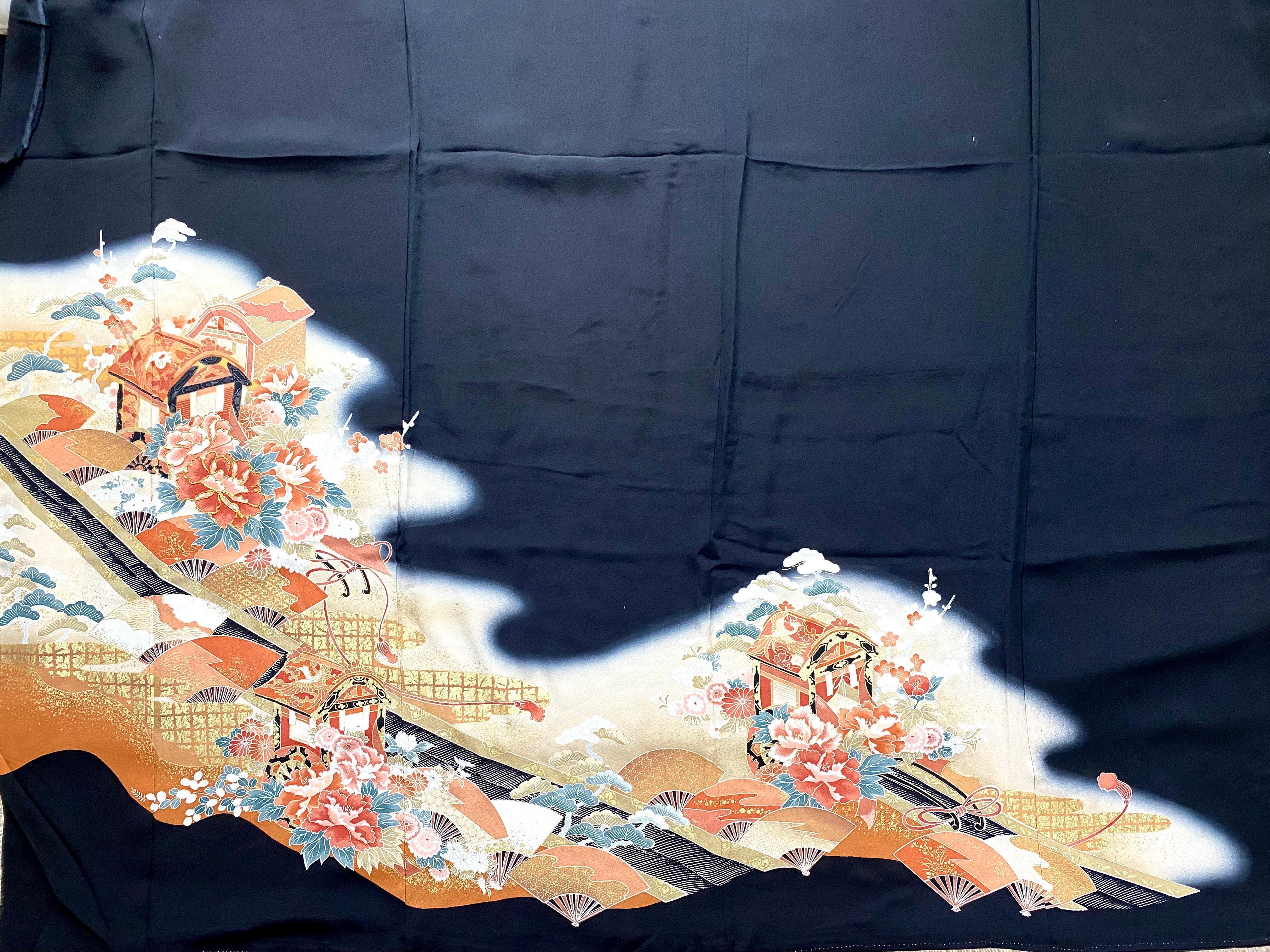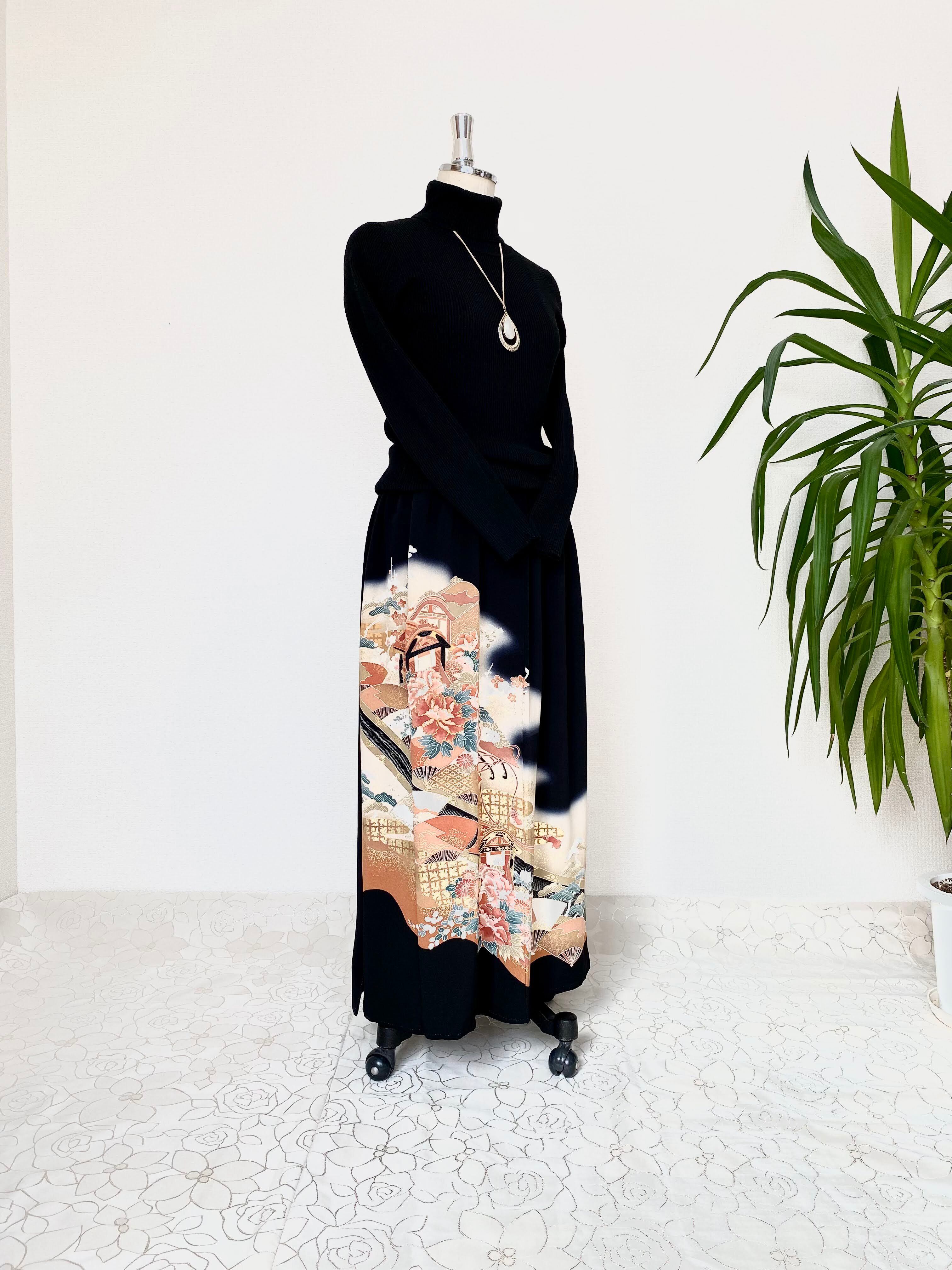 黒留袖着物リメイクウエストゴムスカート送料無料フリーサイズ1点物黒留袖着物リメイクウエストゴムスカートハンドメイド黒留袖着物リメイクスカート1点物NO.644