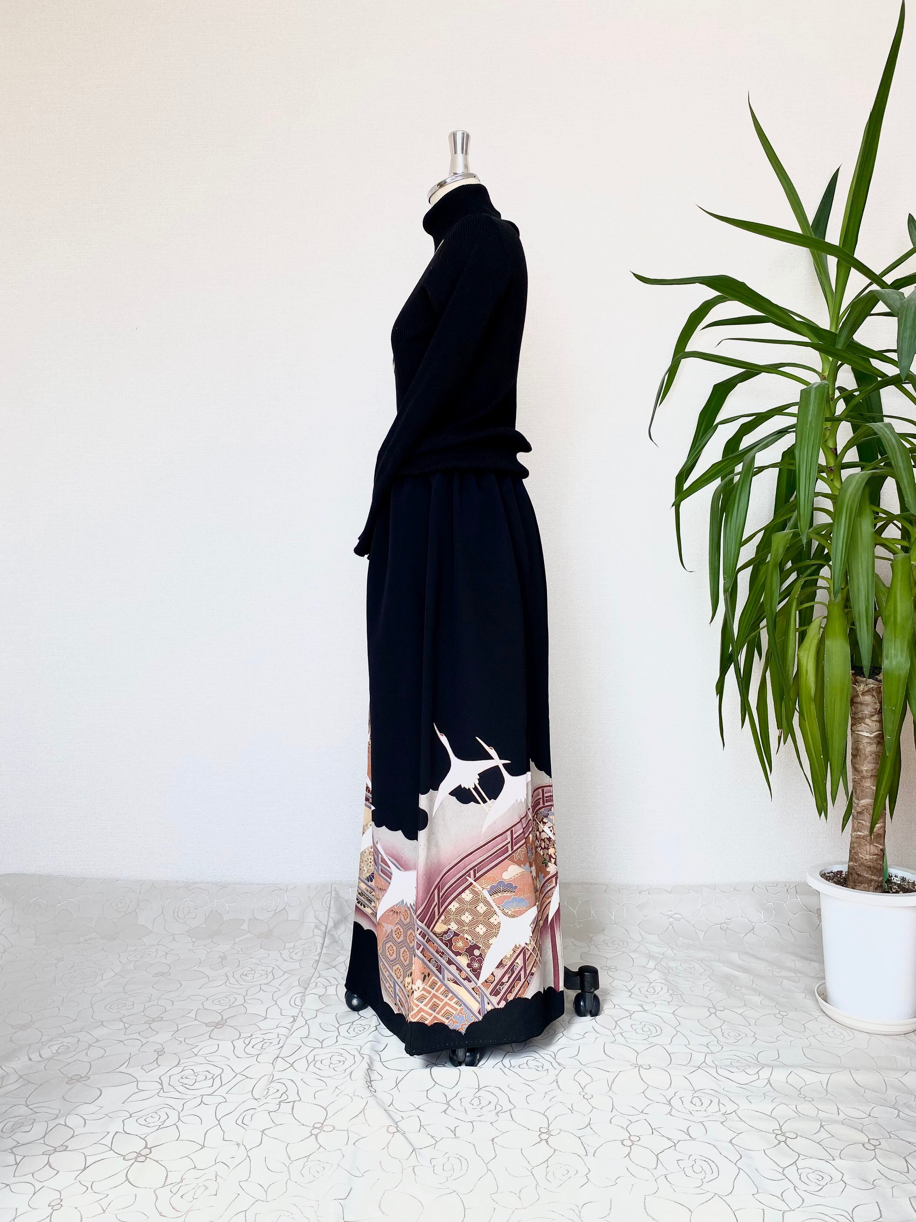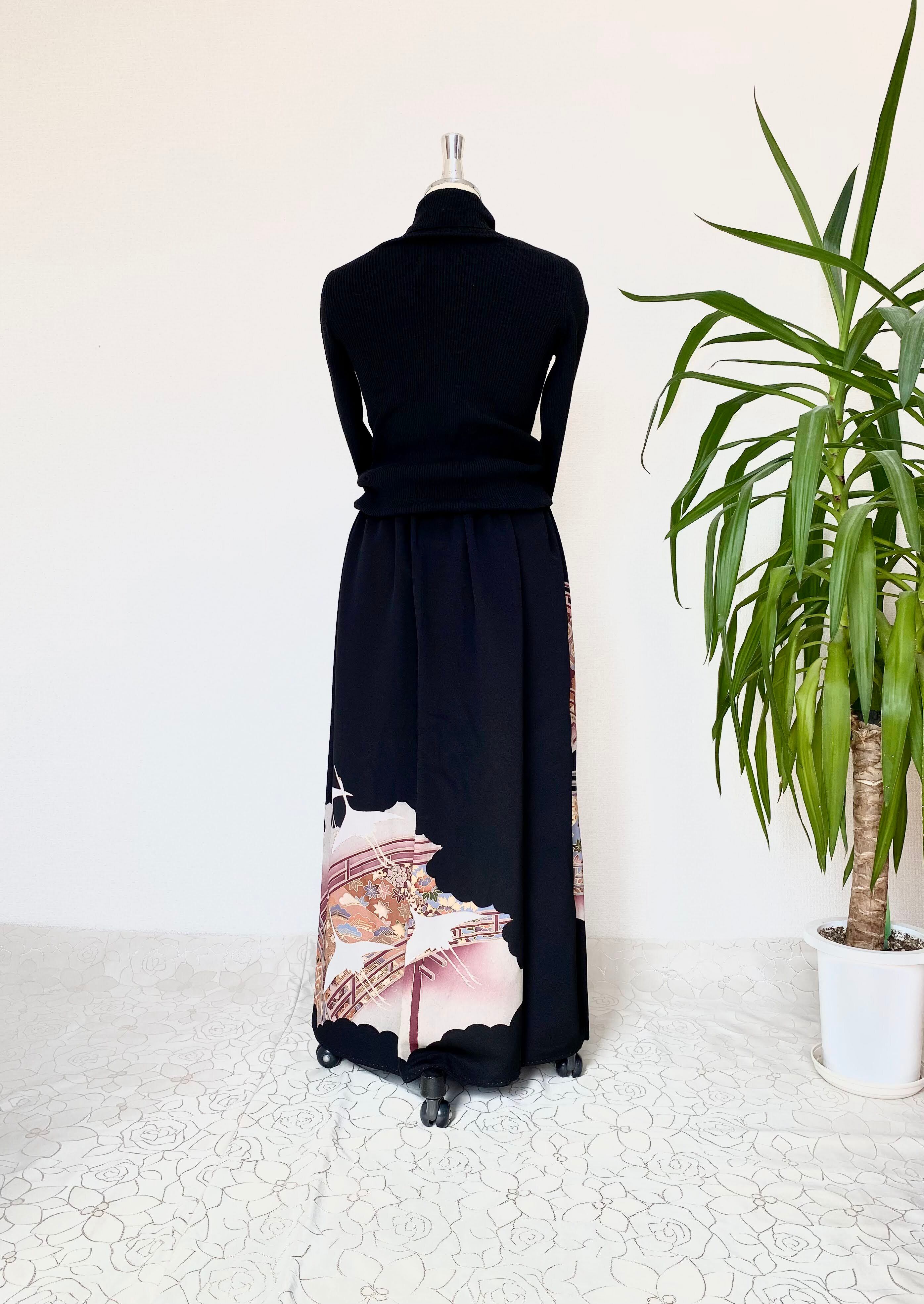 黒留袖着物リメイクウエストゴムスカート【超ロング丈】送料無料フリーサイズ1点物黒留袖着物リメイクウエストゴムスカート【超ロング丈】ハンドメイド黒留袖着物リメイクスカート1点物NO.667