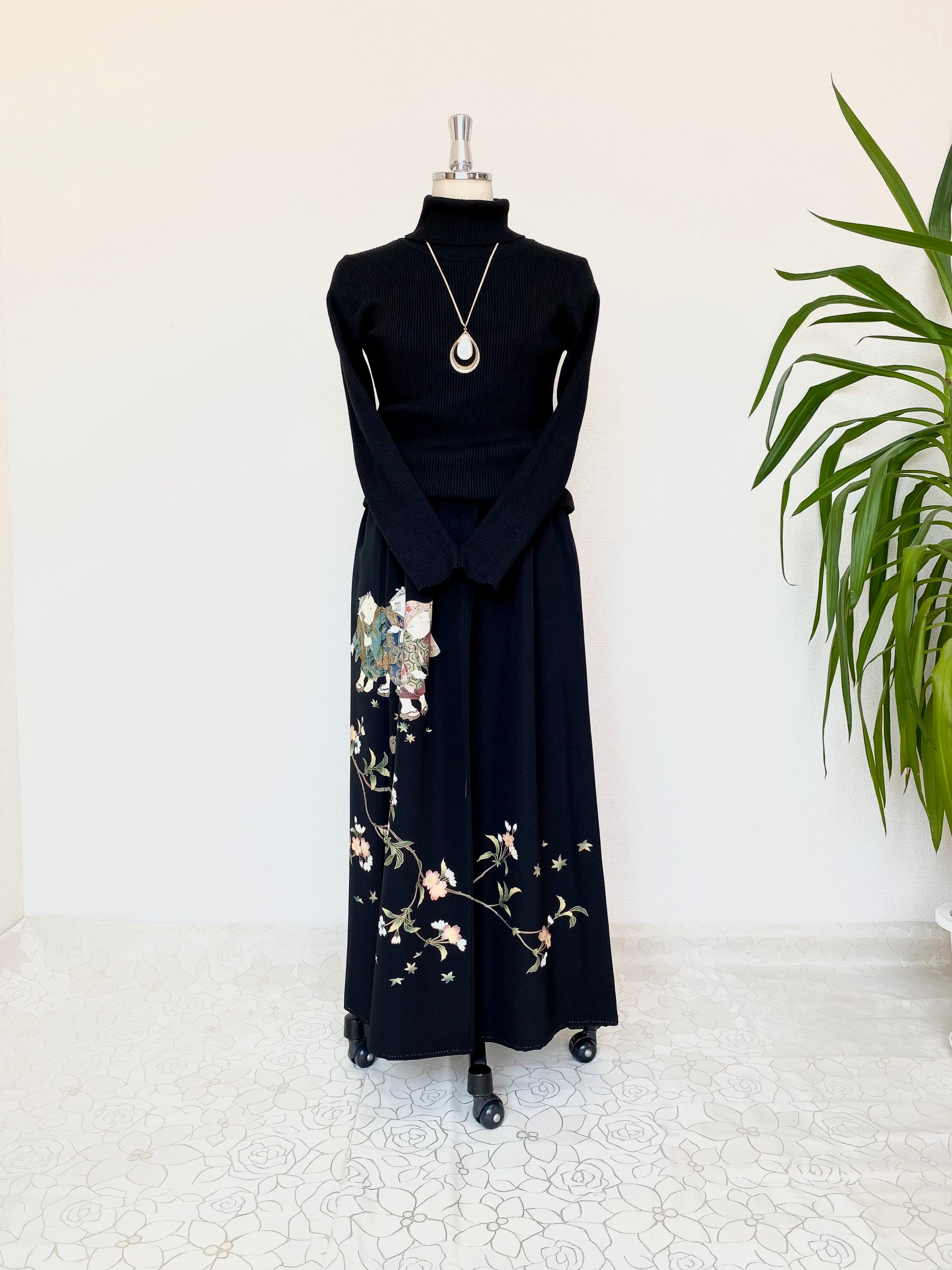 黒留袖着物リメイクウエストゴムスカート送料無料フリーサイズ1点物黒留袖着物リメイクウエストゴムスカートハンドメイド黒留袖着物リメイクスカート1点物NO.698