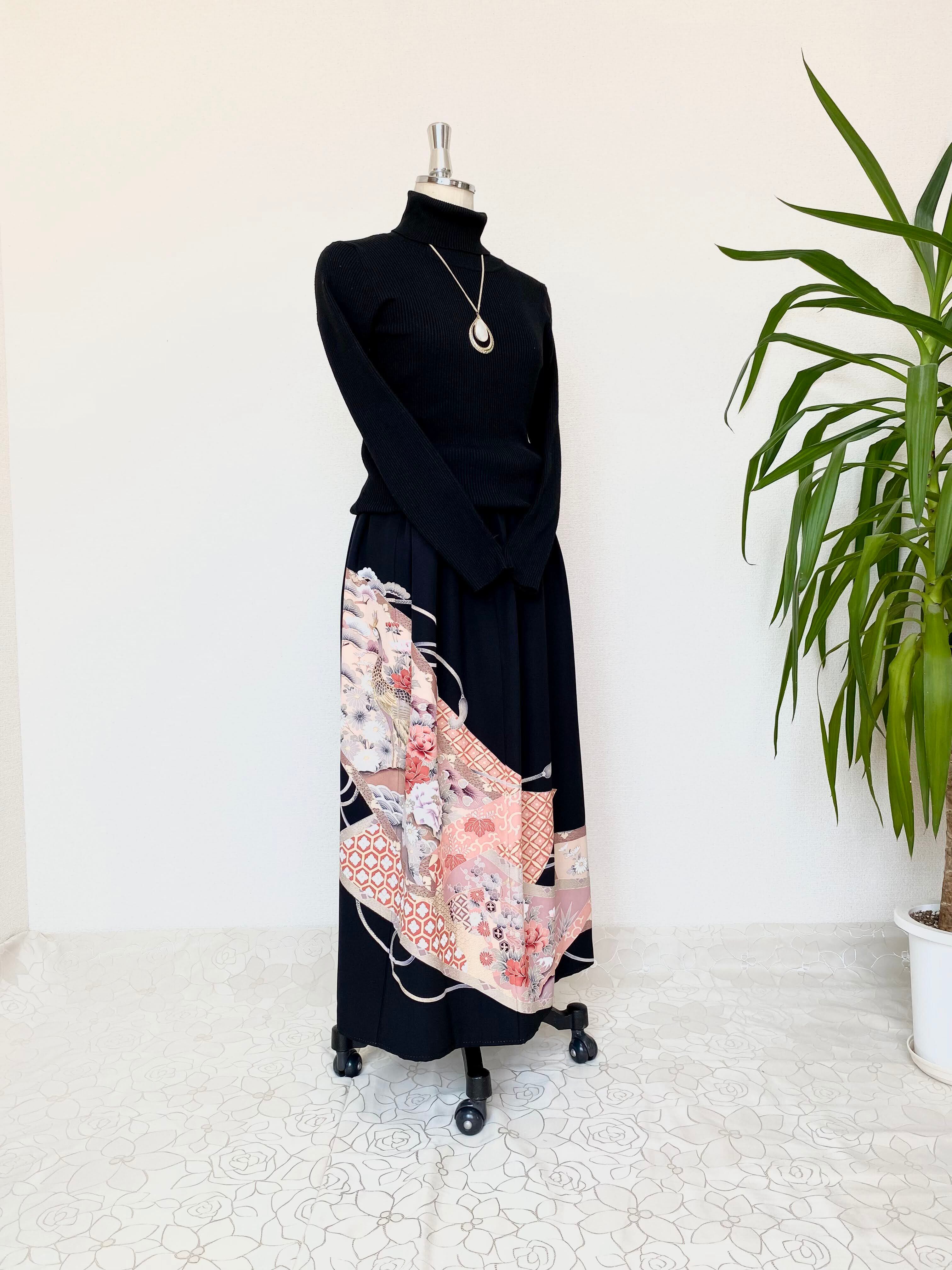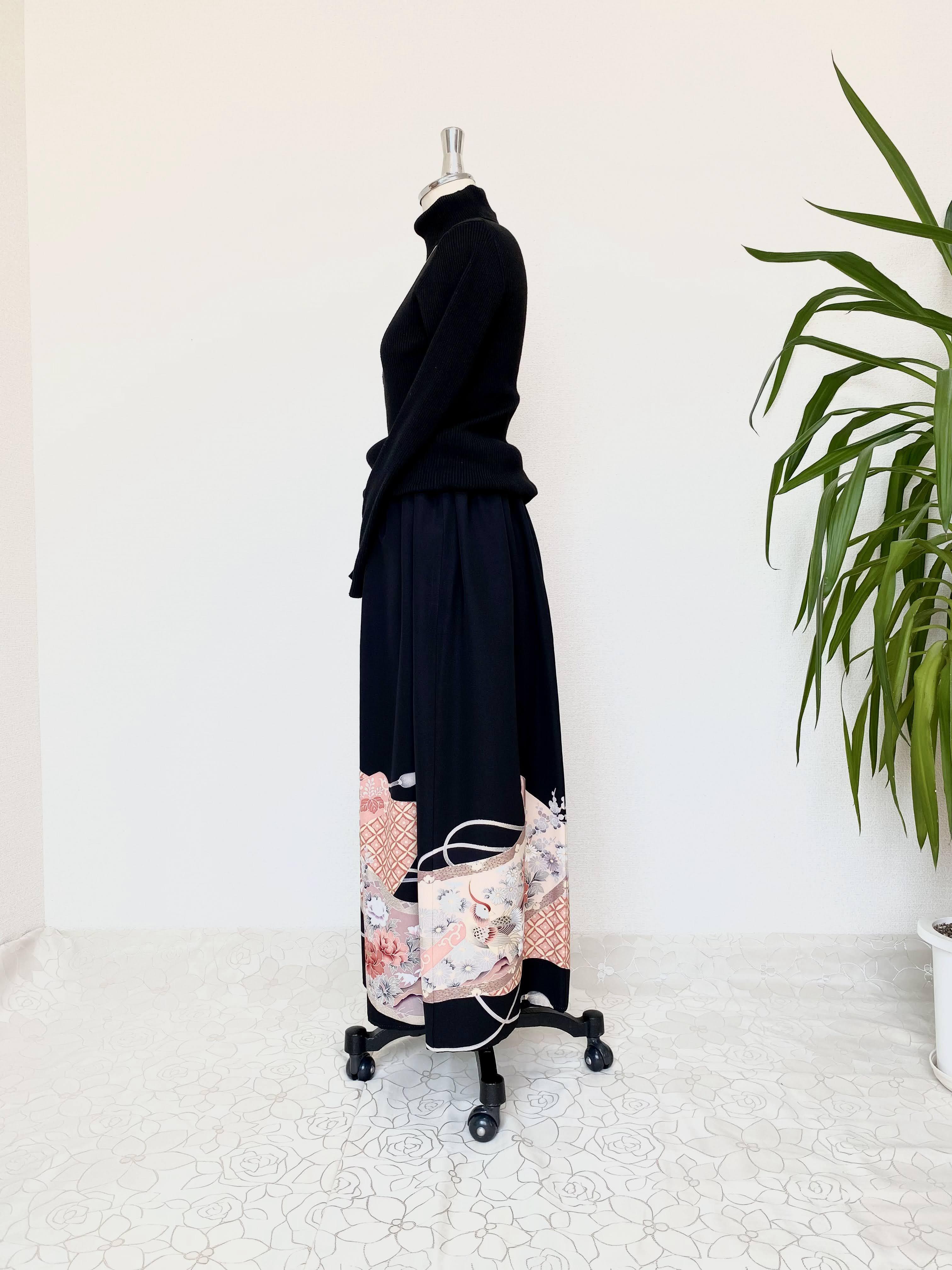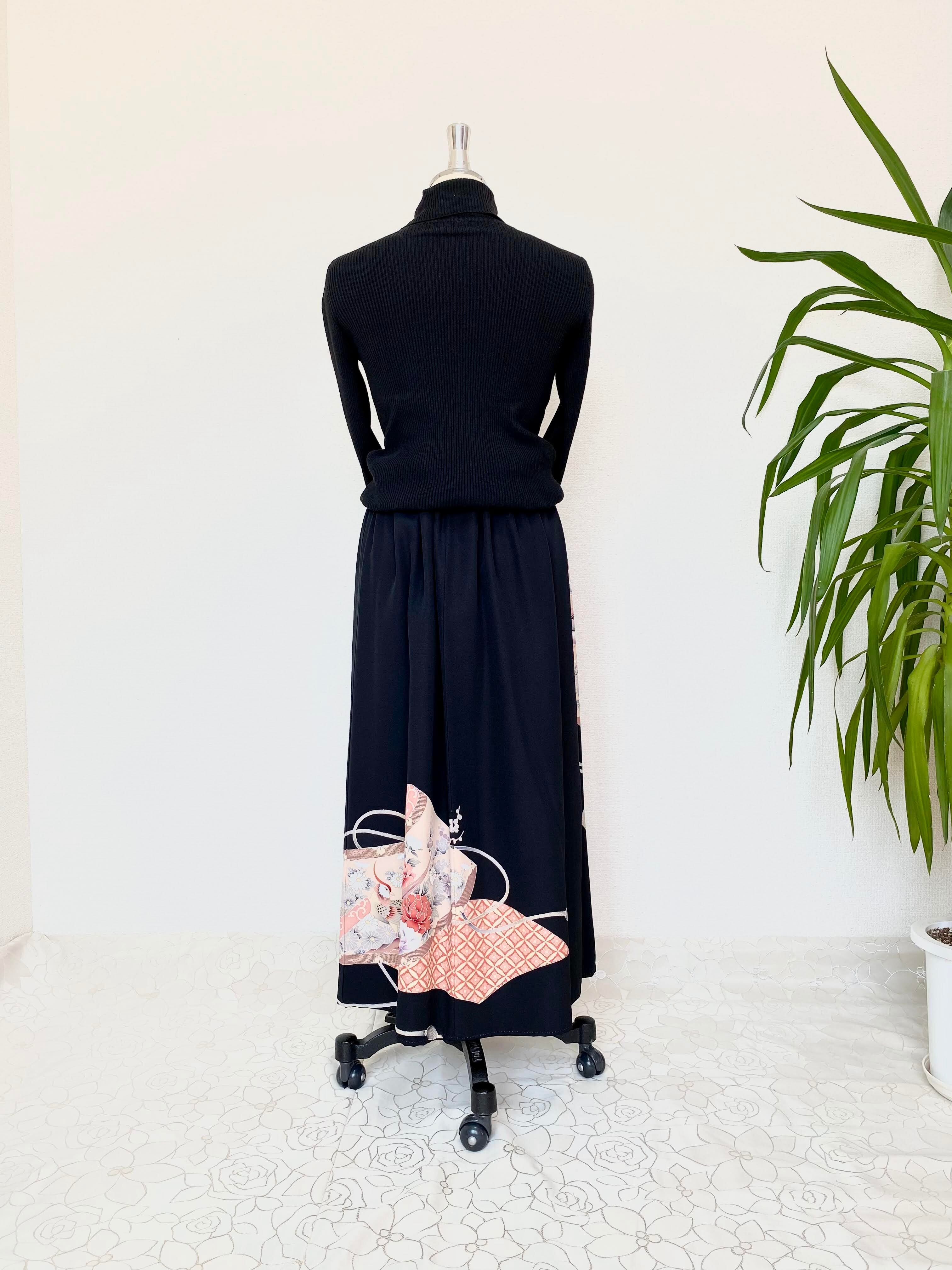 黒留袖着物リメイクウエストゴムスカート送料無料フリーサイズ1点物黒留袖着物リメイクウエストゴムスカートハンドメイド黒留袖着物リメイクスカート1点物NO.703