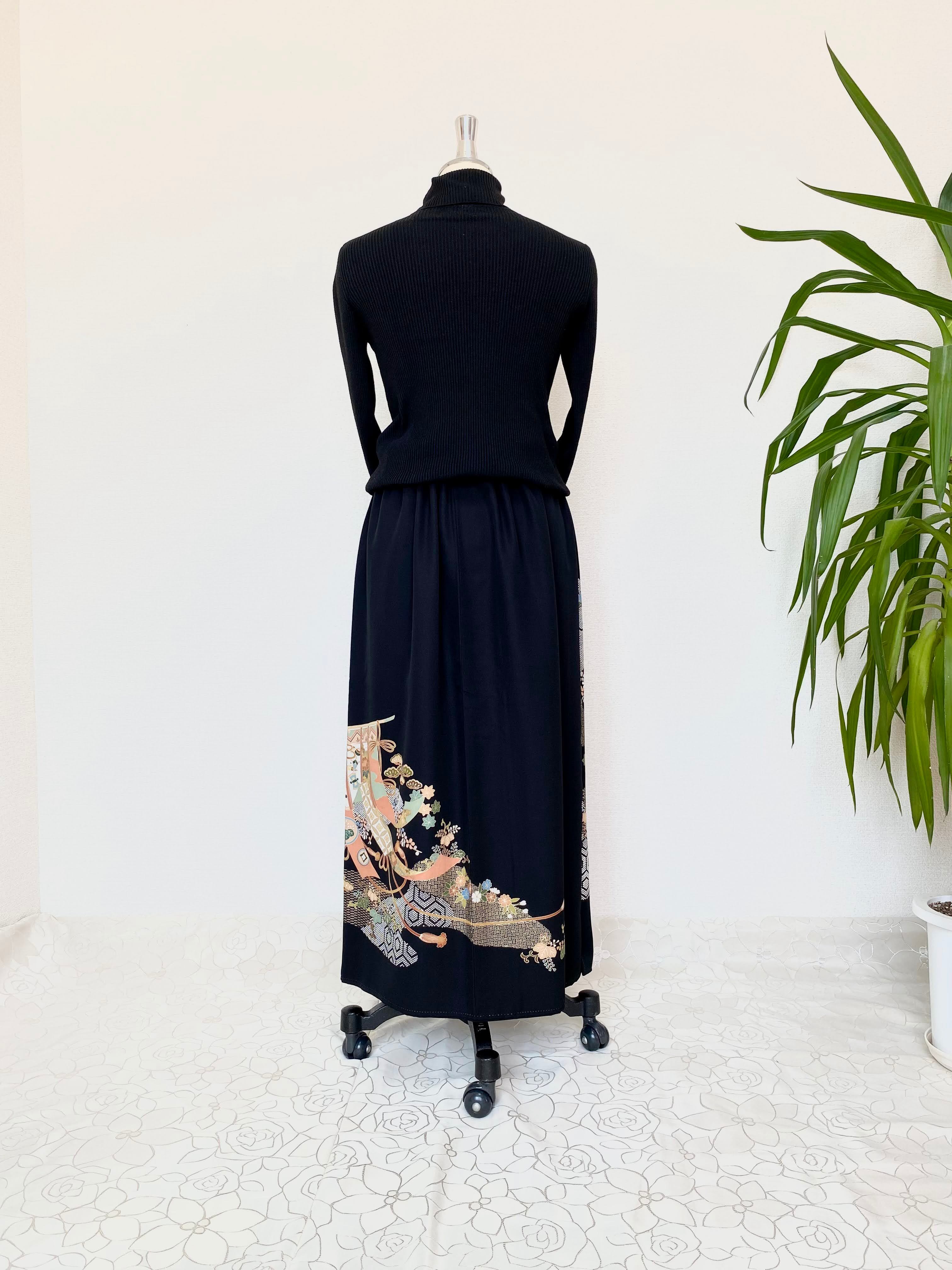 黒留袖着物リメイクウエストゴムスカート送料無料フリーサイズ1点物黒留袖着物リメイクウエストゴムスカートハンドメイド黒留袖着物リメイクスカート1点物NO.704