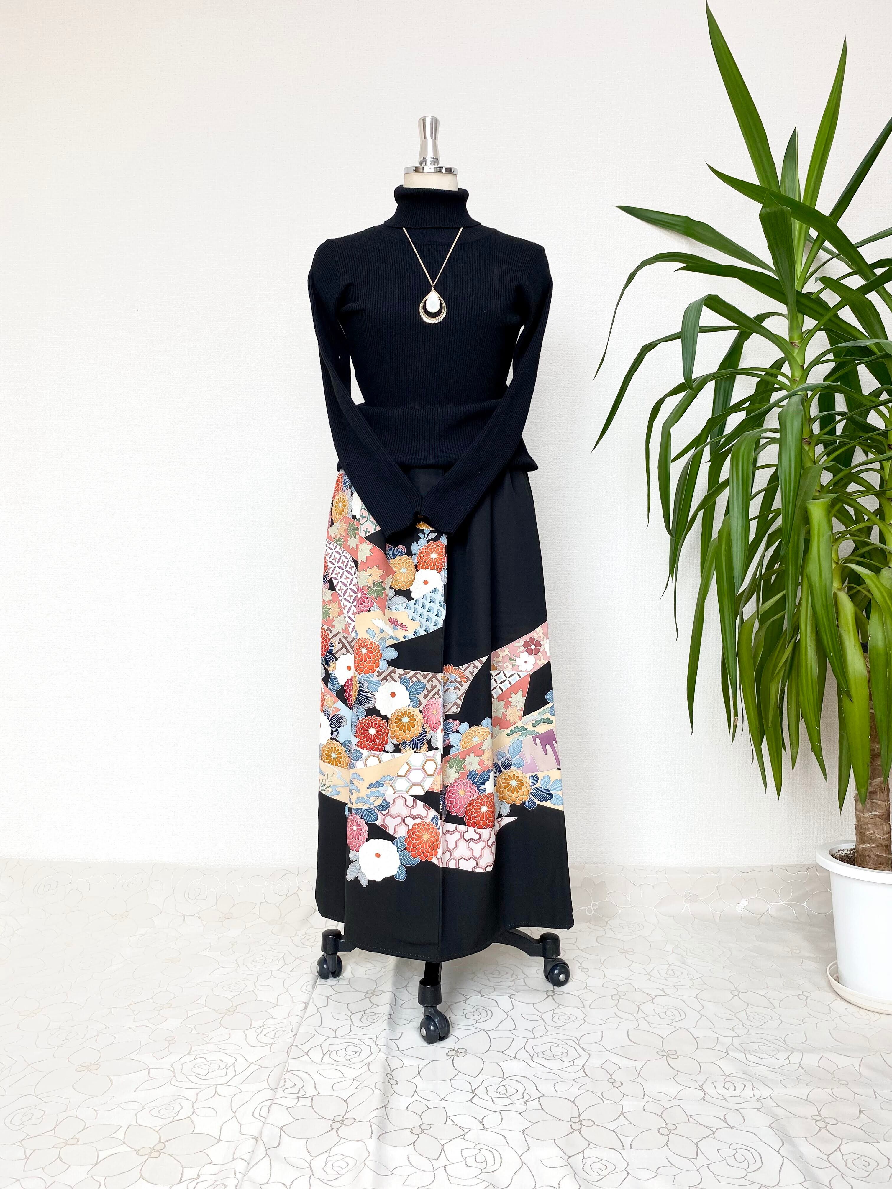 黒留袖着物リメイクウエストゴムスカート送料無料フリーサイズ1点物黒留袖着物リメイクウエストゴムスカートハンドメイド黒留袖着物リメイクスカート1点物NO.725