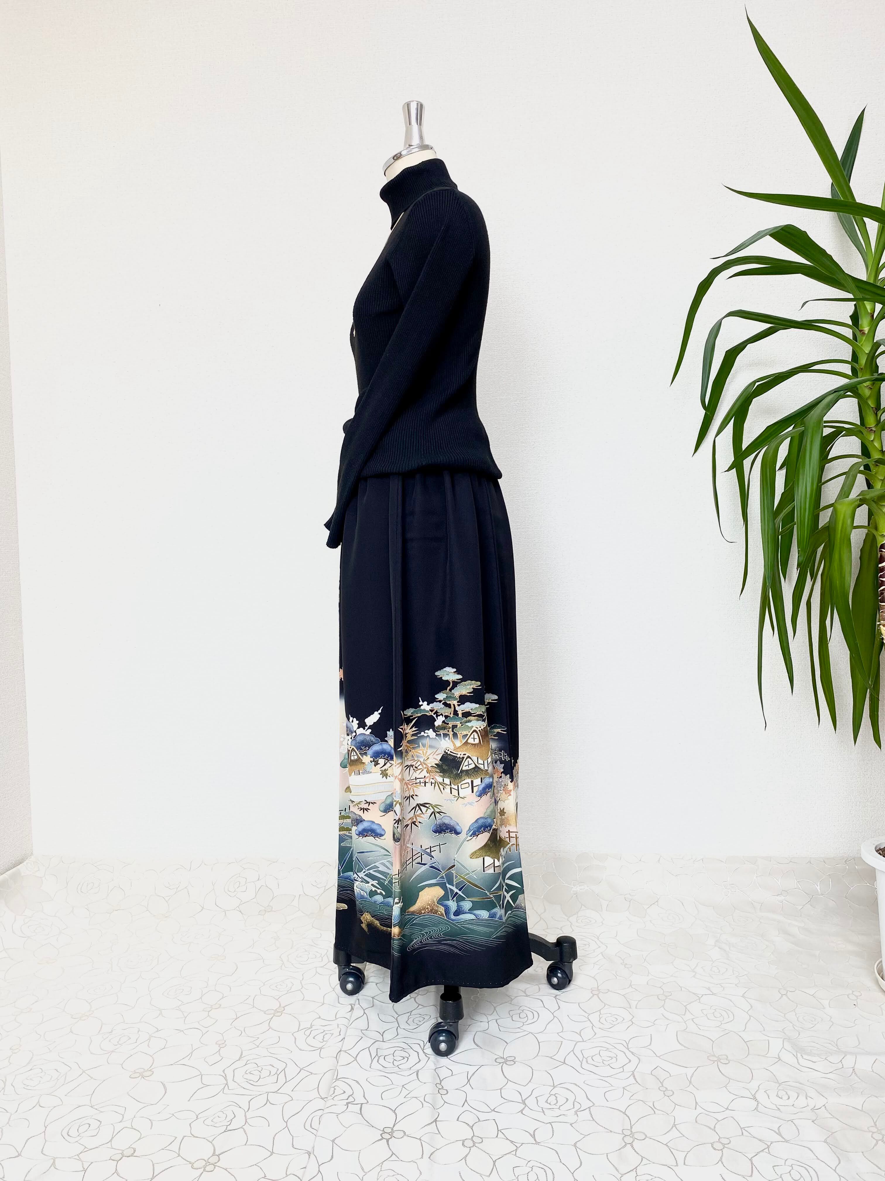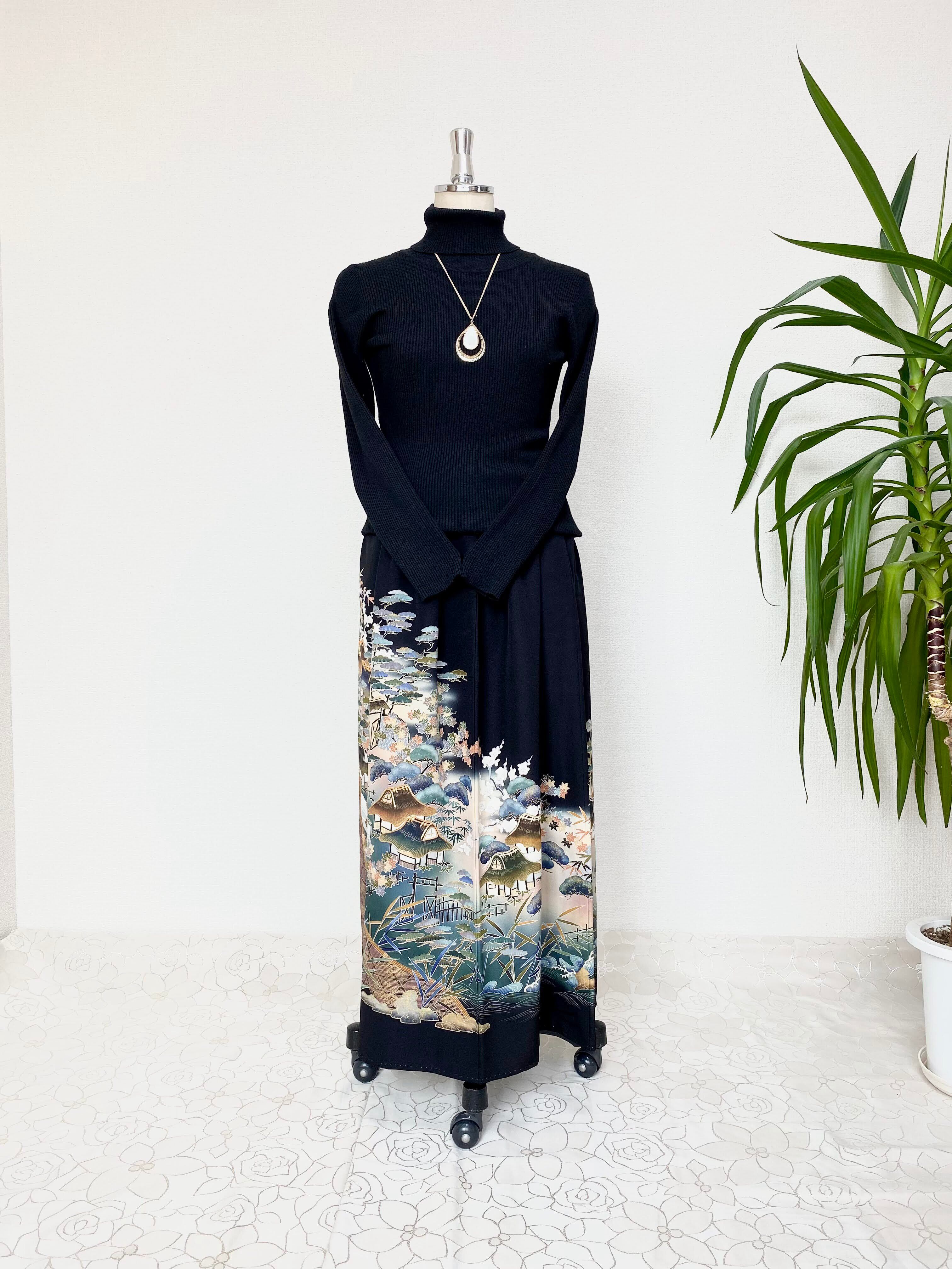 黒留袖着物リメイクウエストゴムスカート送料無料フリーサイズ1点物黒留袖着物リメイクウエストゴムスカートハンドメイド黒留袖着物リメイクスカート1点物NO.731