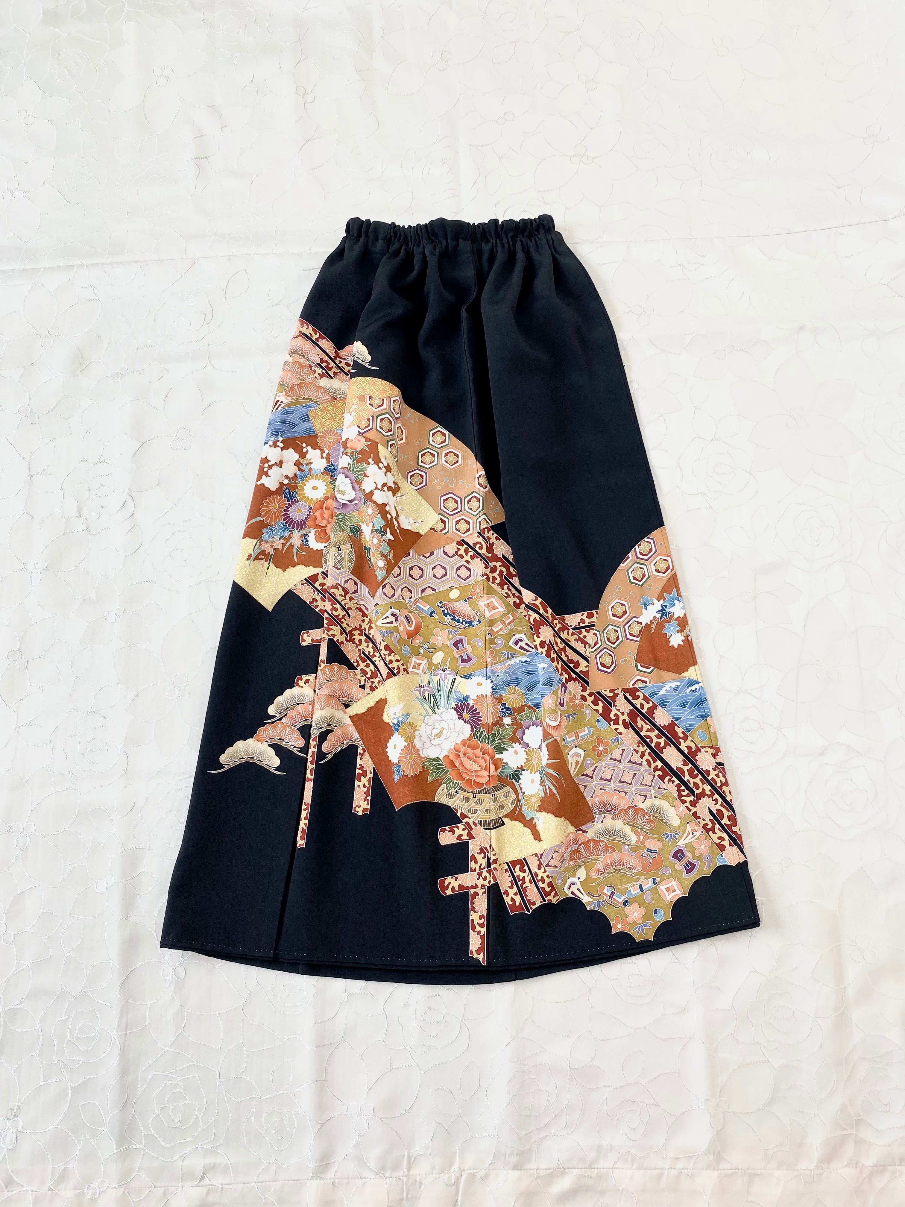 黒留袖着物をリメイクして作製したウエストゴムギャザードレススカートフリーサイズ【超ロング丈】です。