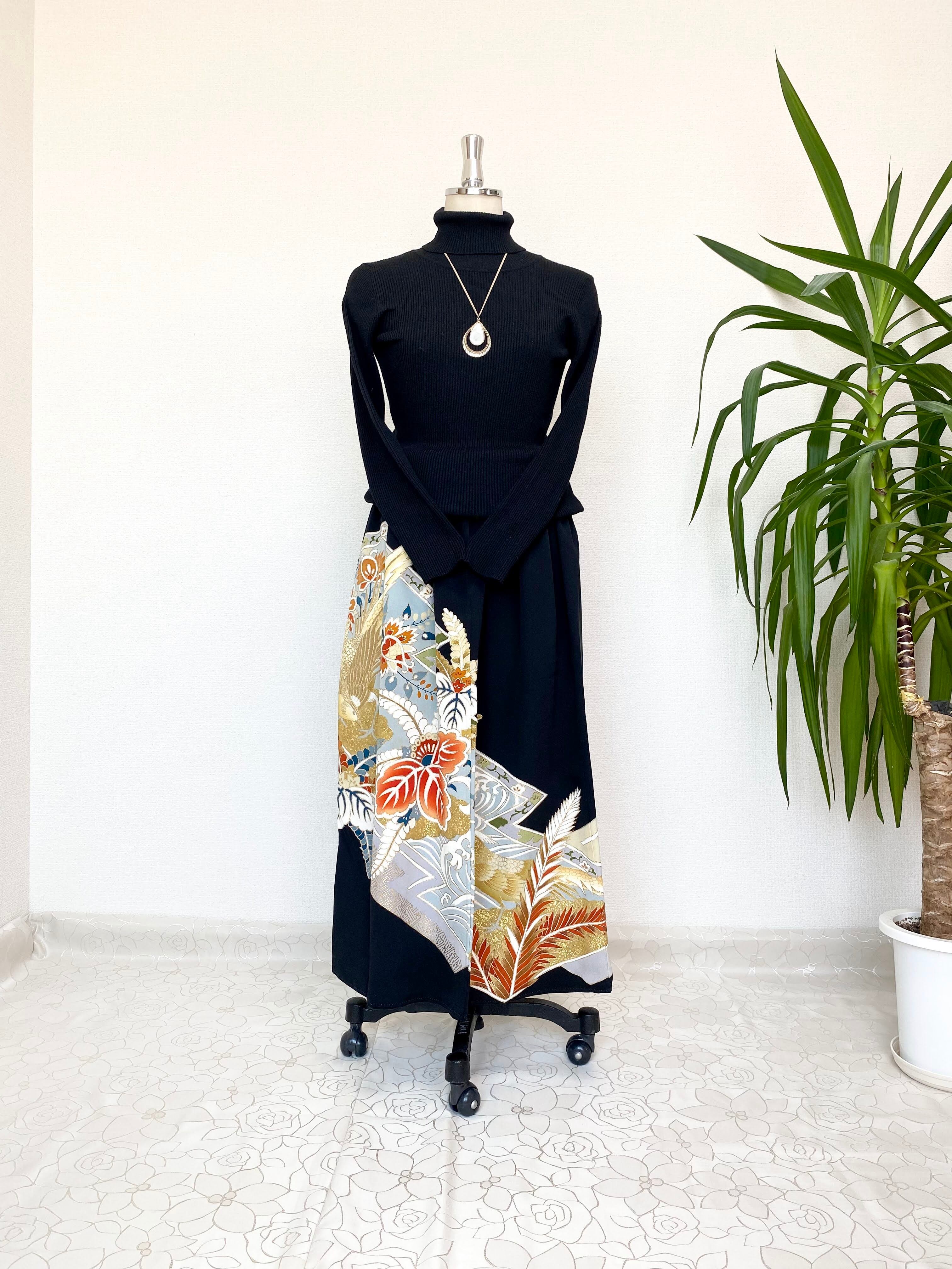 黒留袖着物リメイクウエストゴムスカート送料無料フリーサイズ1点物黒留袖着物リメイクウエストゴムスカートハンドメイド黒留袖着物リメイクスカート1点物NO.741