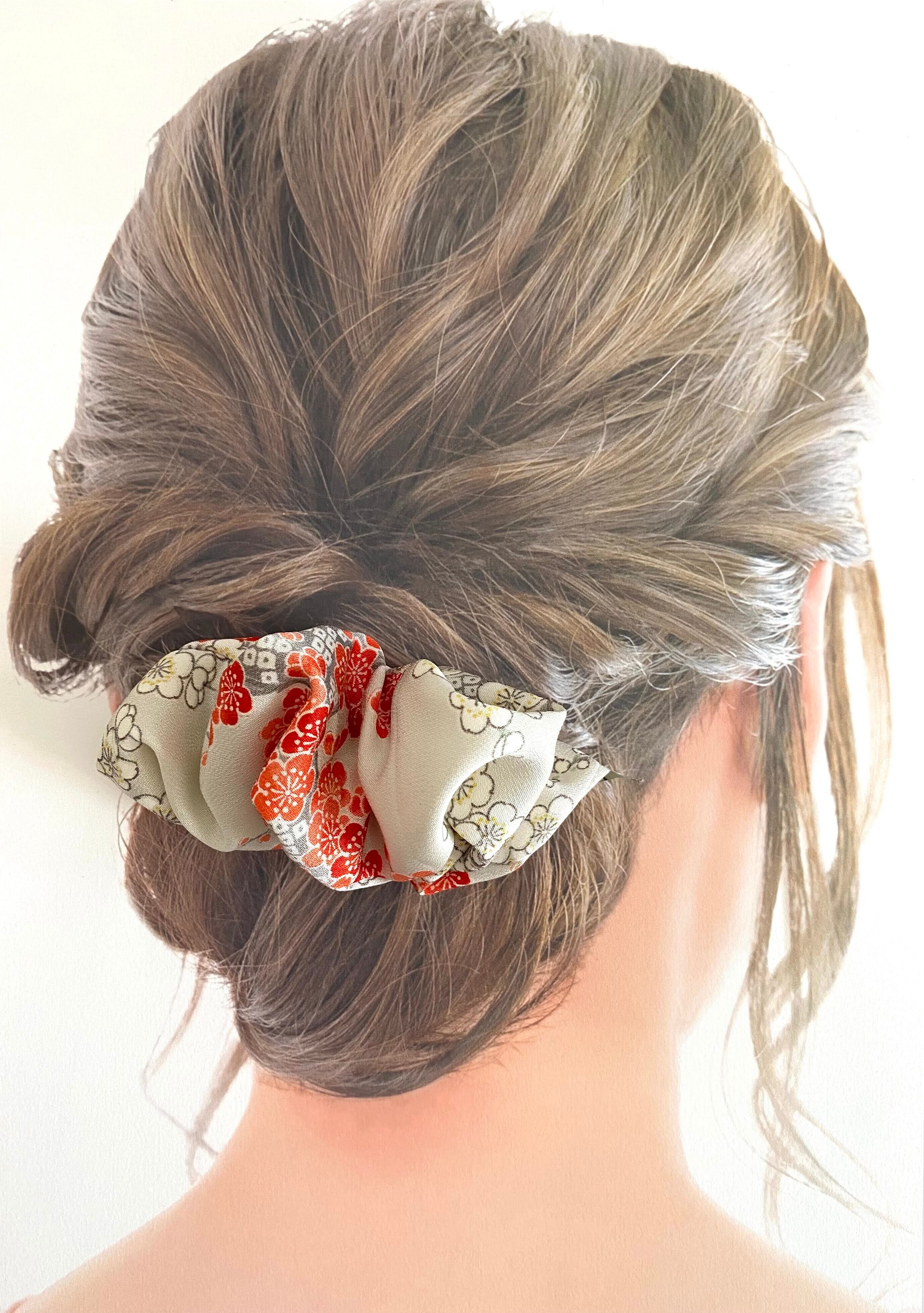 着物布生地なので柔らかで薄い布生地な為触り心地が良く滑らかで髪結びの装着がとても良いシュシュです。