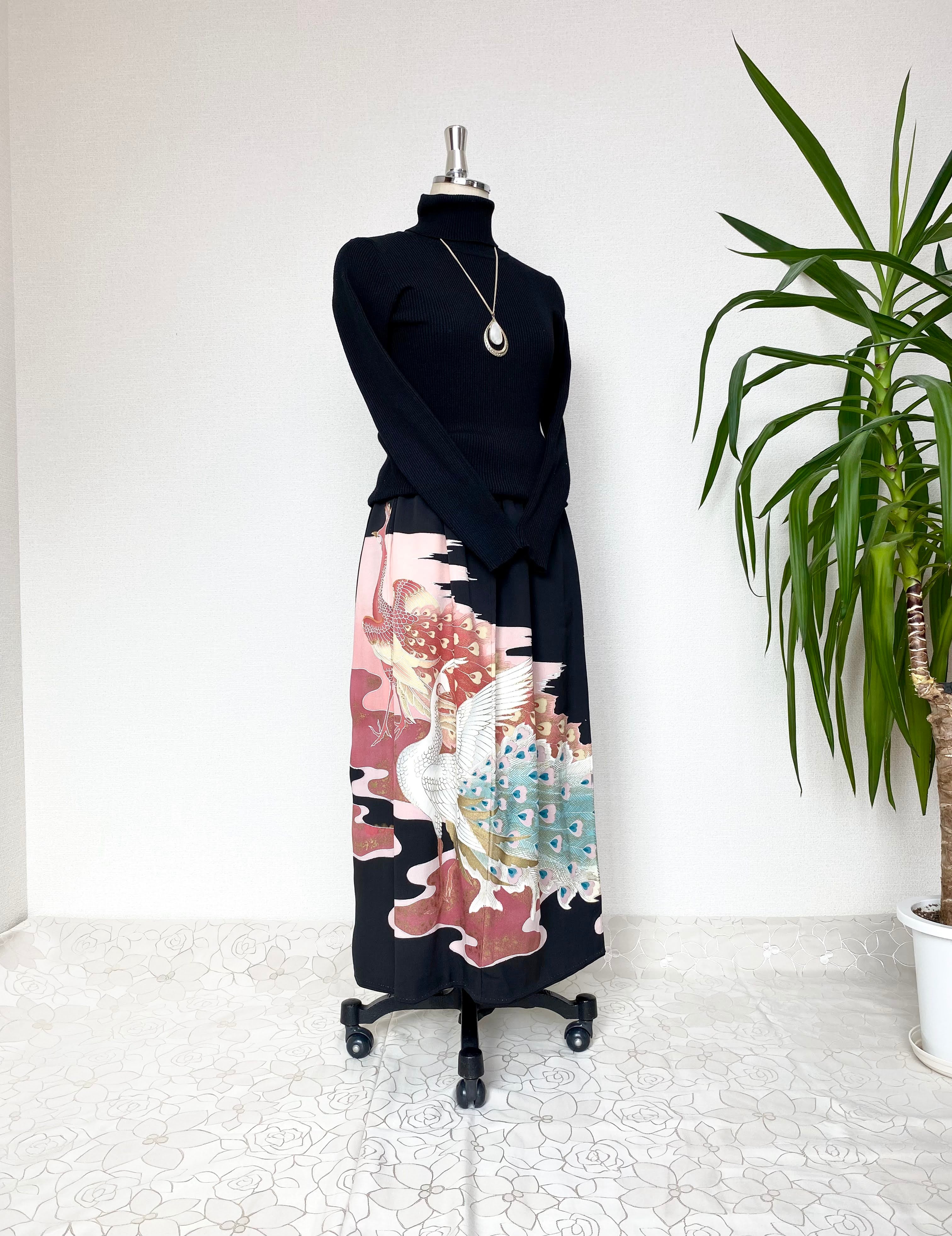 黒留袖着物リメイクウエストゴムスカート送料無料フリーサイズ1点物黒留袖着物リメイクウエストゴムスカートハンドメイド黒留袖着物リメイクスカート1点物NO.773