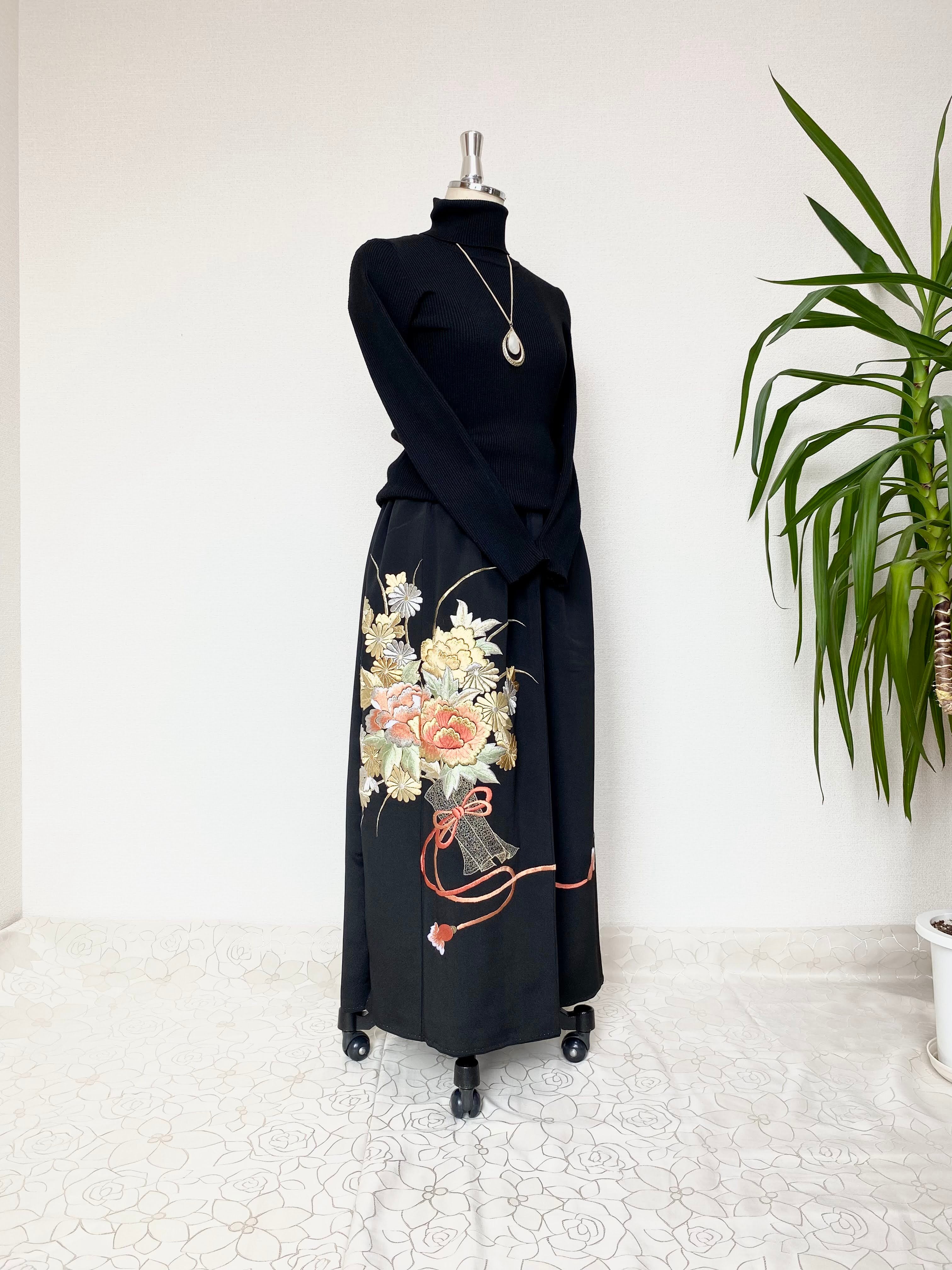 黒留袖着物リメイクウエストゴムスカート送料無料フリーサイズ1点物黒留袖着物リメイクウエストゴムスカートハンドメイド黒留袖着物リメイクスカート1点物NO.789