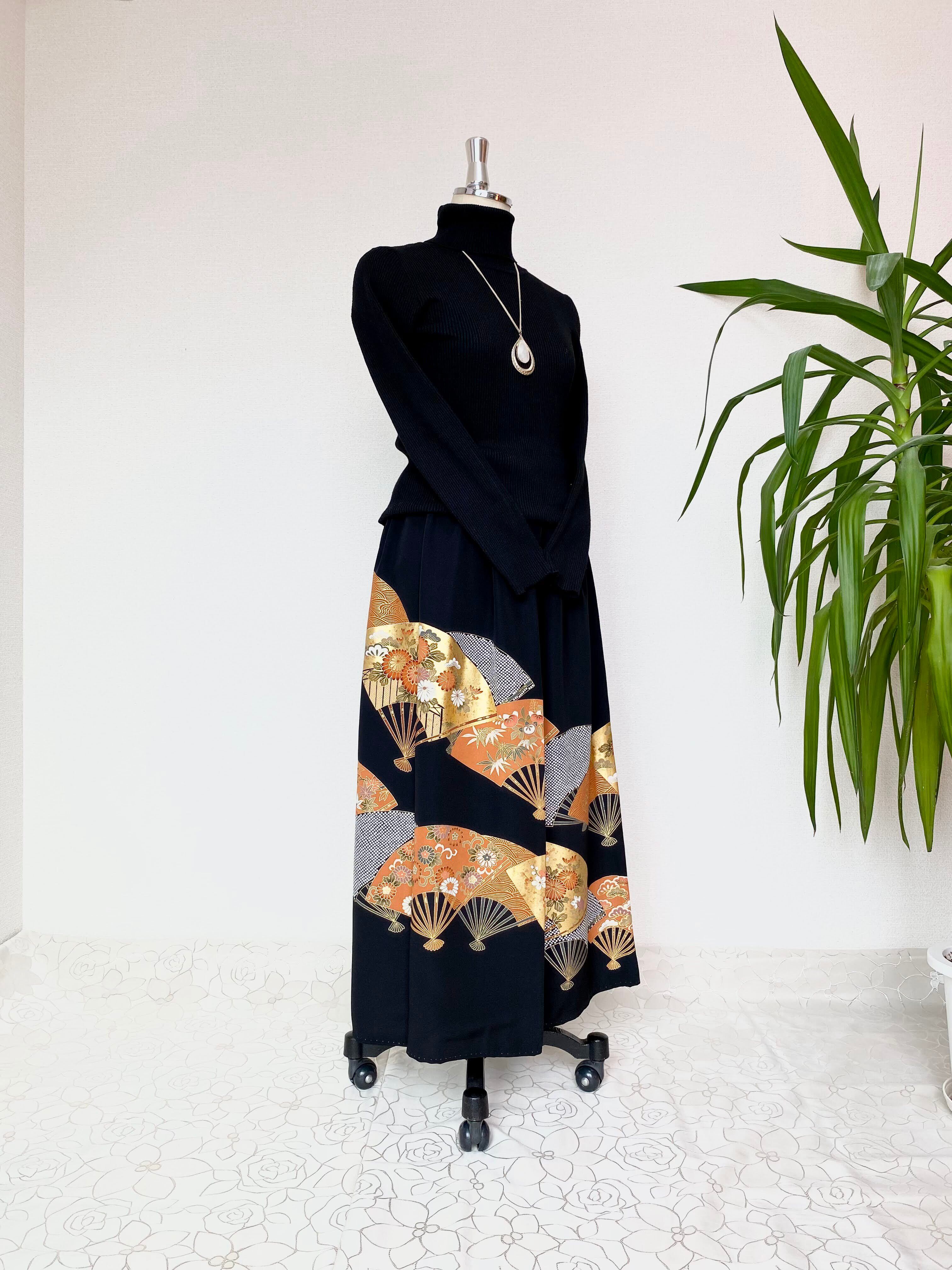 黒留袖着物リメイクウエストゴムスカート送料無料フリーサイズ1点物黒留袖着物リメイクウエストゴムスカートハンドメイド黒留袖着物リメイクスカート1点物NO.804