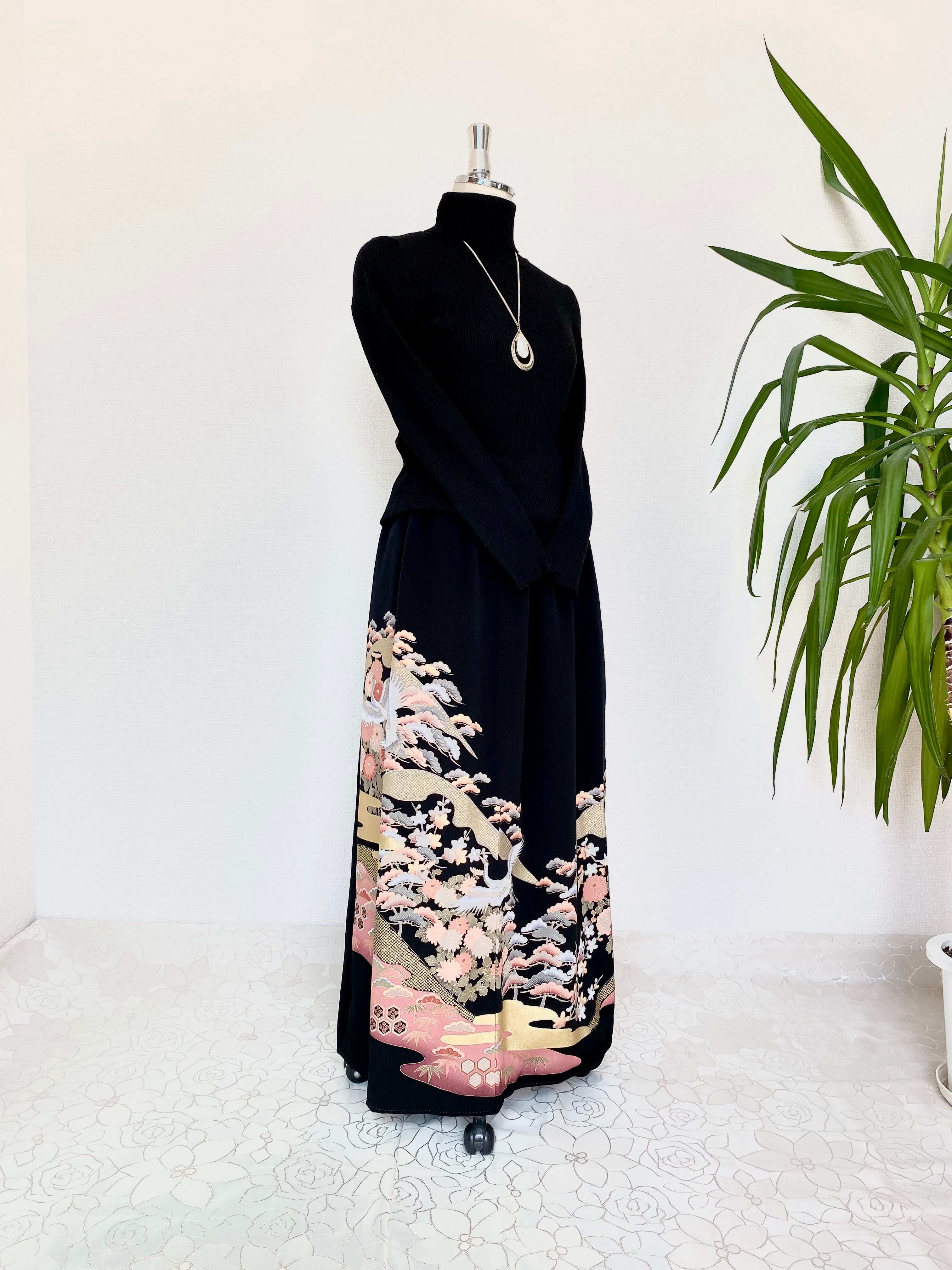 黒留袖着物リメイクウエストゴムスカート【超ロング丈】送料無料フリーサイズ1点物黒留袖着物リメイクウエストゴムスカート【超ロング丈】ハンドメイド黒留袖着物リメイクスカート1点物NO.825