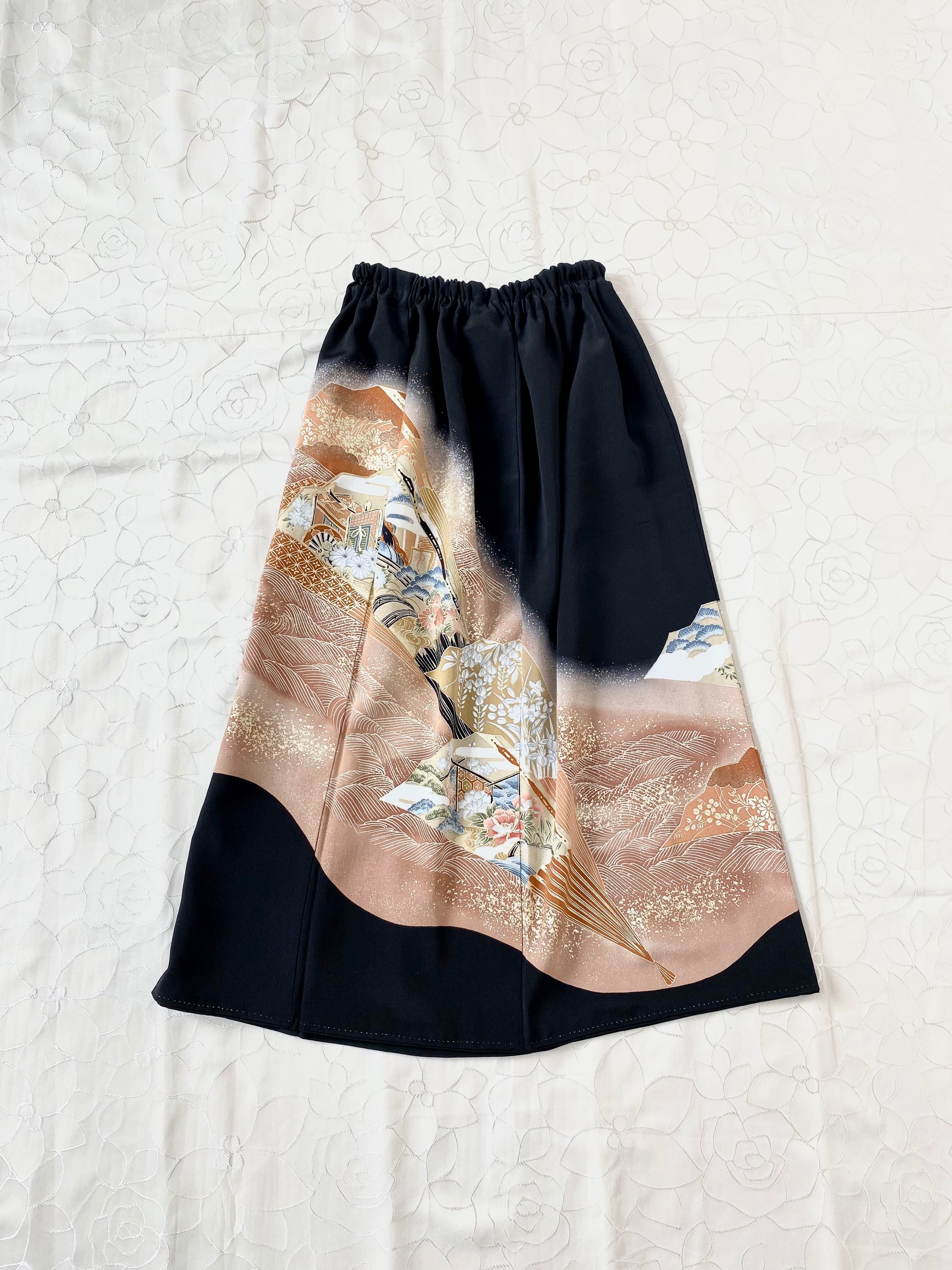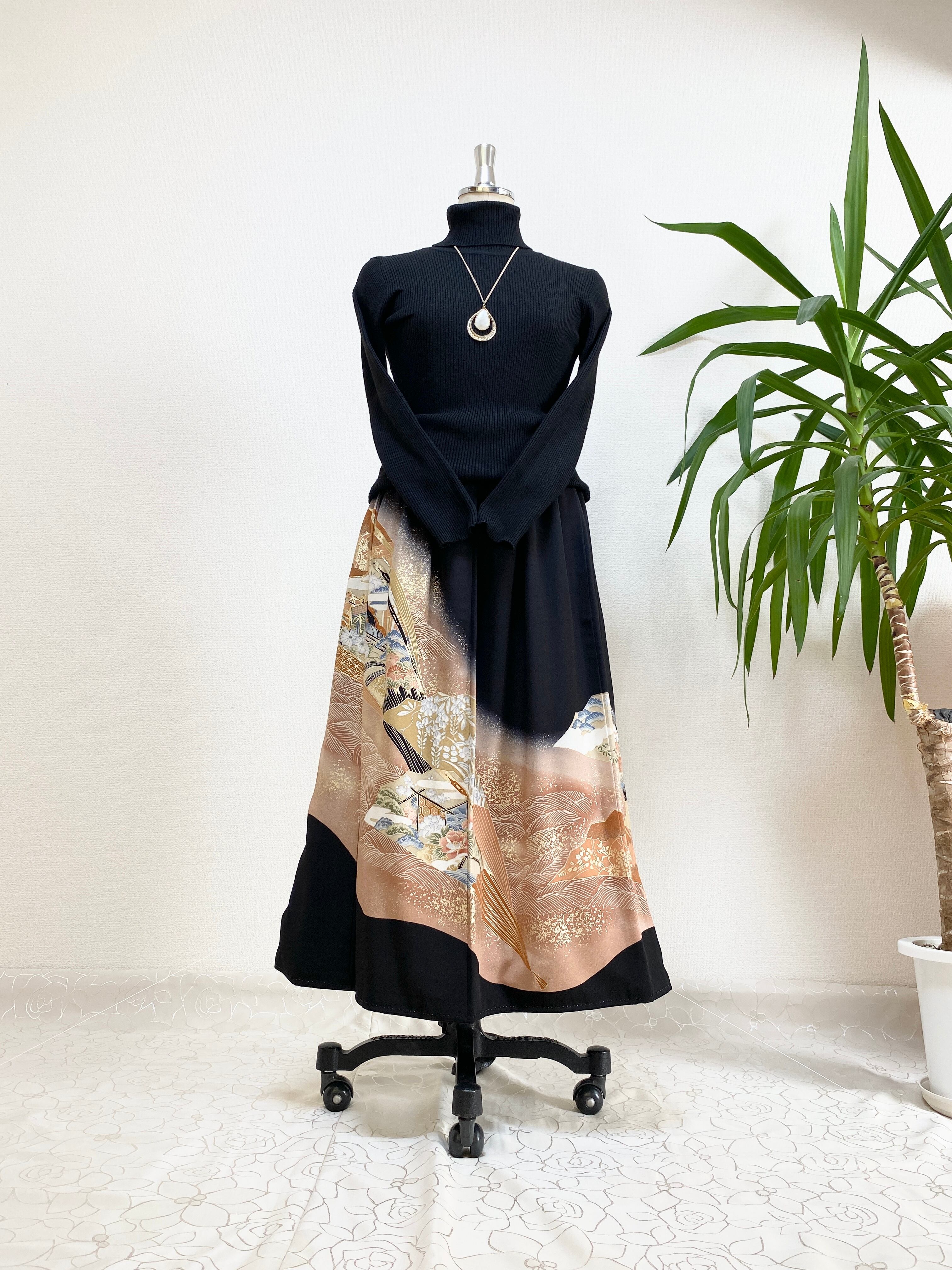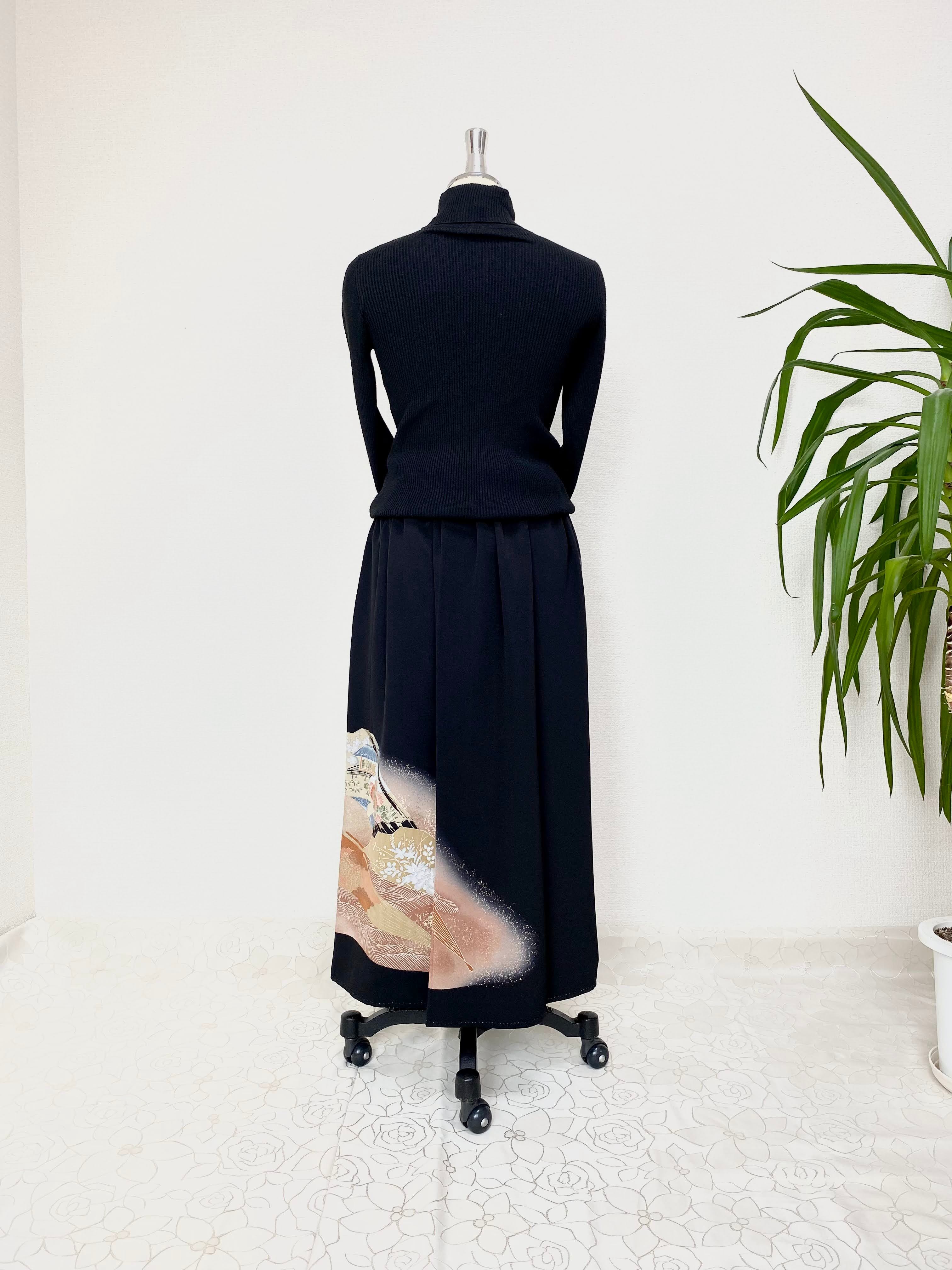 黒留袖着物リメイクウエストゴムスカート送料無料フリーサイズ1点物黒留袖着物リメイクウエストゴムスカートハンドメイド黒留袖着物リメイクスカート1点物NO.765