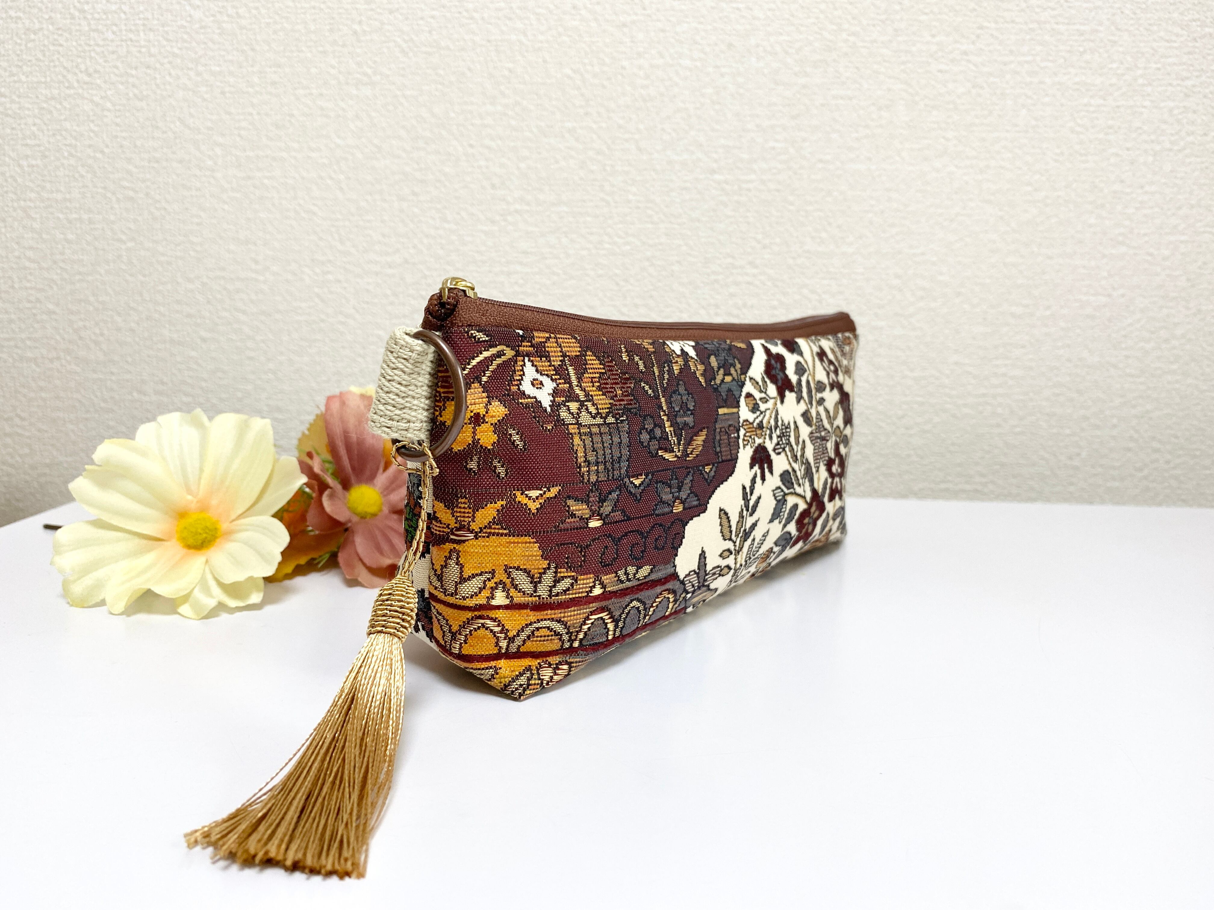 日本の古帯を再利用リメイクして作製したポーチでハンドメイド品です。帯リメイクポーチ化粧ポーチ大きめ。