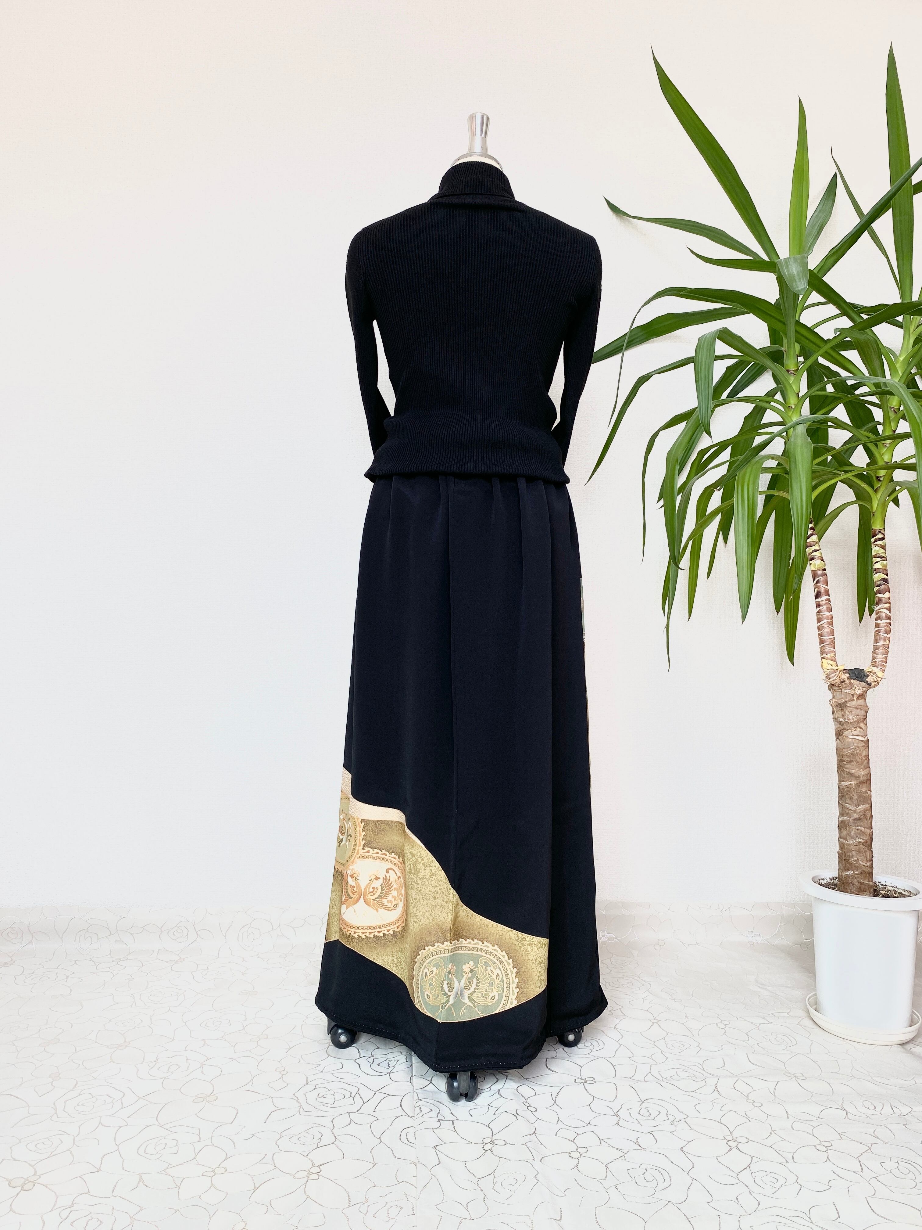 黒留袖着物リメイクウエストゴムスカート【超ロング丈】ロングスカート送料無料フリーサイズ1点物黒留袖着物リメイクウエストゴムスカート【超ロング丈】ロングスカートフリーサイズ黒留袖着物リメイクスカート1点物NO.844