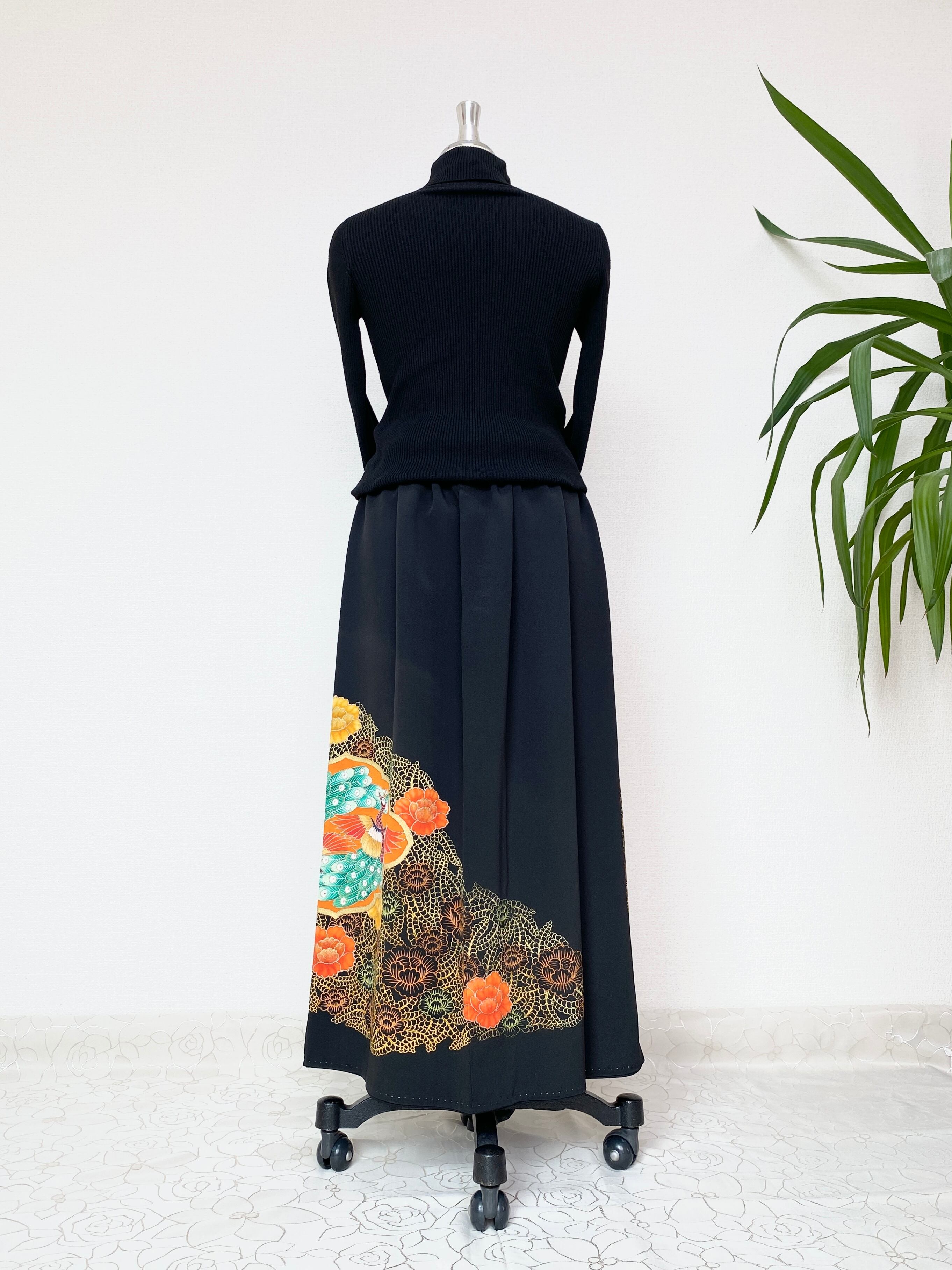 黒留袖着物リメイクウエストゴムスカート送料無料フリーサイズ1点物黒留袖着物リメイクウエストゴムスカートハンドメイド黒留袖着物リメイクスカート1点物NO.854