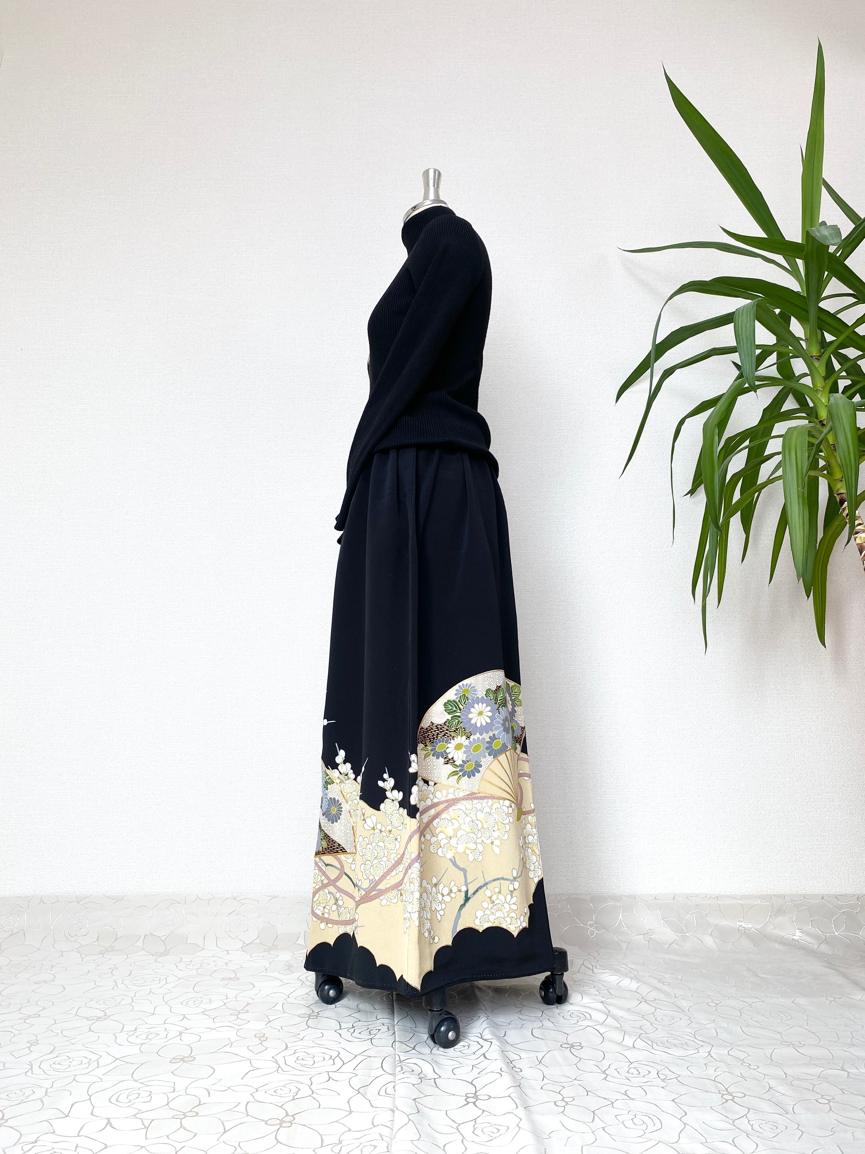 黒留袖着物をリメイクして作製したウエストゴムギャザードレススカートフリーサイズ【超ロング丈】です。