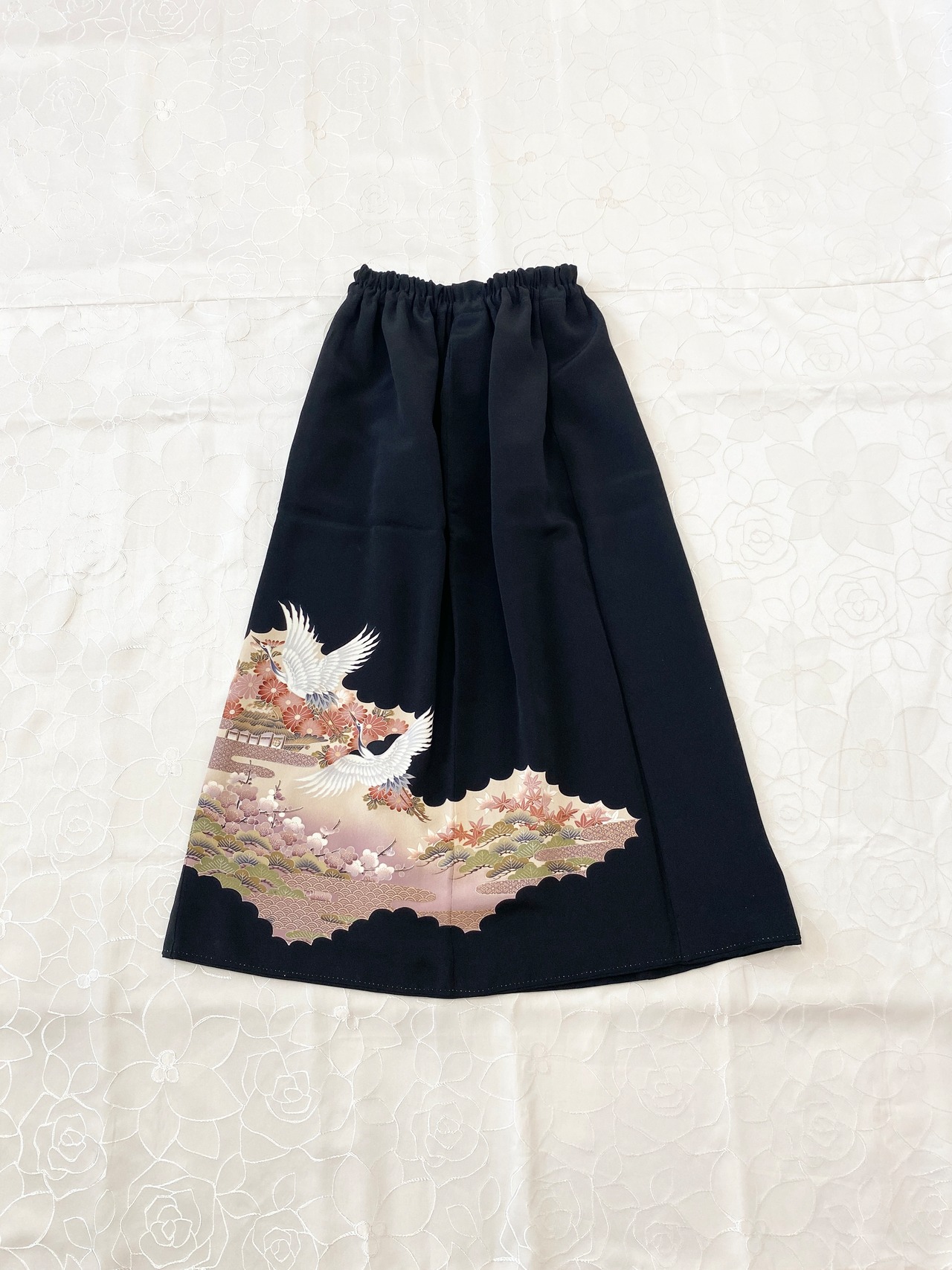 黒留袖着物をリメイクして作製したウエストゴムスカートフリーサイズ【おチビさん用】です。