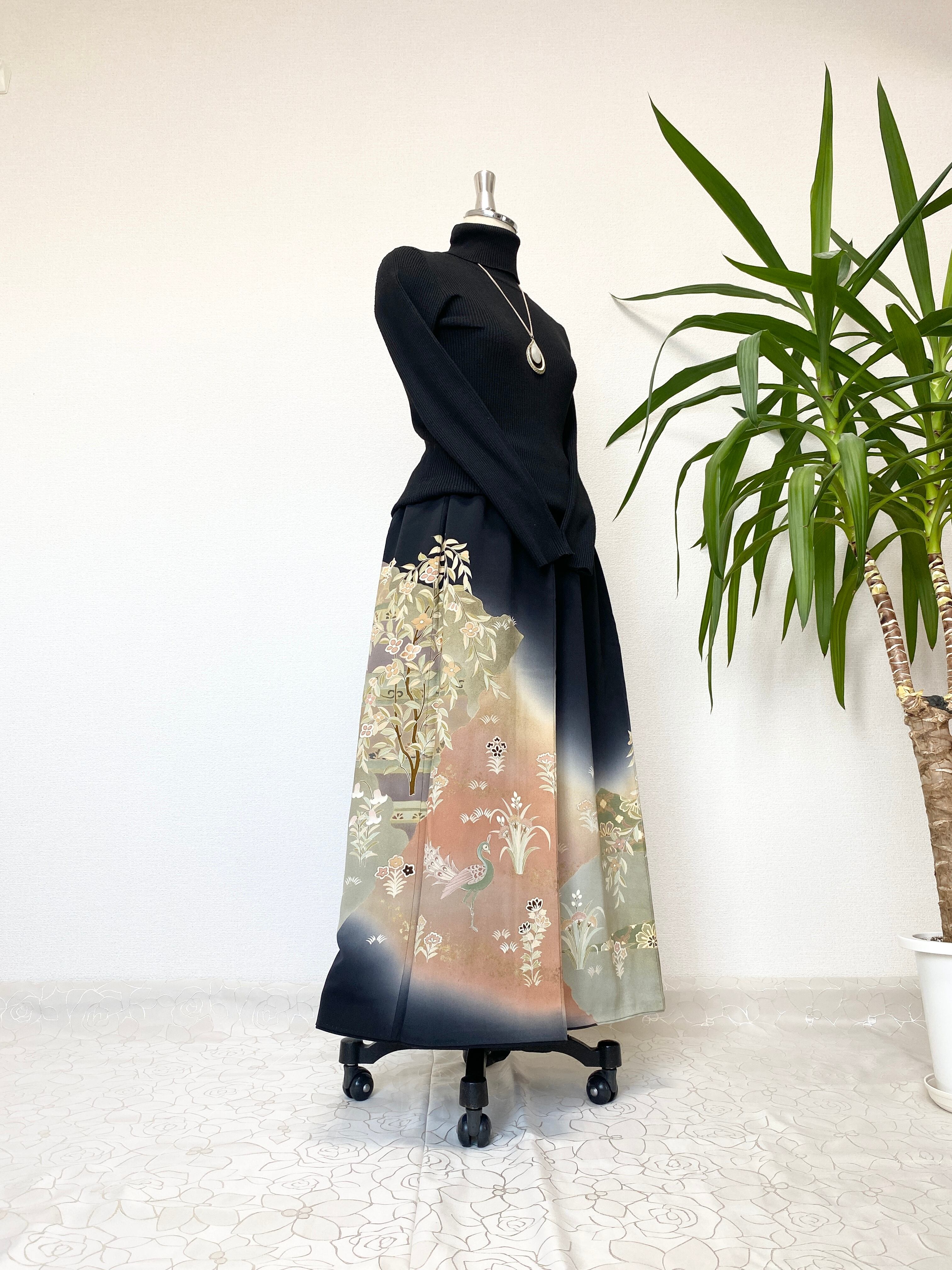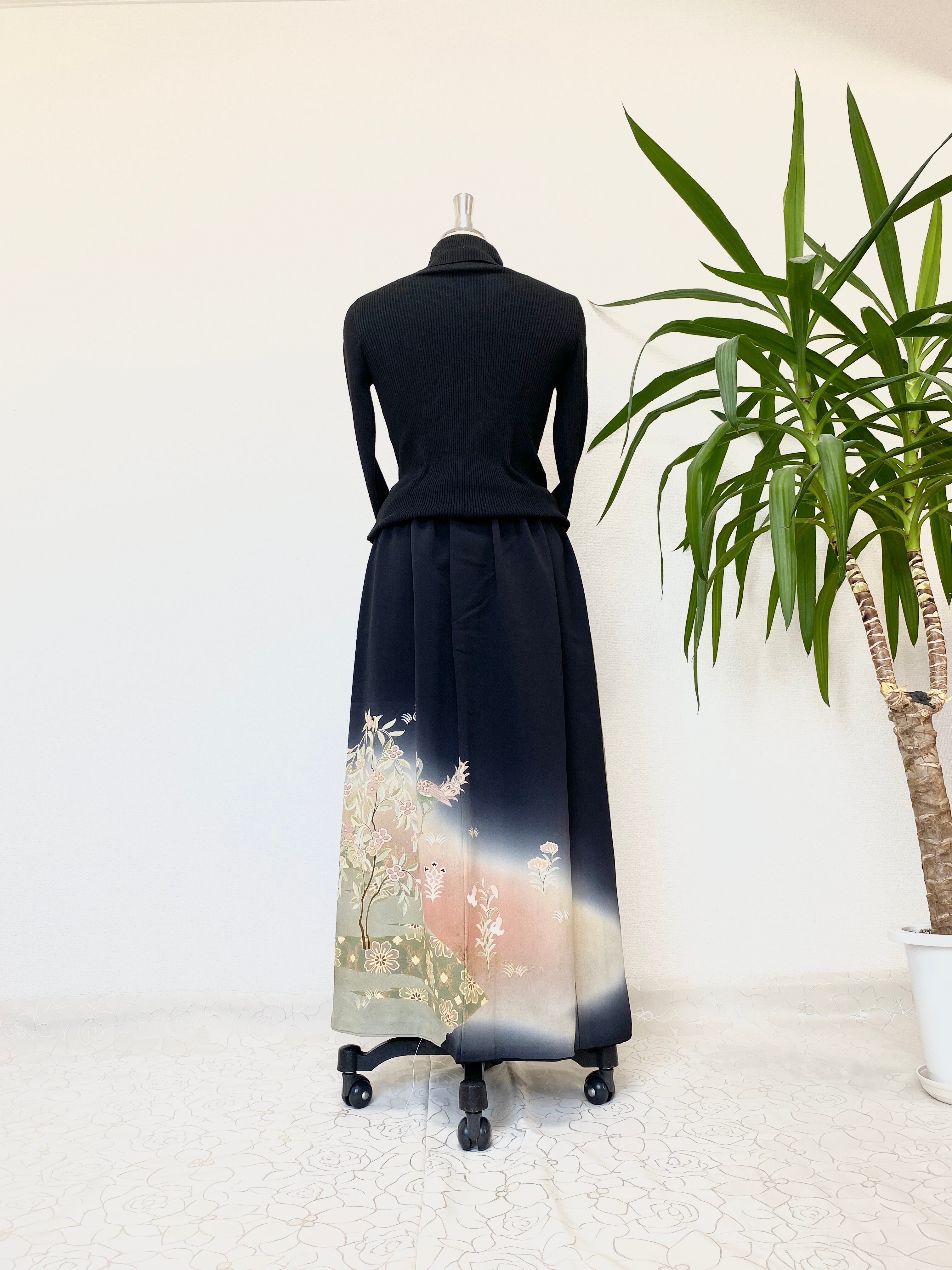 黒留袖着物リメイクウエストゴムスカート送料無料フリーサイズ1点物黒留袖着物リメイクウエストゴムスカートハンドメイド黒留袖着物リメイクスカート1点物NO.872