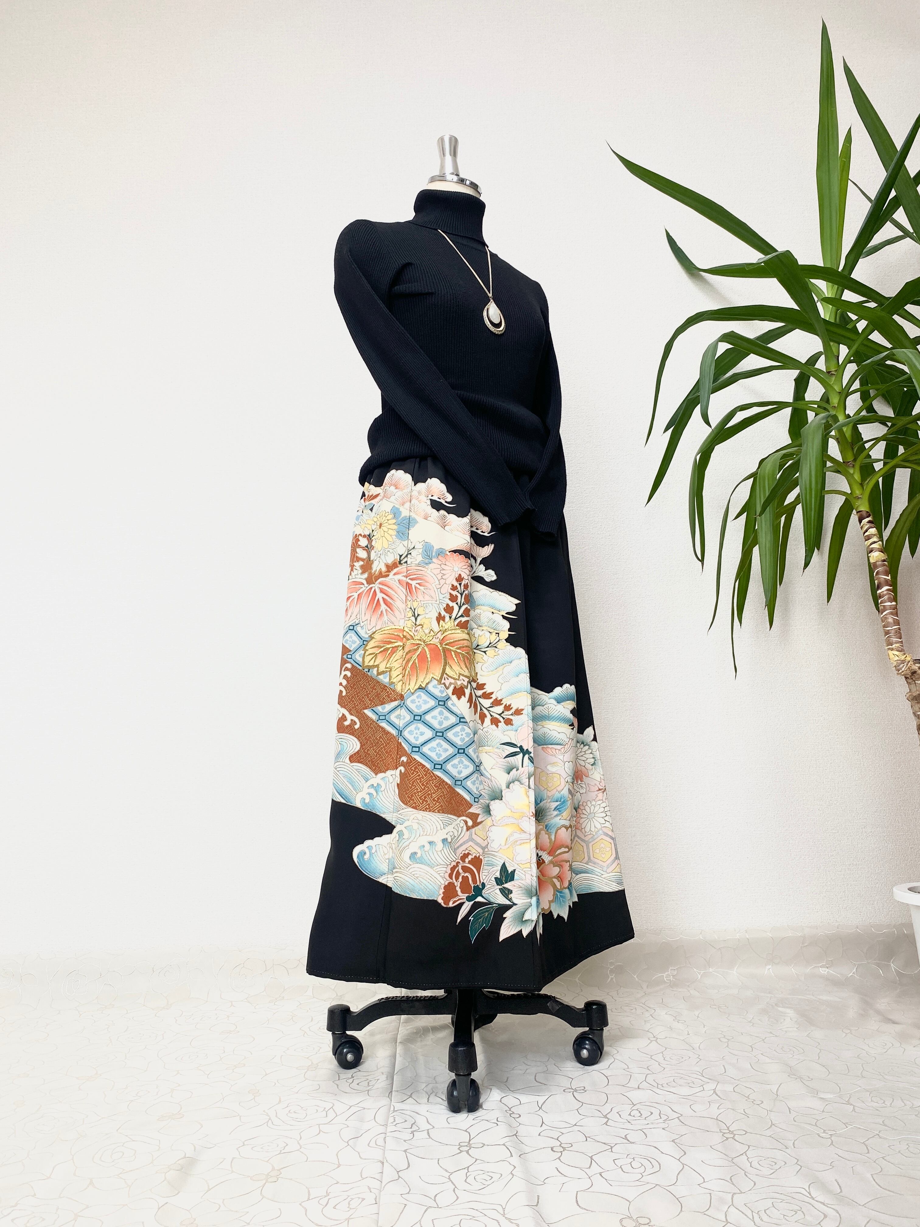 黒留袖着物リメイクウエストゴムスカート送料無料フリーサイズ1点物黒留袖着物リメイクウエストゴムスカートハンドメイド黒留袖着物リメイクスカート1点物NO.876
