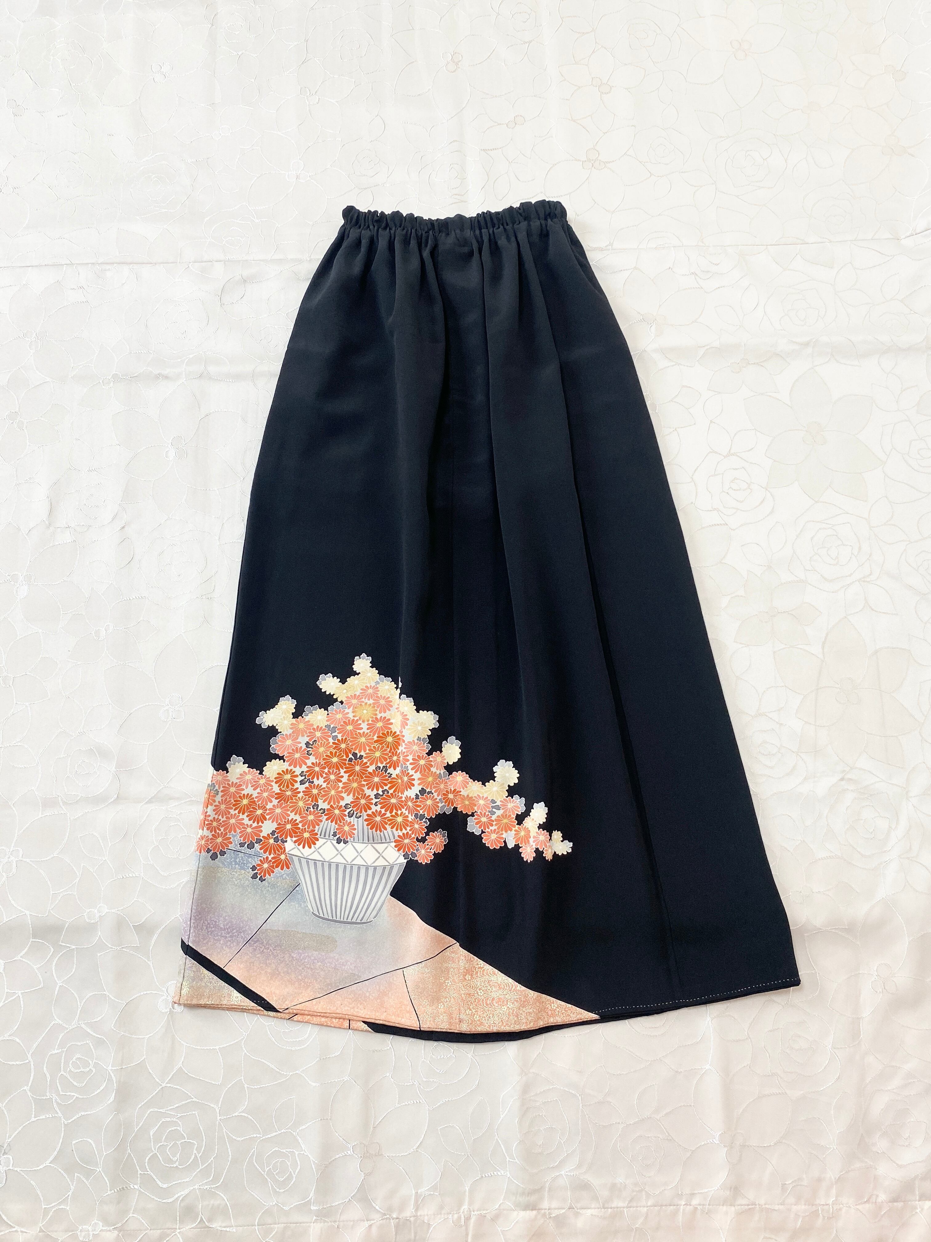 黒留袖着物をリメイクして作製したウエストゴムギャザードレススカートフリーサイズ【超ロング丈】です。