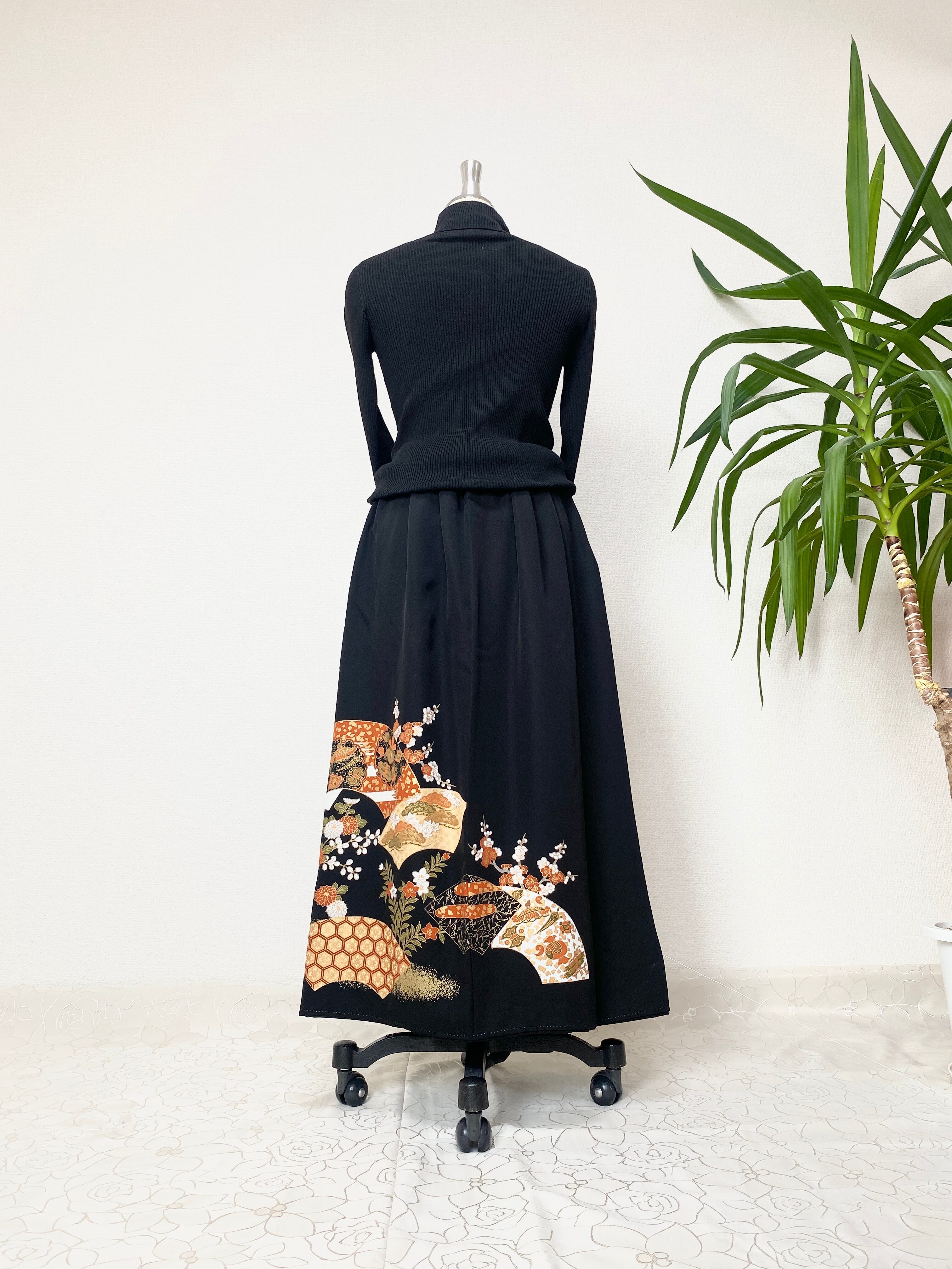 黒留袖着物リメイクウエストゴムスカート送料無料フリーサイズ1点物黒留袖着物リメイクウエストゴムスカートハンドメイド黒留袖着物リメイクスカート1点物NO.883