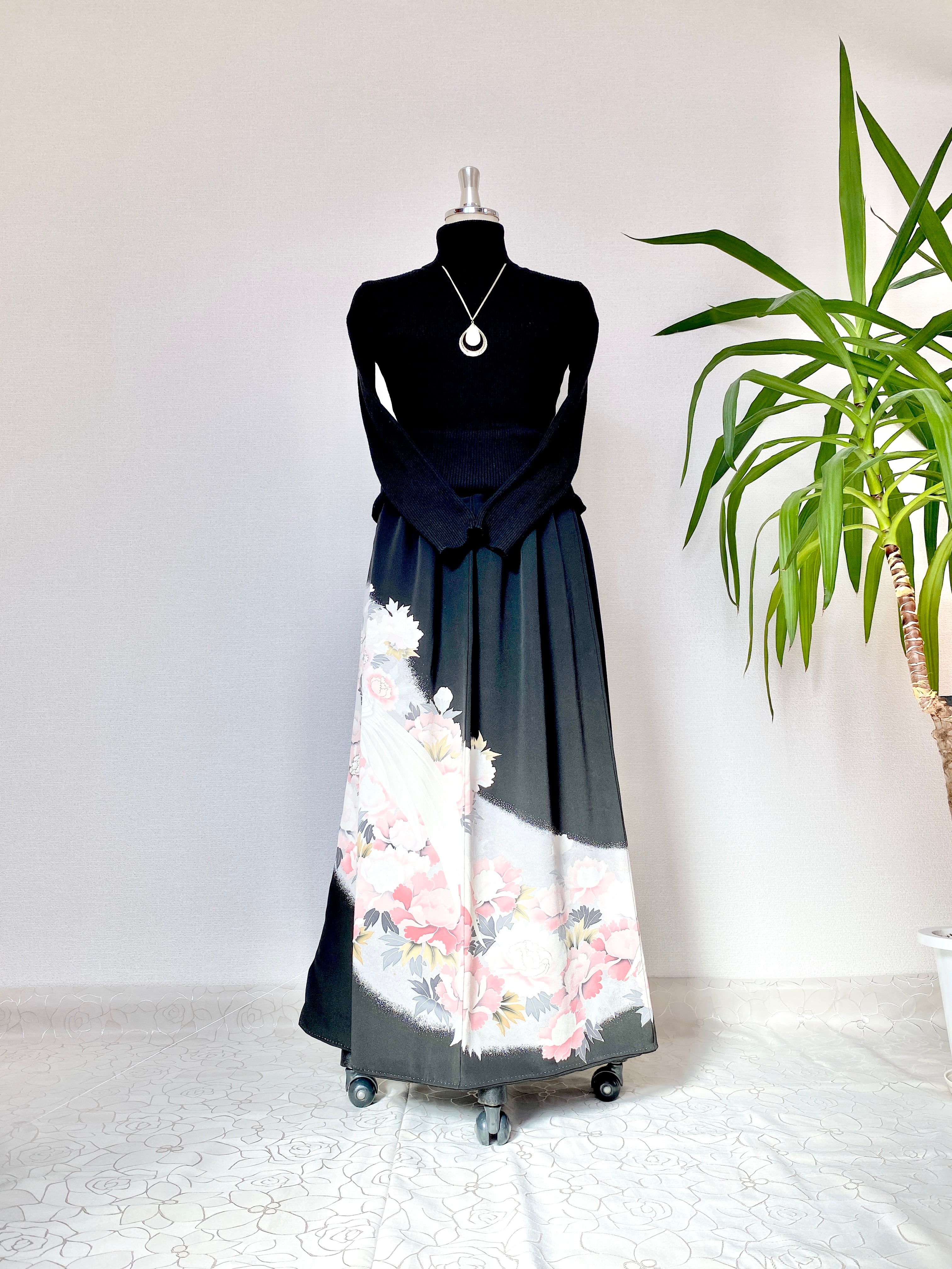 黒留袖着物リメイクウエストゴムスカート【超ロング丈】ロングスカート送料無料フリーサイズ1点物黒留袖着物リメイクウエストゴムスカート【超ロング丈】ロングスカートフリーサイズ黒留袖着物リメイクスカート1点物NO.886