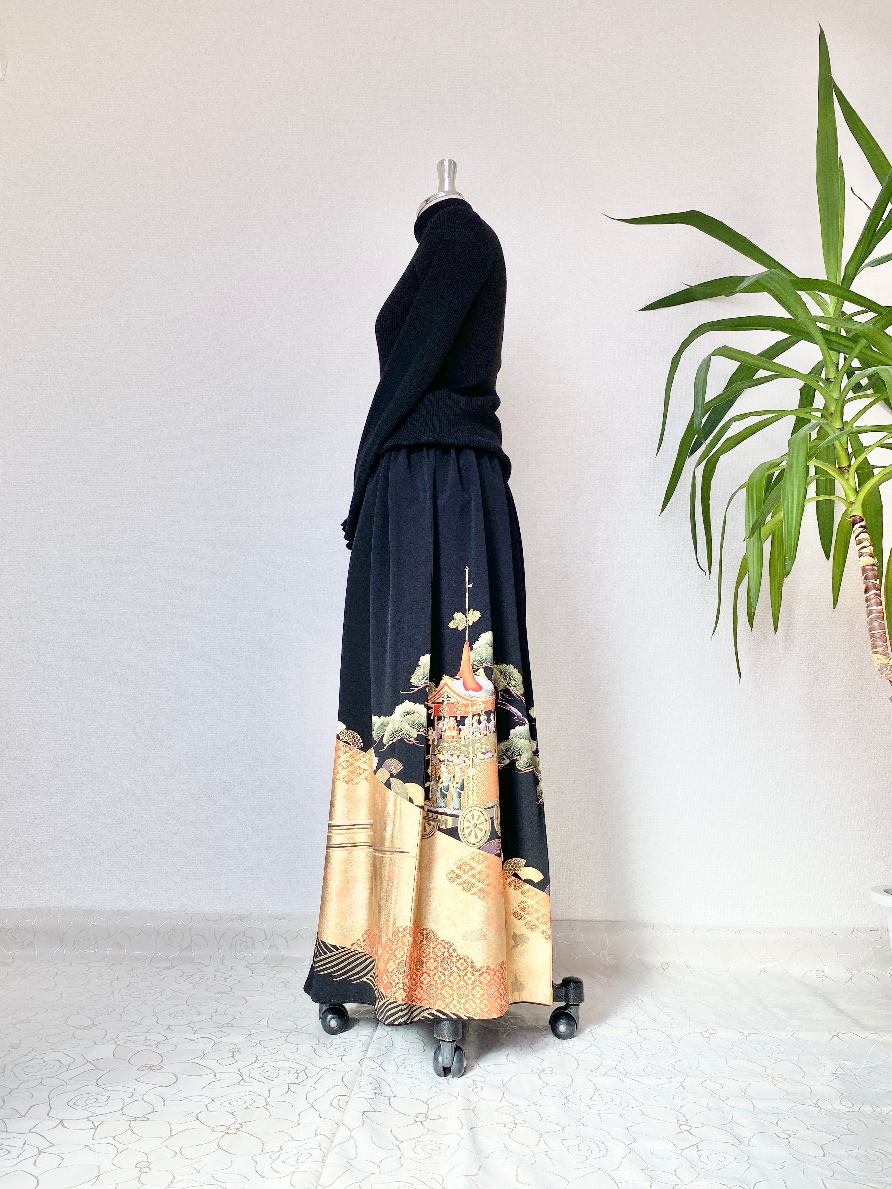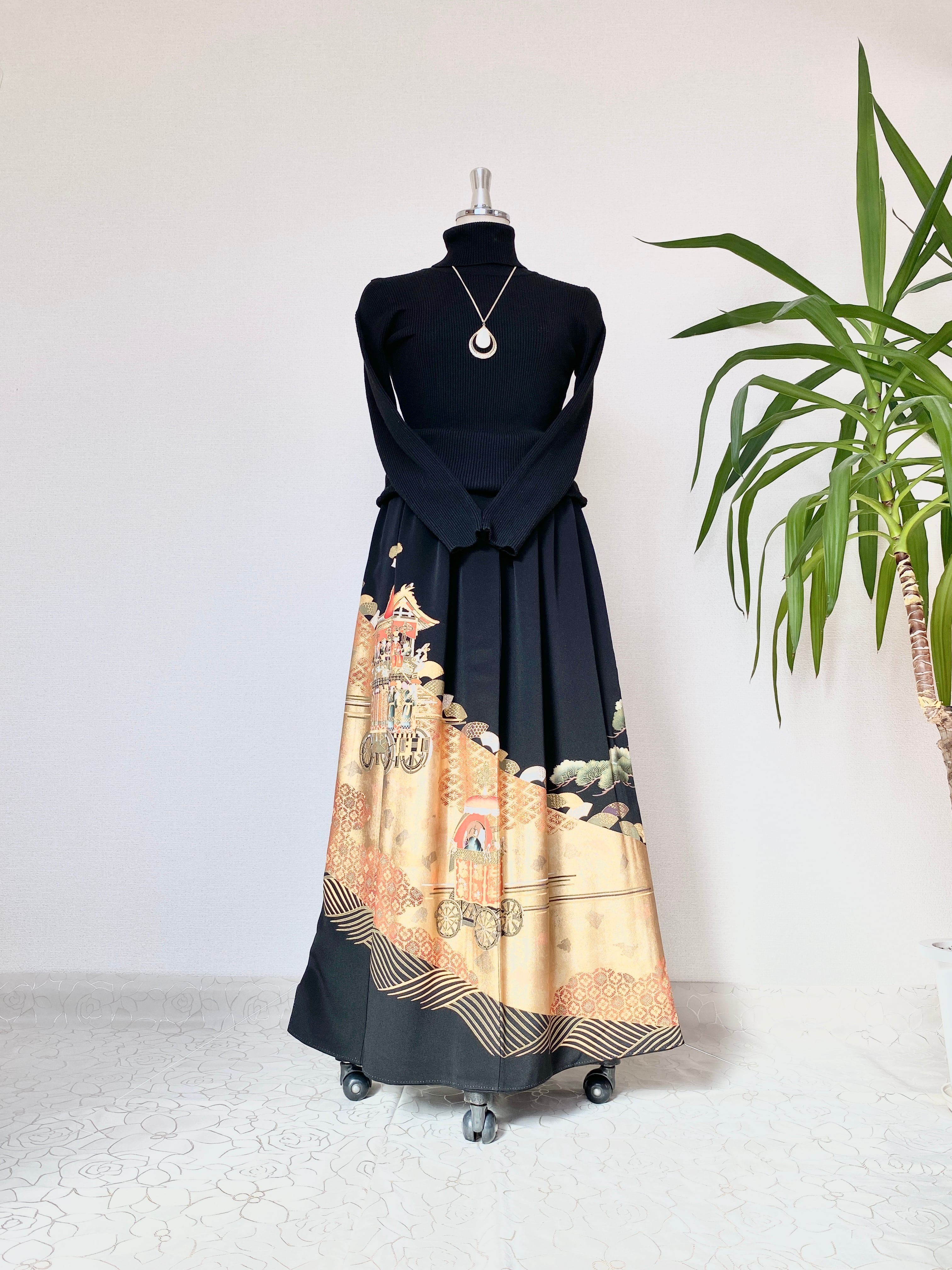 黒留袖着物リメイクウエストゴムスカート【超ロング丈】ロングスカート送料無料フリーサイズ1点物黒留袖着物リメイクウエストゴムスカート【超ロング丈】ロングスカートフリーサイズ黒留袖着物リメイクスカート1点物NO.888