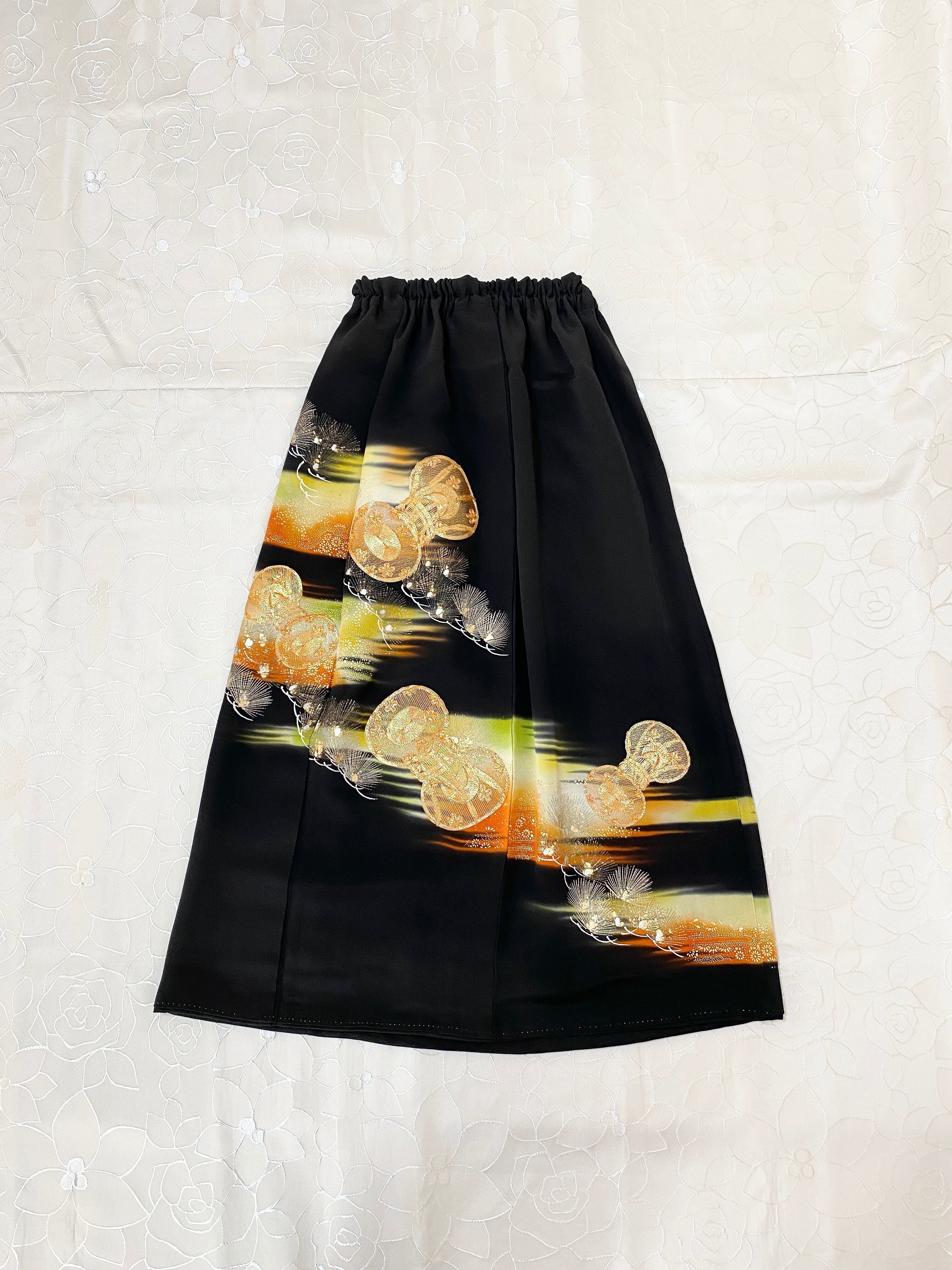 黒留袖着物リメイクウエストゴムロングスカート送料無料フリーサイズ1点物黒留袖着物リメイクウエストゴムロングスカートハンドメイド黒留袖着物リメイクロングスカート1点物NO.906
