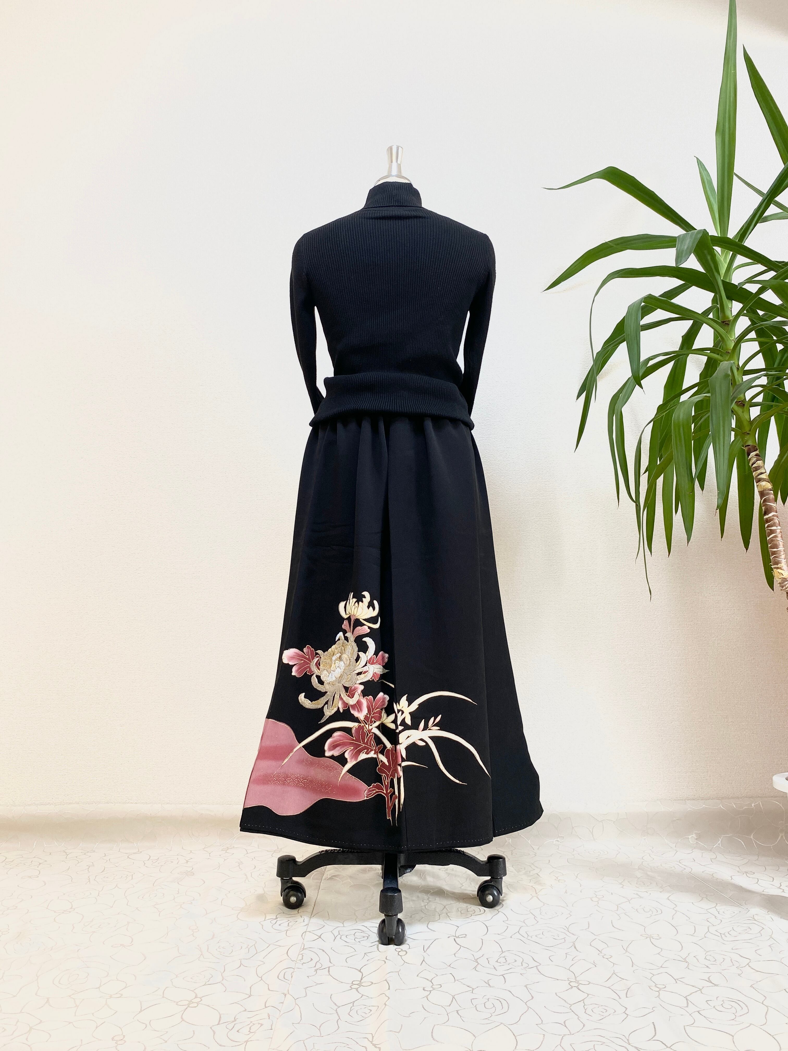 黒留袖着物リメイクウエストゴムロングスカート送料無料フリーサイズ1点物黒留袖着物リメイクウエストゴムロングスカートハンドメイド黒留袖着物リメイクロングスカート1点物NO.922