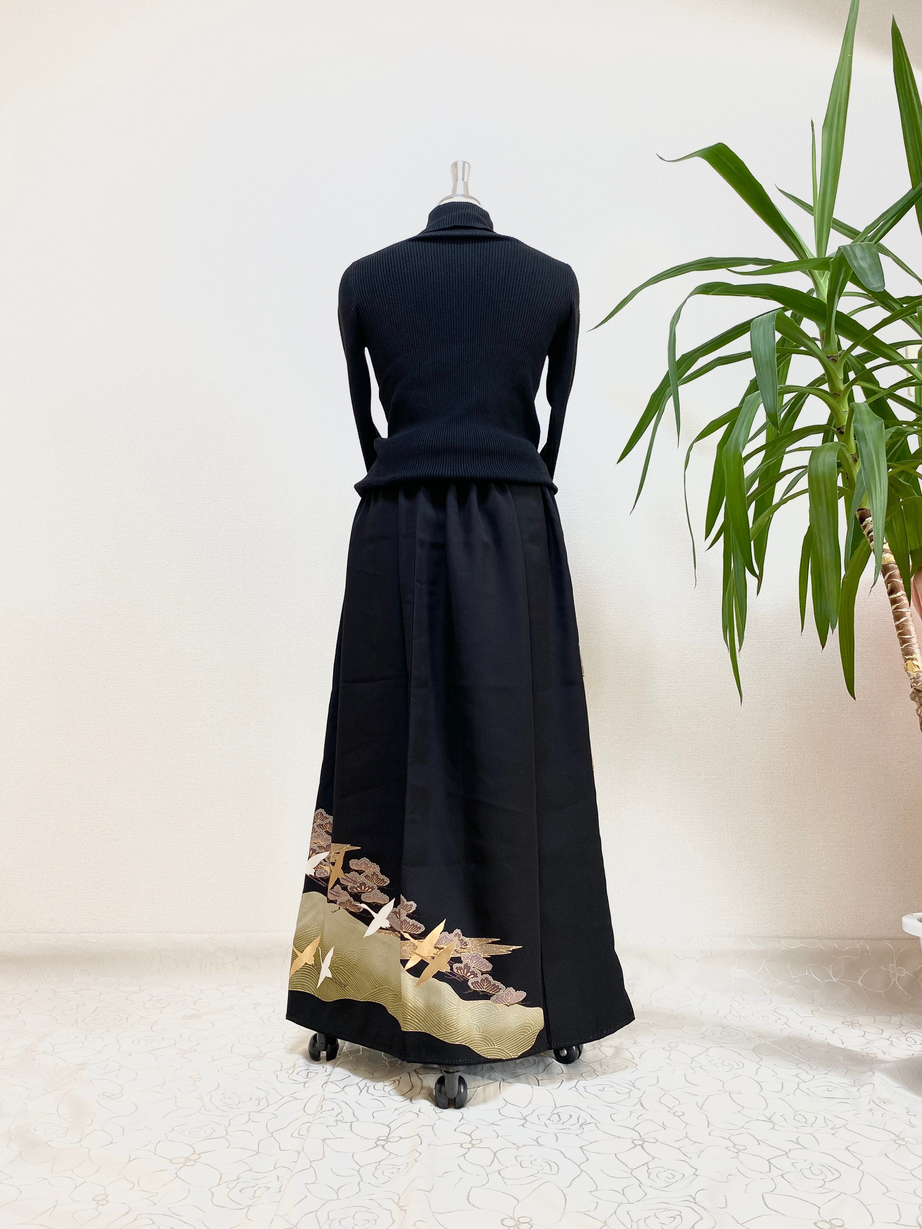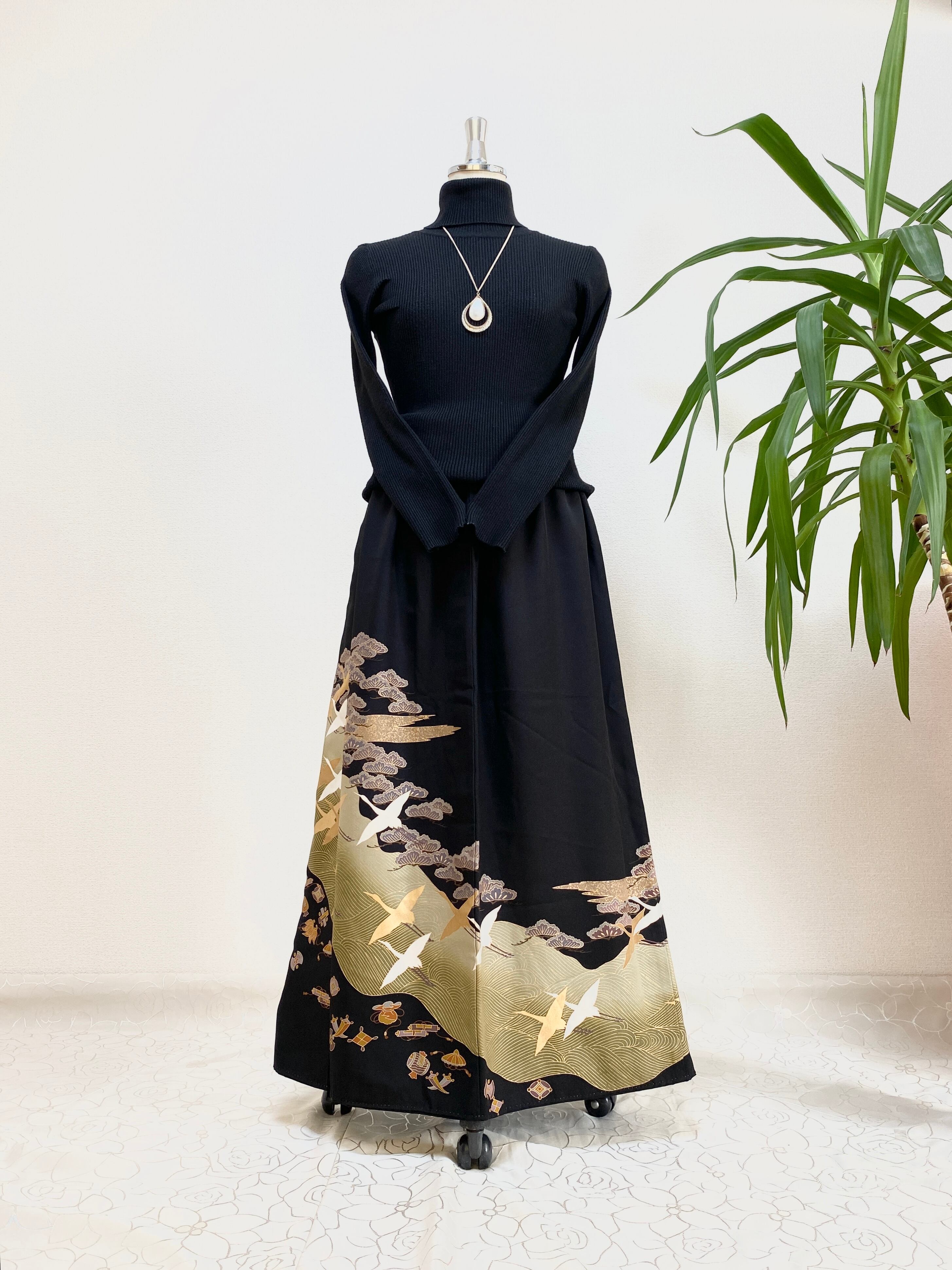 黒留袖着物リメイクウエストゴムロングドレススカートフリーサイズ【超ロング丈】