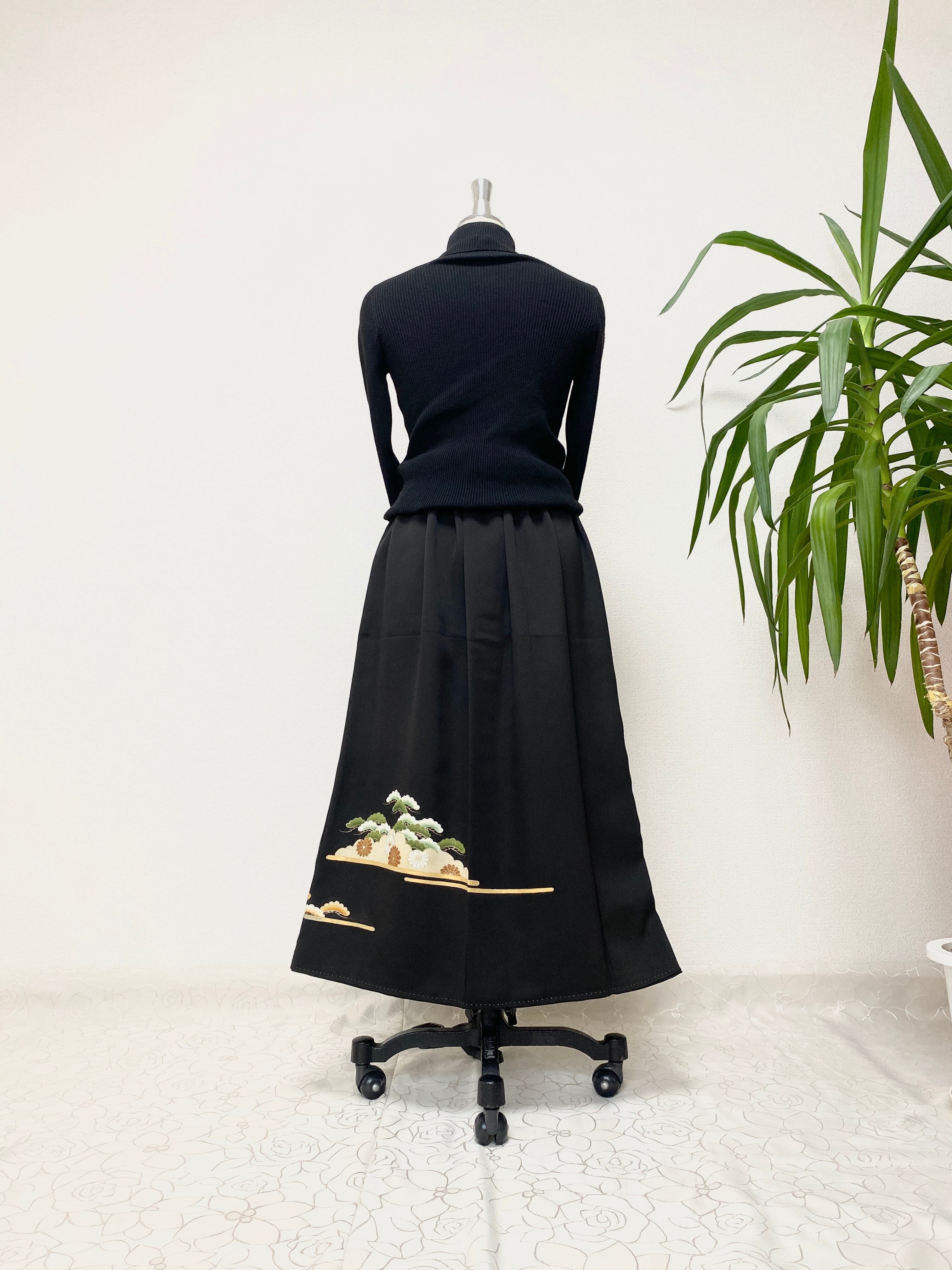 黒留袖着物リメイクウエストゴムロングスカート送料無料フリーサイズ1点物黒留袖着物リメイクウエストゴムロングスカートハンドメイド黒留袖着物リメイクロングスカート1点物NO.972