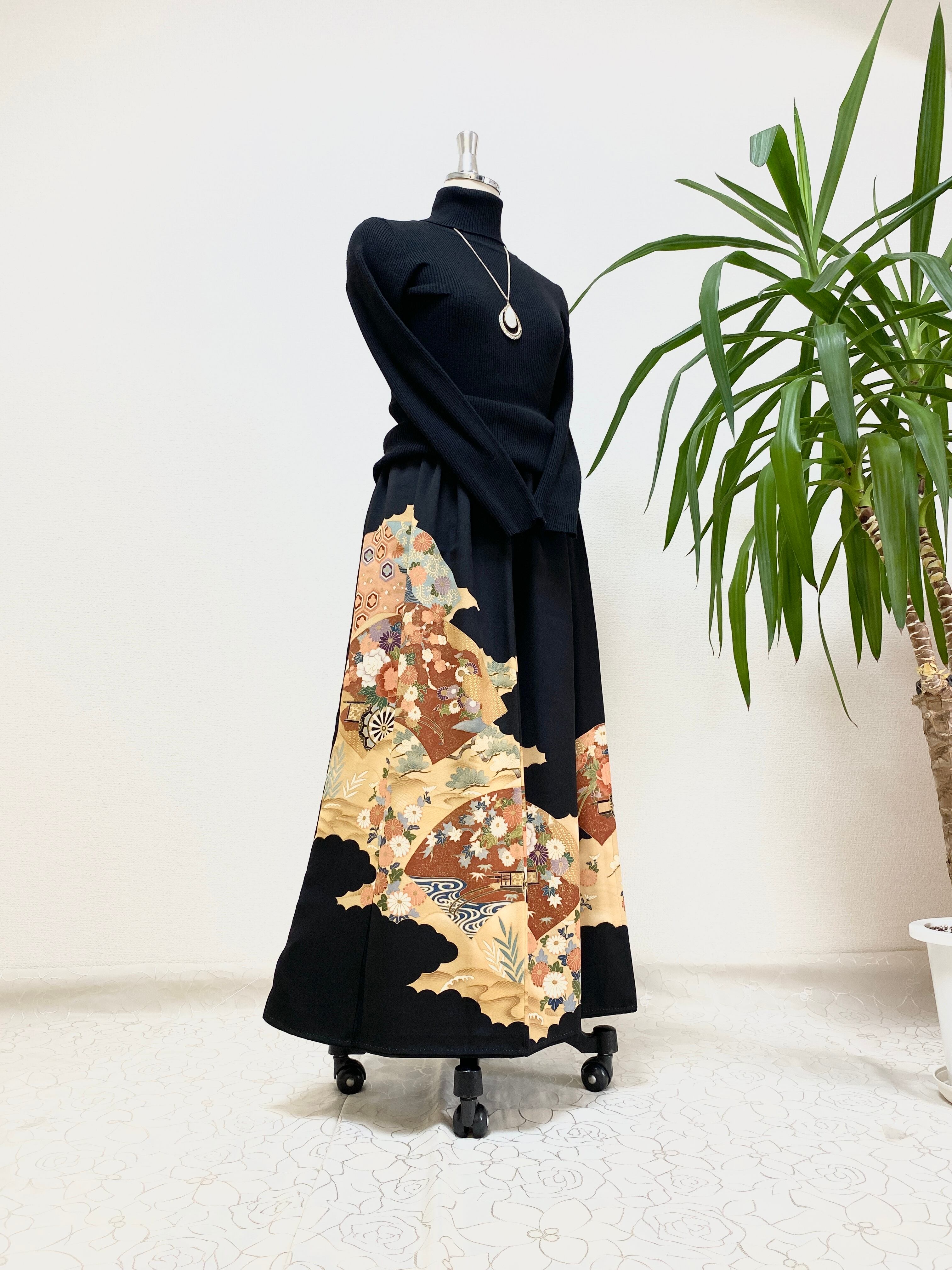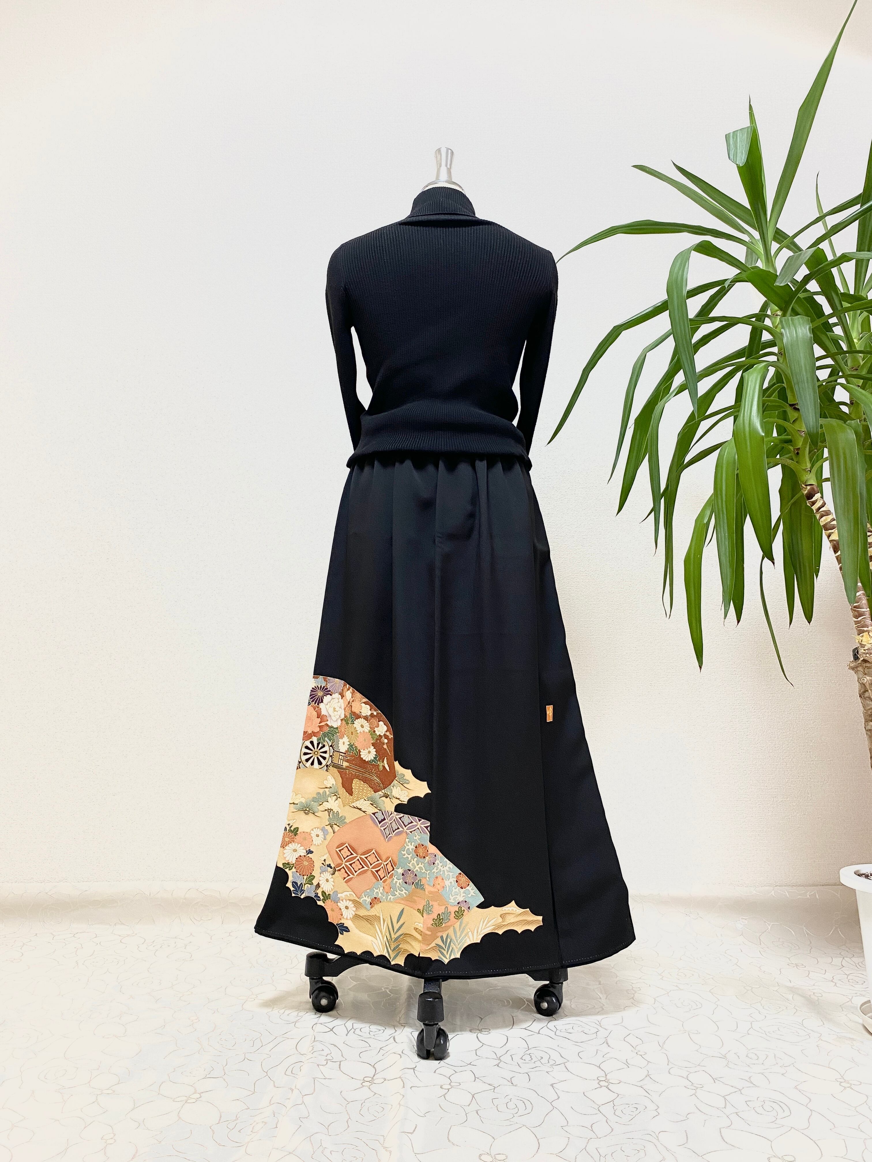 黒留袖着物リメイクウエストゴムロングスカート送料無料フリーサイズ1点物黒留袖着物リメイクウエストゴムロングスカートハンドメイド黒留袖着物リメイクロングスカート1点物NO.986