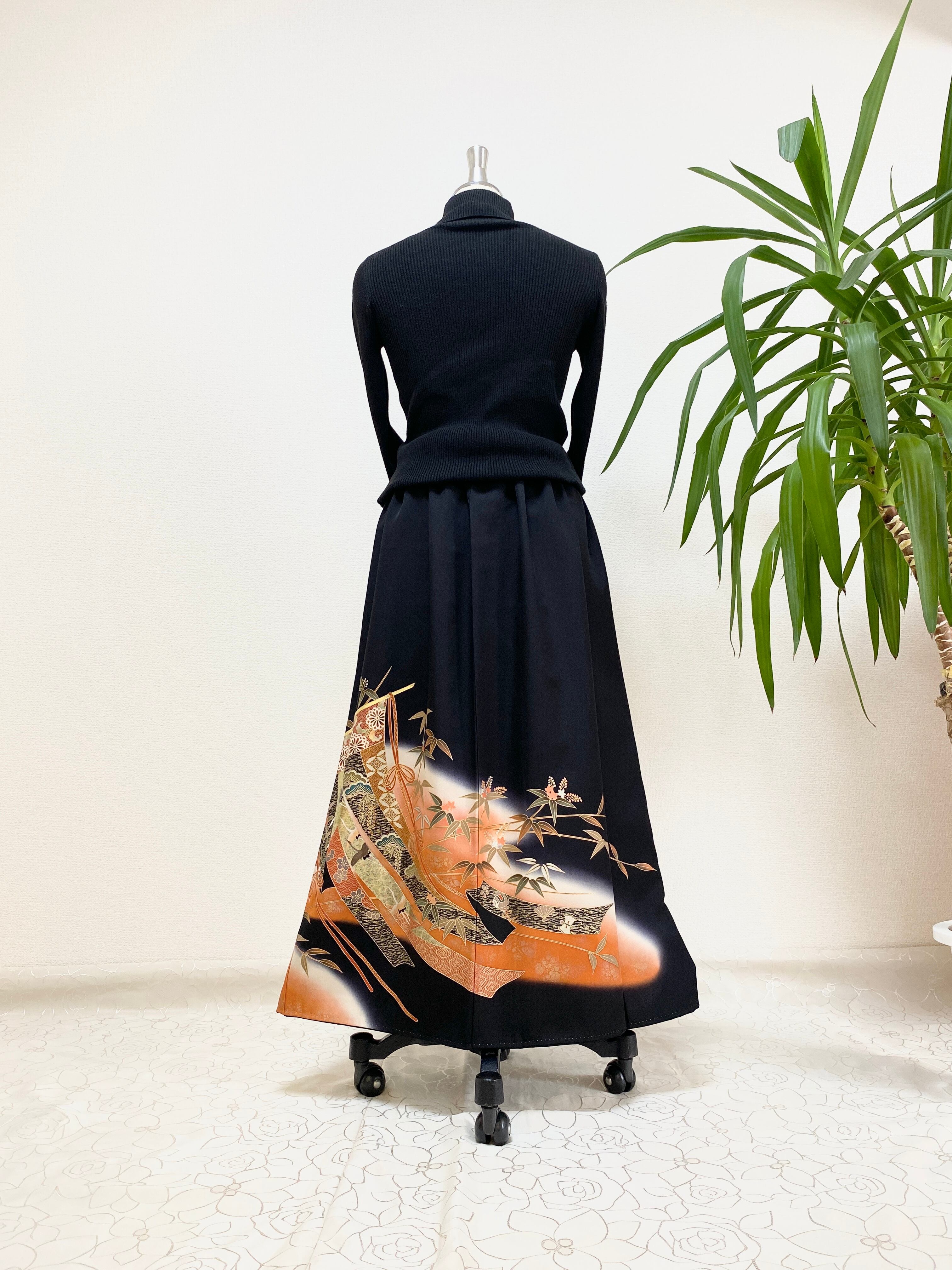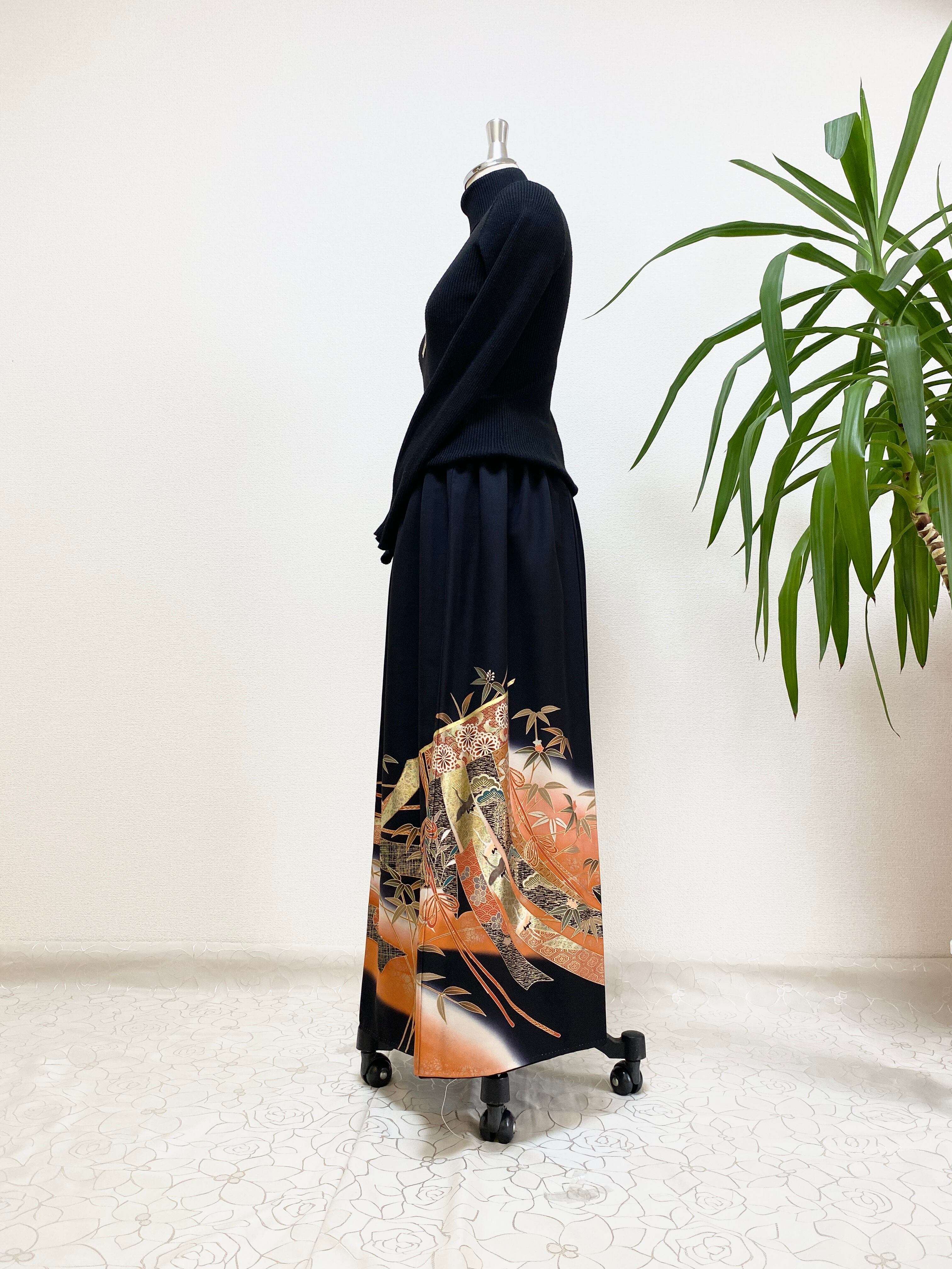 黒留袖着物リメイクウエストゴムロングスカートフリーサイズ