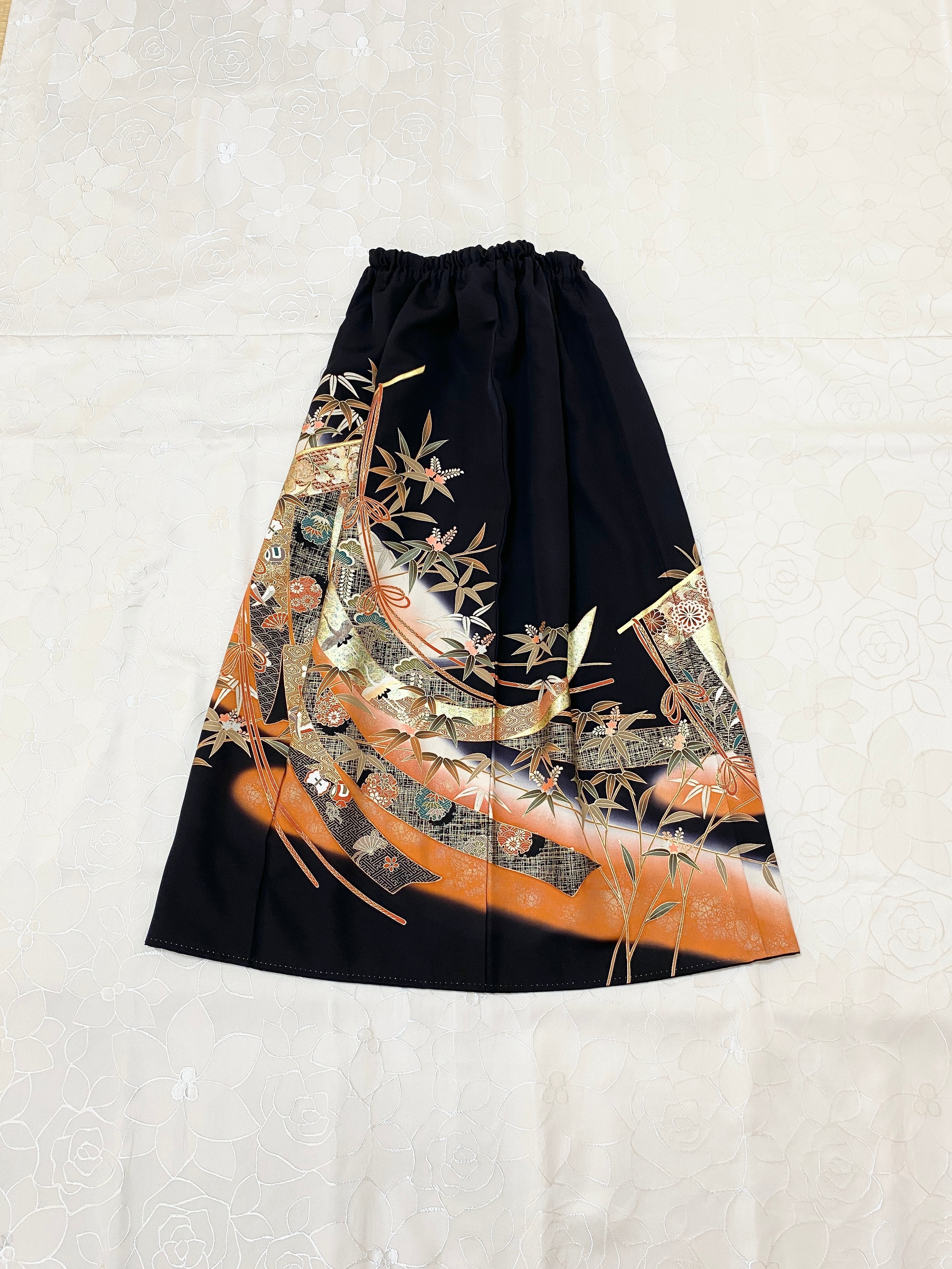 黒留袖着物をリメイクして作製したウエストゴムロングドレススカートフリーサイズです。
