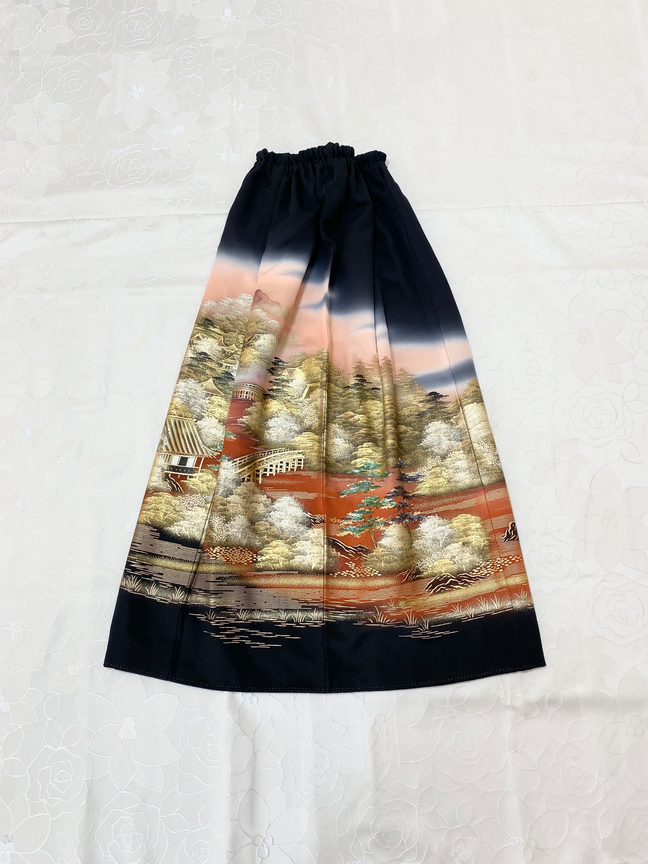 黒留袖着物をリメイクして作製したウエストゴムロングドレススカートフリーサイズ【超ロング丈】です。