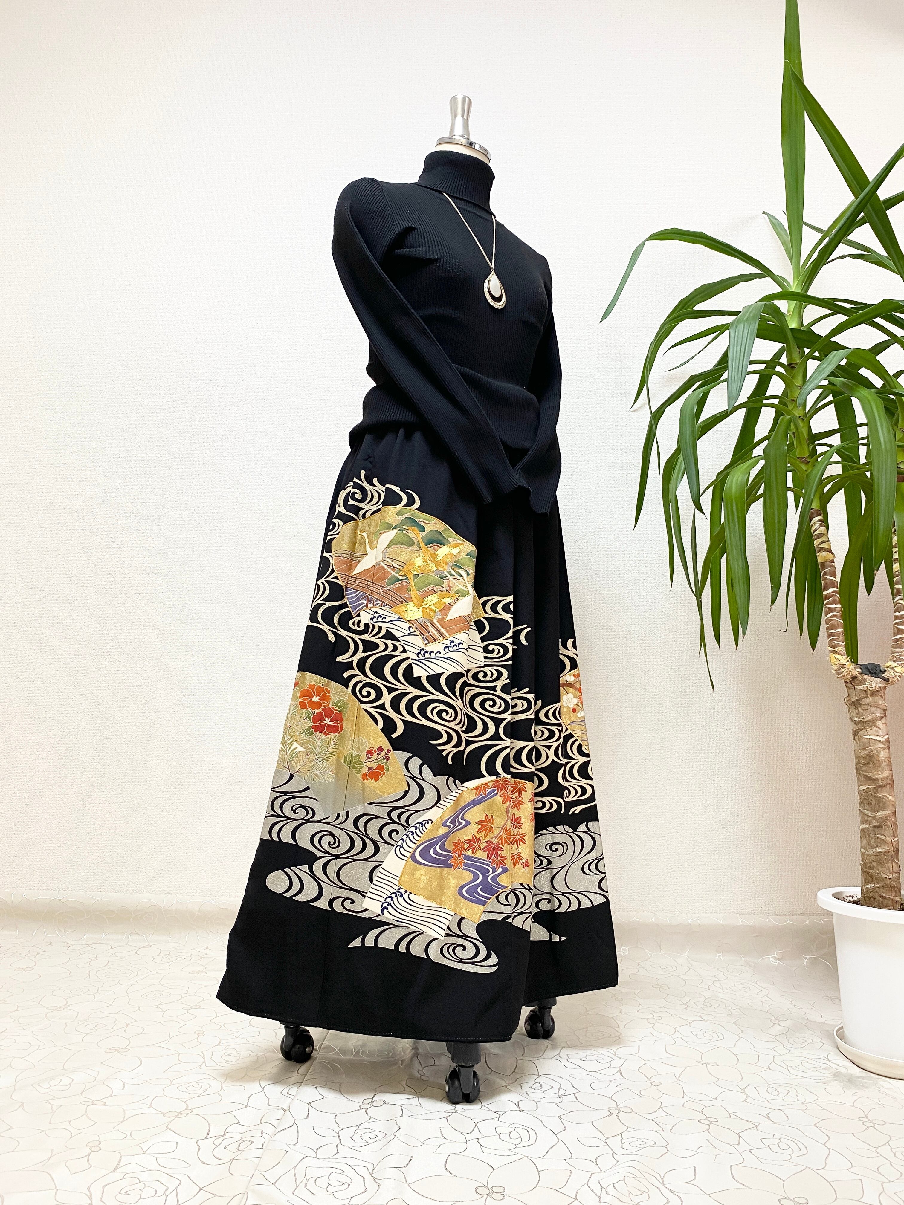 黒留袖着物リメイクウエストゴムロングスカート送料無料フリーサイズ1点物黒留袖着物リメイクウエストゴムロングスカートハンドメイド黒留袖着物リメイクロングスカート1点物NO.1039