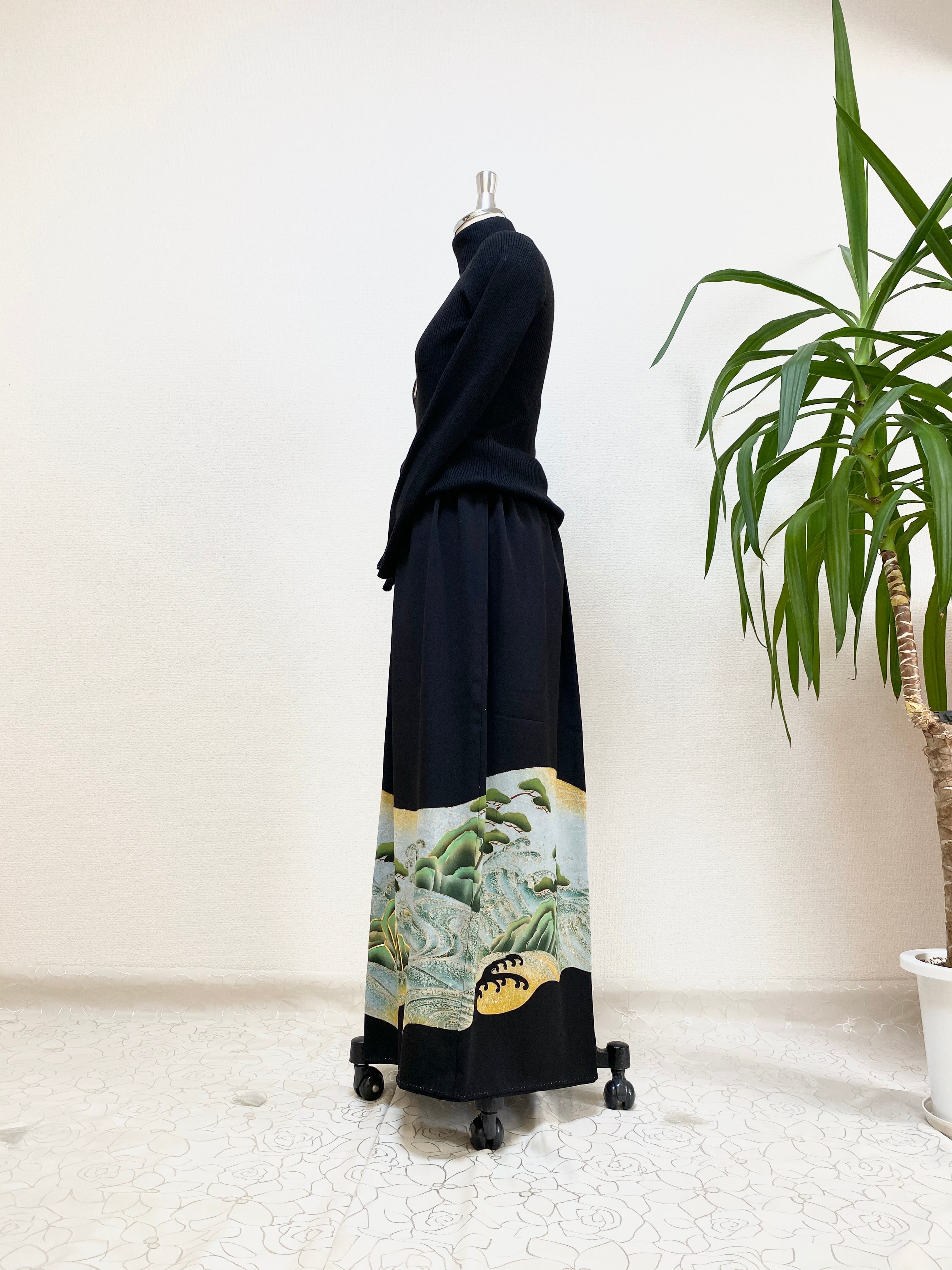 黒留袖着物リメイクウエストゴムロングドレススカートフリーサイズ【超ロング丈】