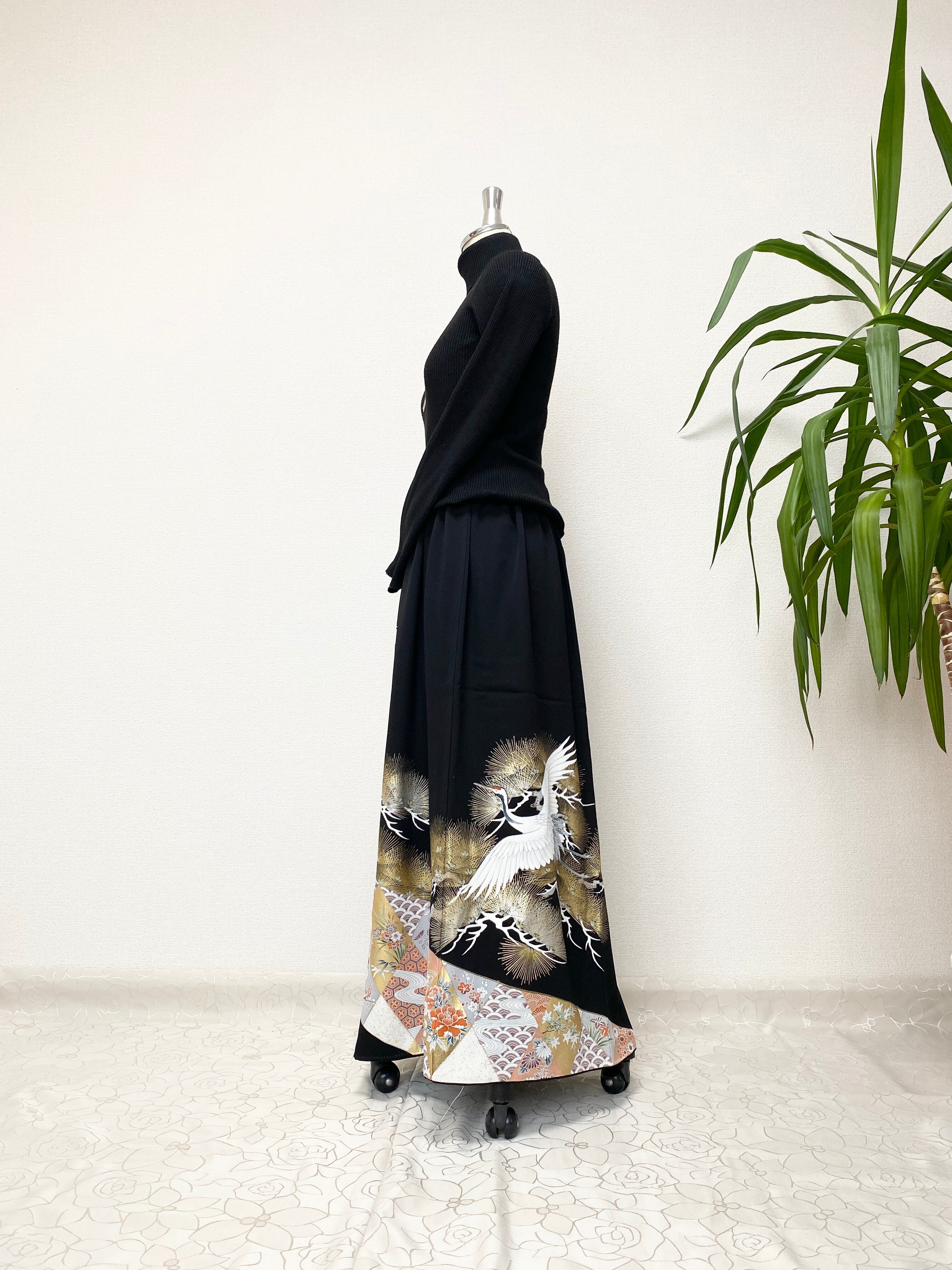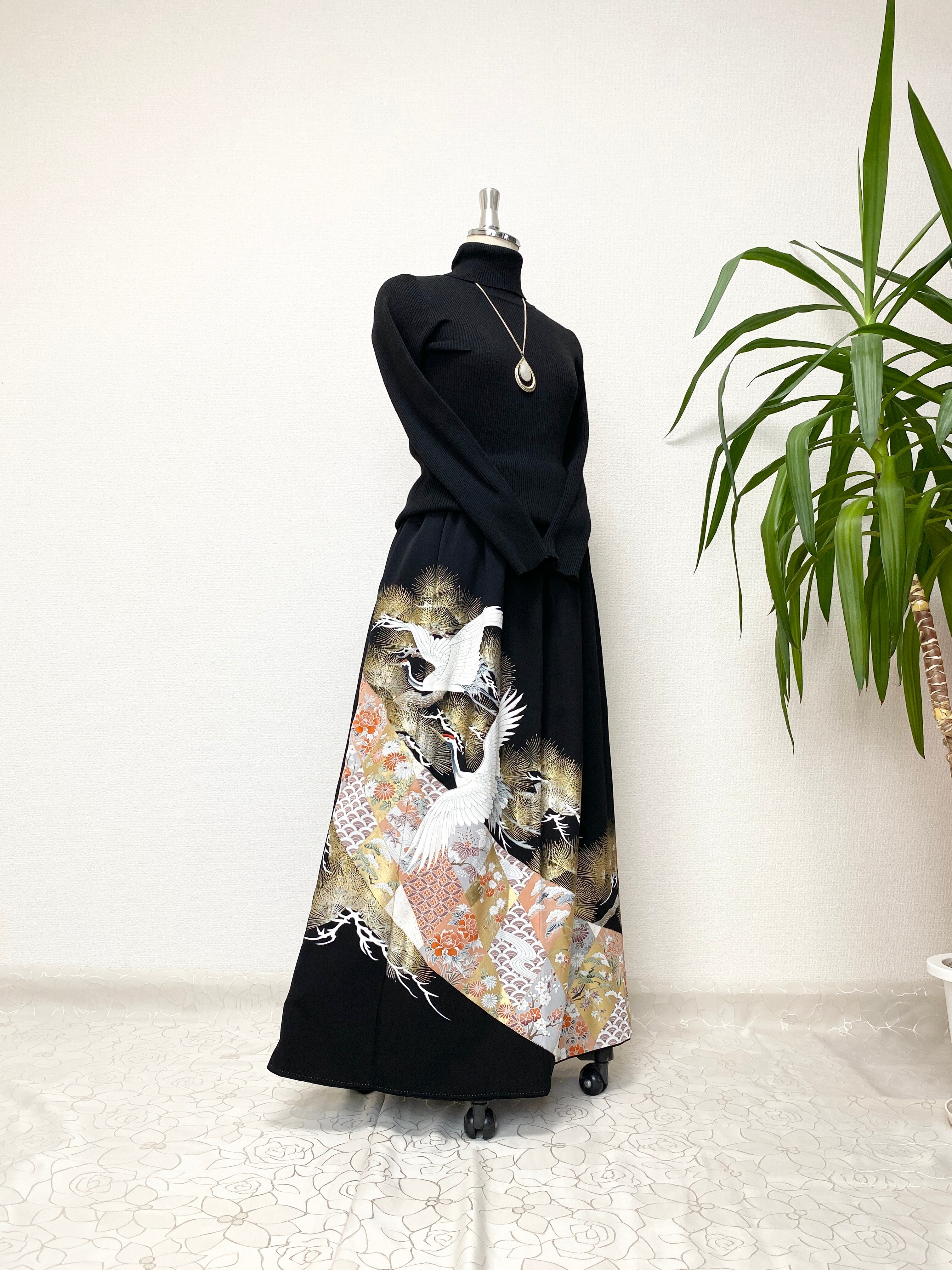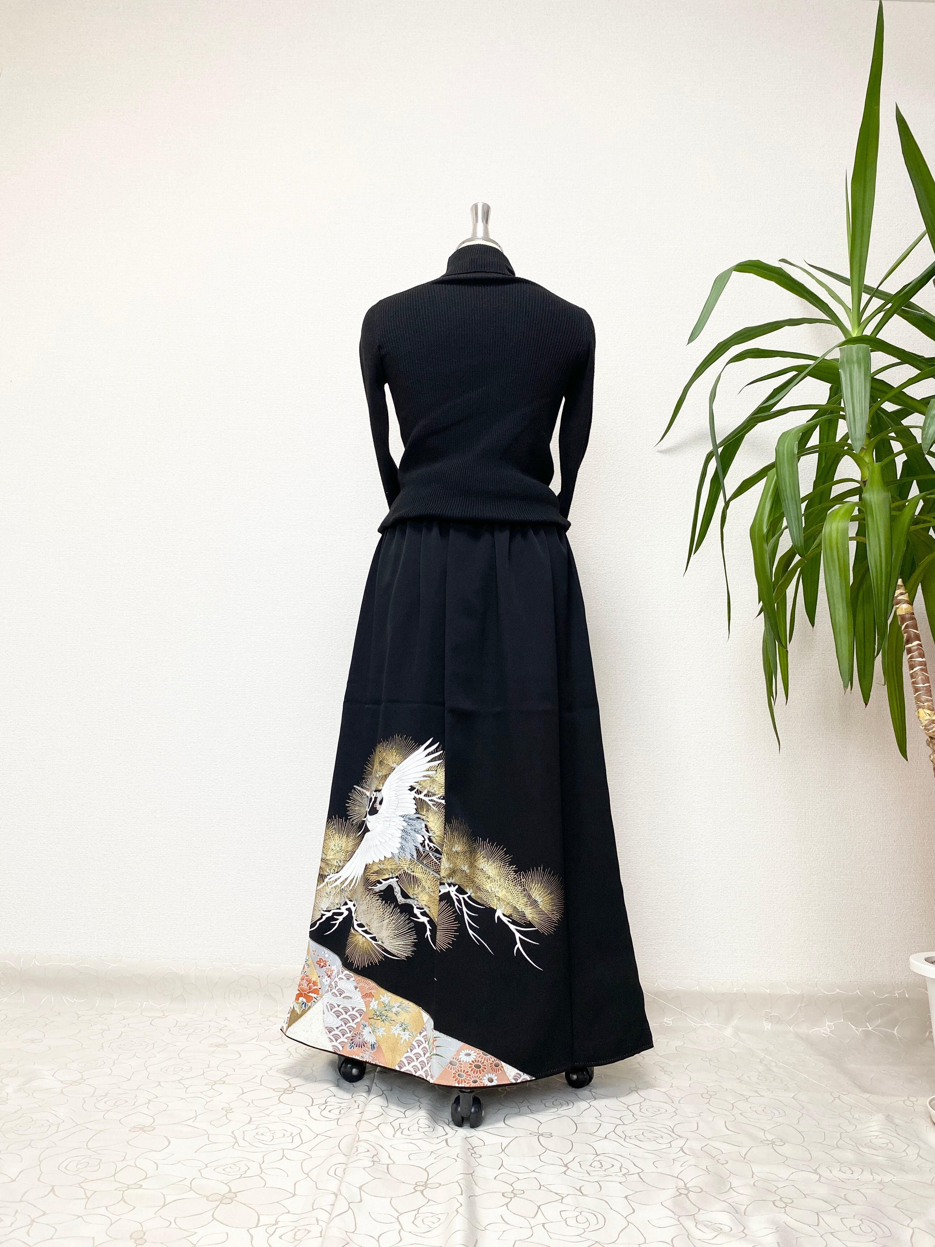 黒留袖着物リメイクウエストゴムロングドレススカートフリーサイズ【超ロング丈】
